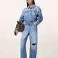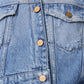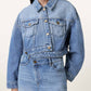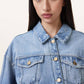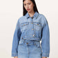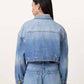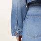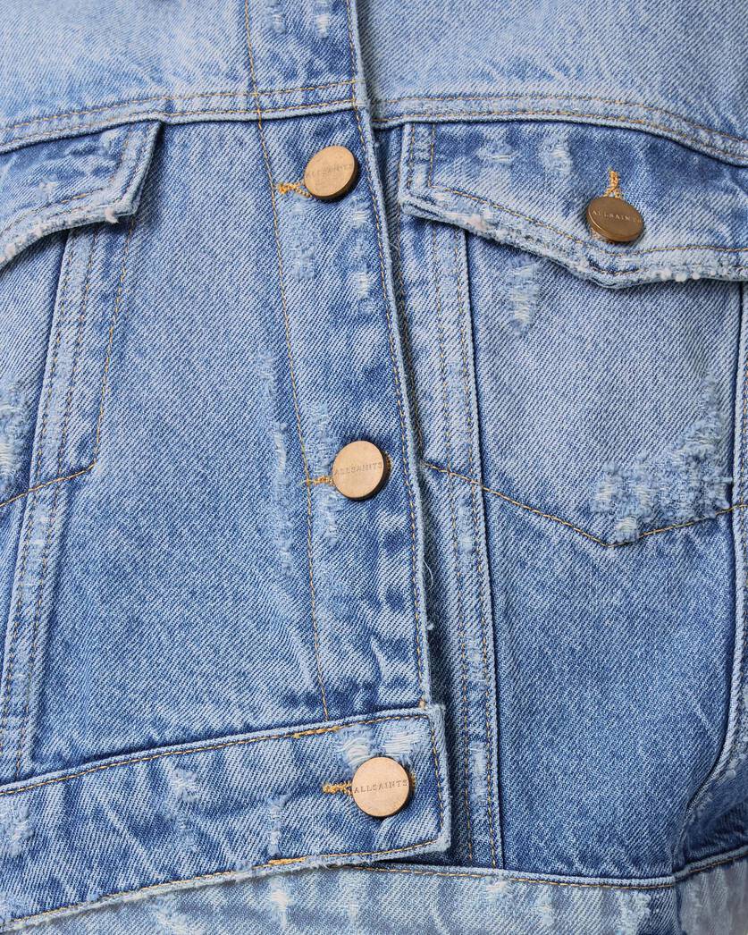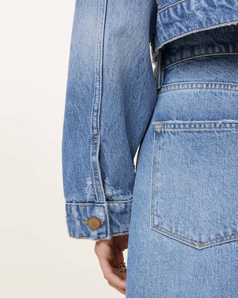 ג'קט ג'ינס קרופ לנשים מבית המותג אולסיינטס. בגזרת אוברסייז, מקוצרת ואסימטרית בכפתורים, עם צווארון קלאסי, שני כיסים בחזה ושרוולים רחבים.