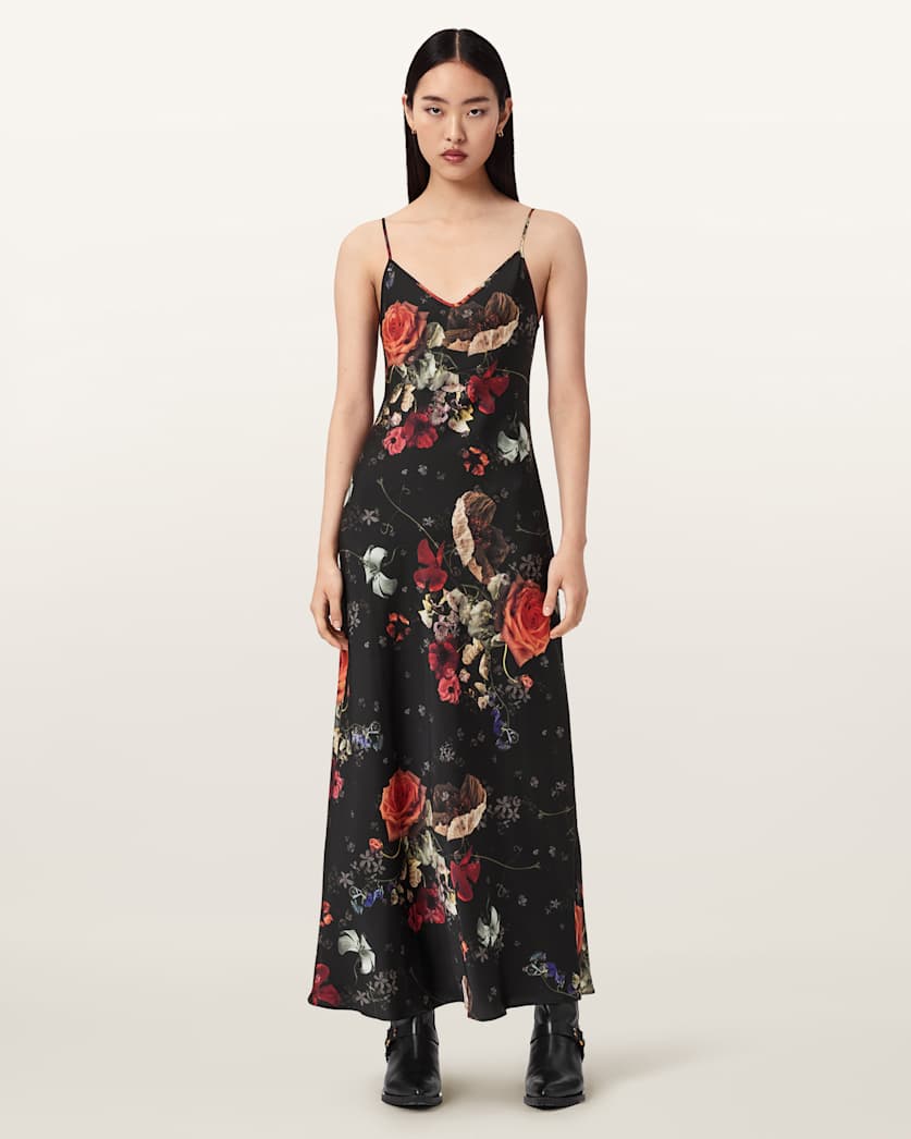 שמלת מקסי לנשים מבית המותג אולסיינטס, בעיצוב נשי ועדין עם הדפס פרחוני רומנטי. הדגם בגזרת סליפ מחמיאה עם מפתח וי, כתפיות מתכווננות וסיומת נקייה למראה קליל ונשפך.