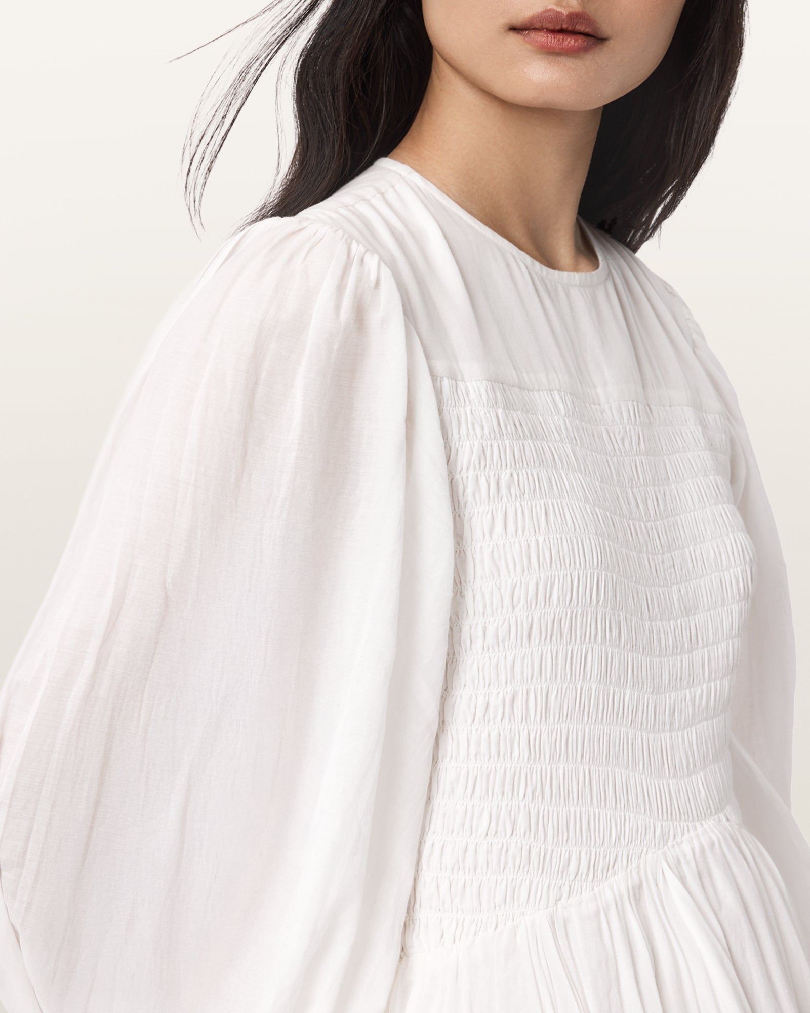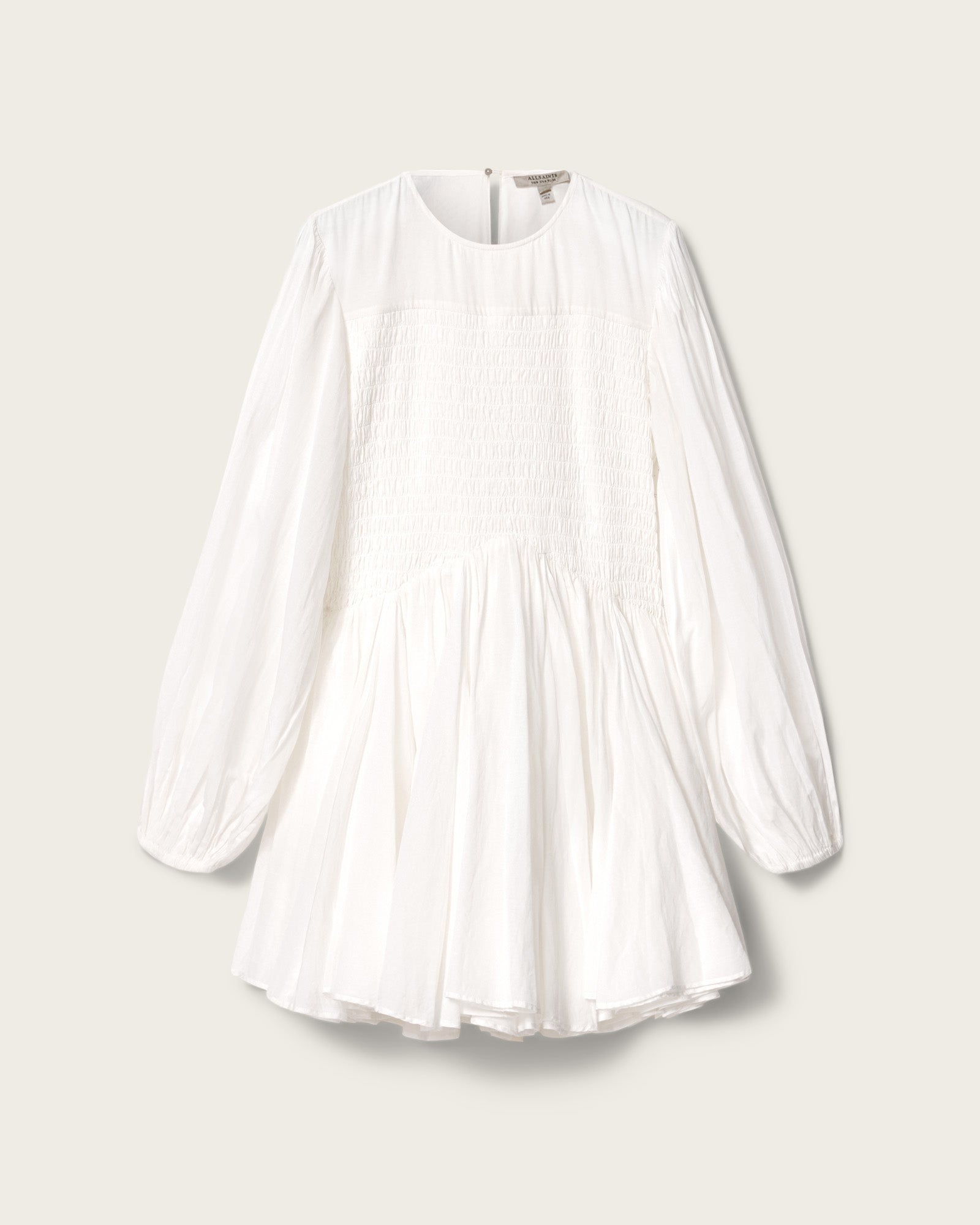שמלת מיני לנשים מבית המותג אולסיינטס, בסטייל רוקסטאר אלגנטי עם סילואטה מחמיאה. דגם Chia Dress משלב בגוון לבן קו אופנתי לא מתאמץ שמתאים למלתחה עכשווית.