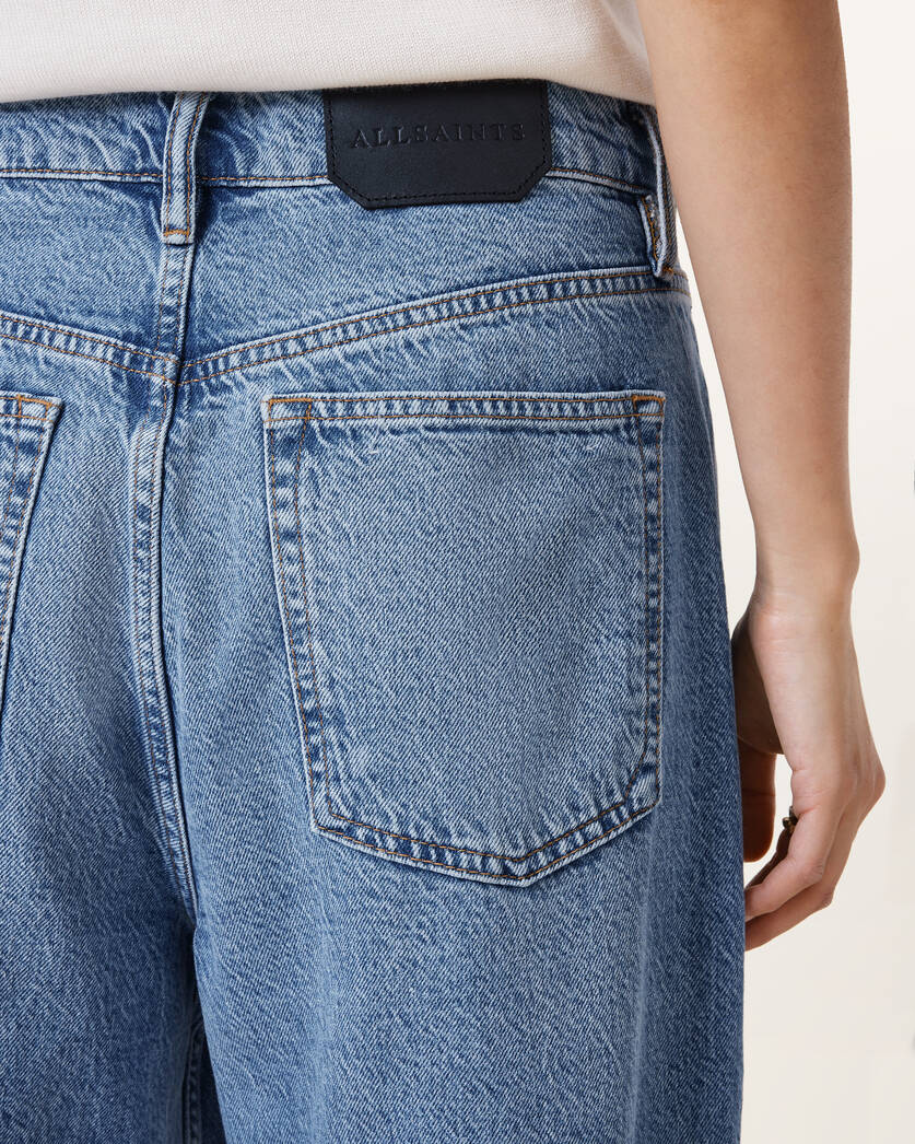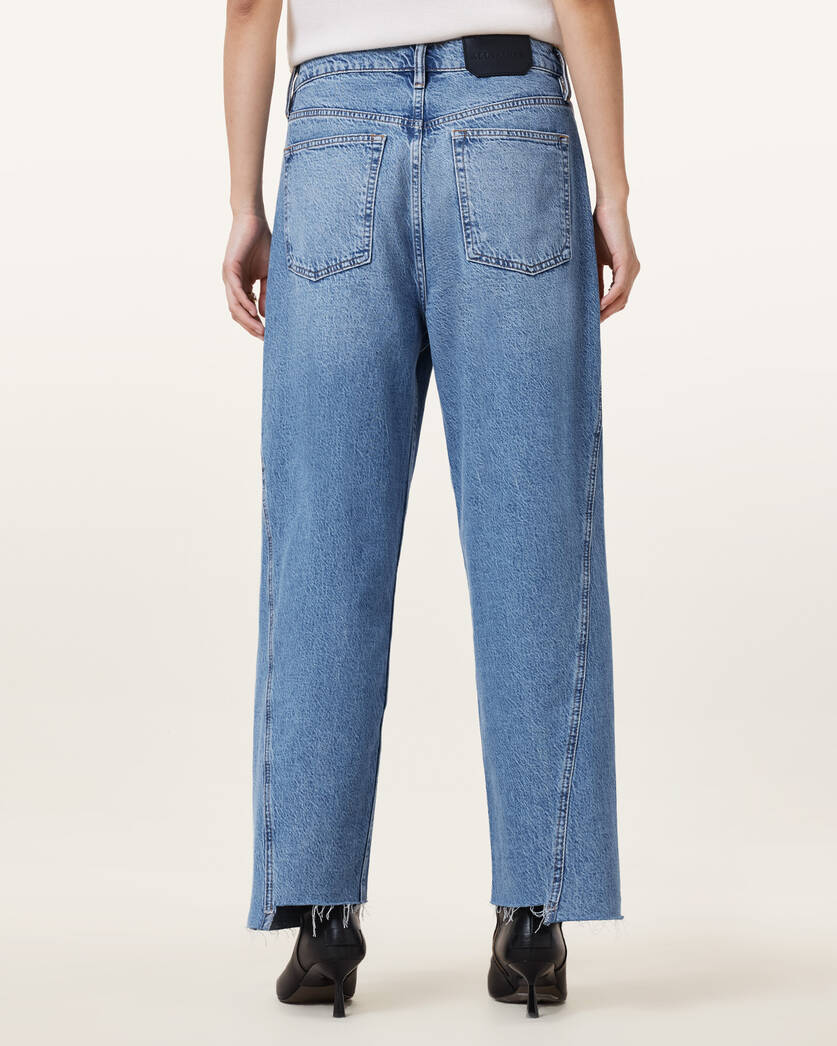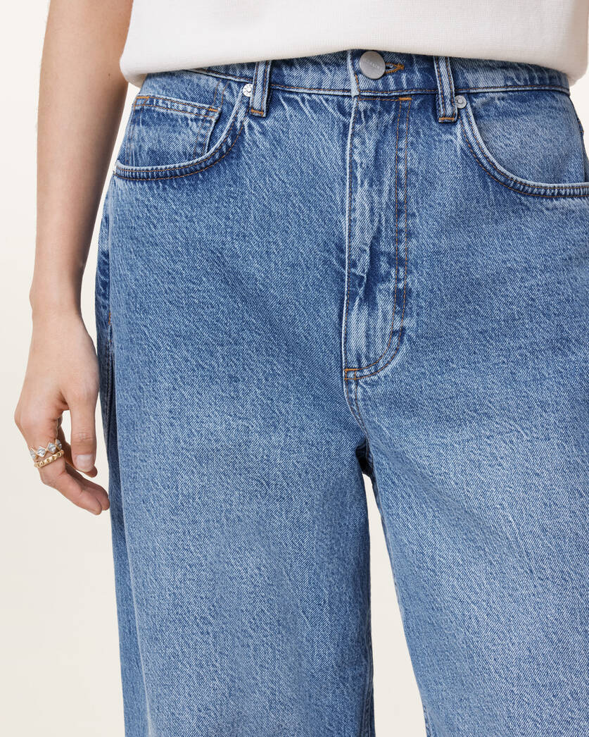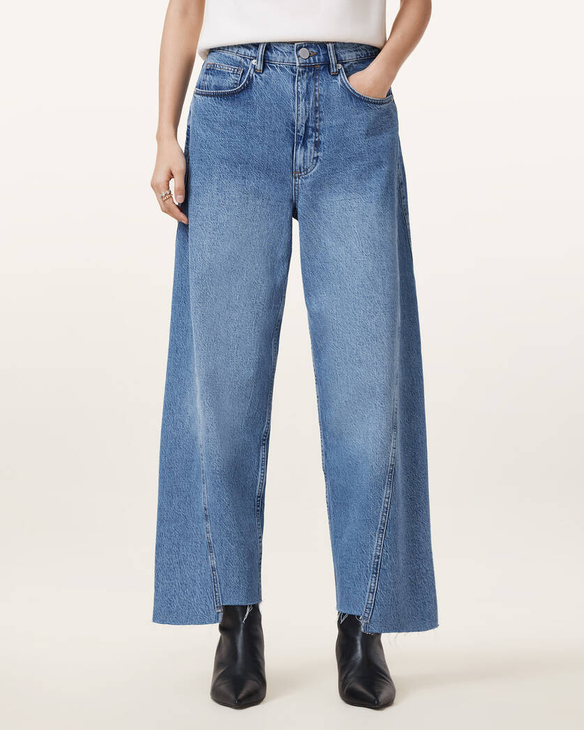 ג'ינס ארוך לנשים מבית המותג אולסיינטס. בגזרה רחבה, אורך קרסול, יושב מידי על המותן, עם סגירת רוכסן וכפתור, כיסים, בשילוב תפרי ג'ינס מסובבים שיוצרים מראה ייחודי.
