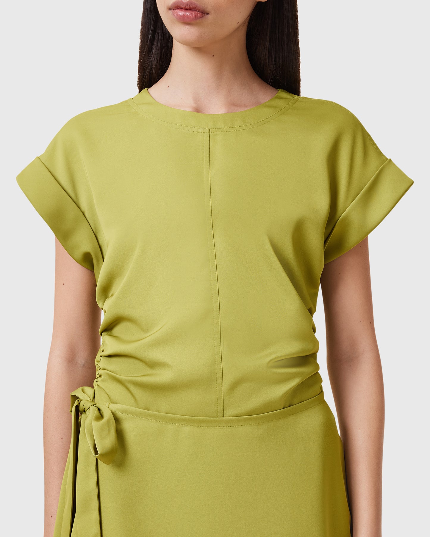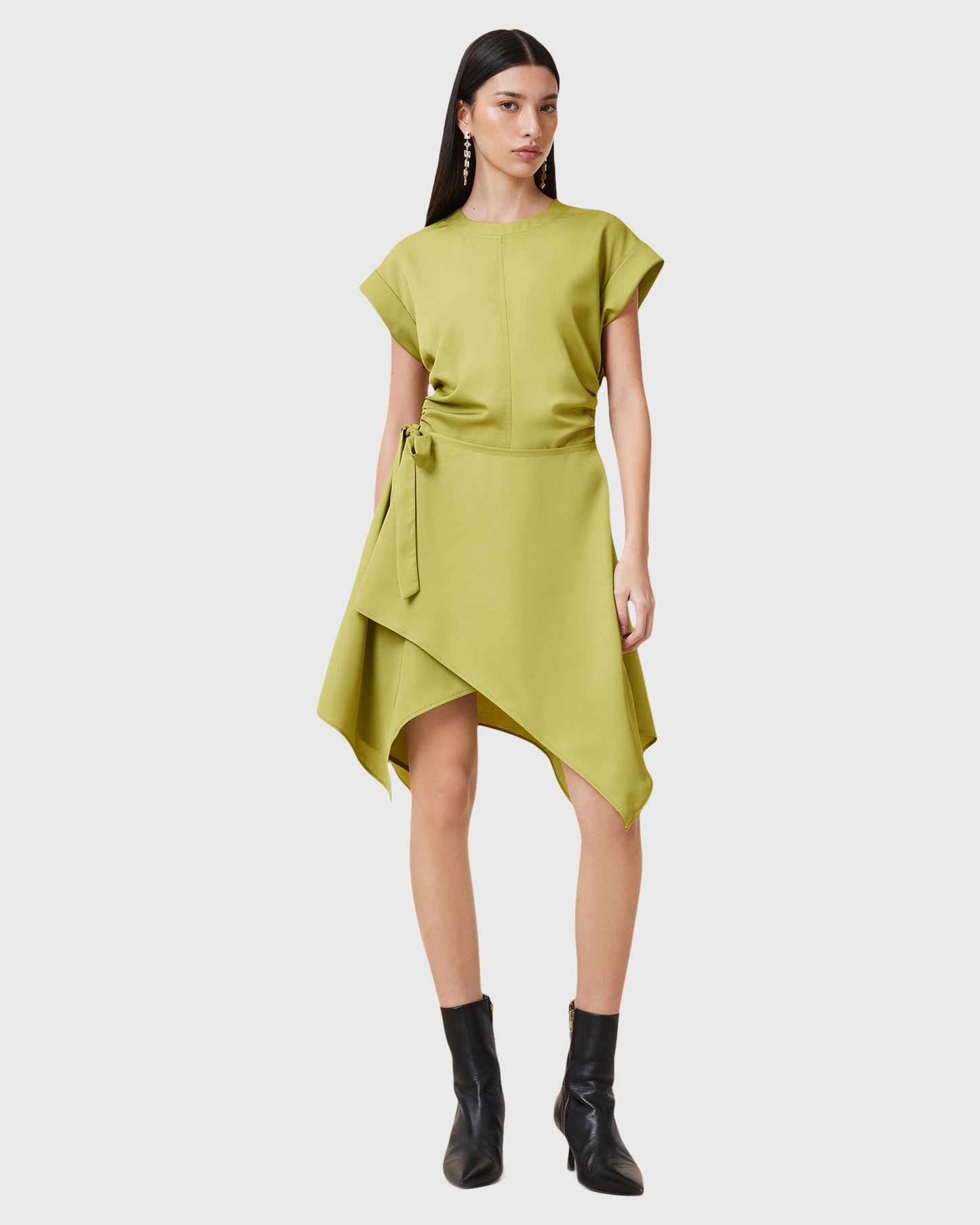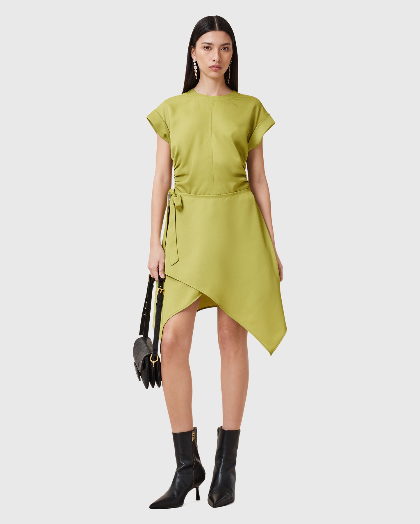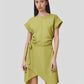 שמלת מיני לנשים מבית המותג אולסיינטס. עם מפתח עגול, שרוולי חצי עומדים, חגורת קשירה במותן, וחצאית בסגנון מעטפת משוחררת.