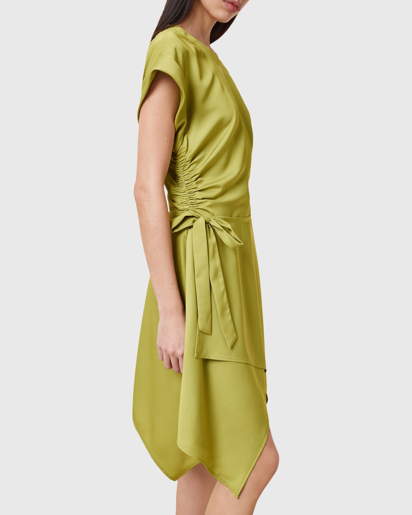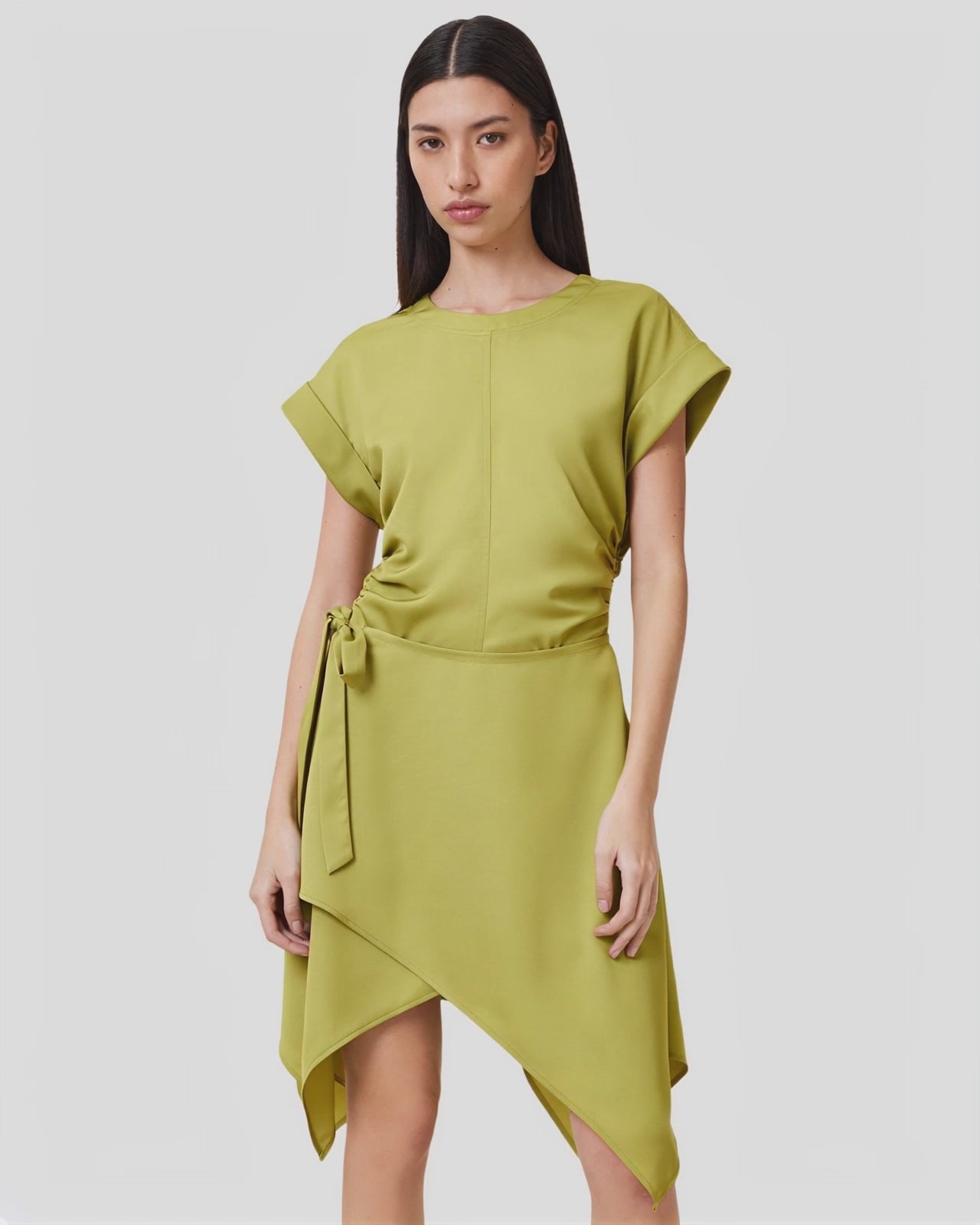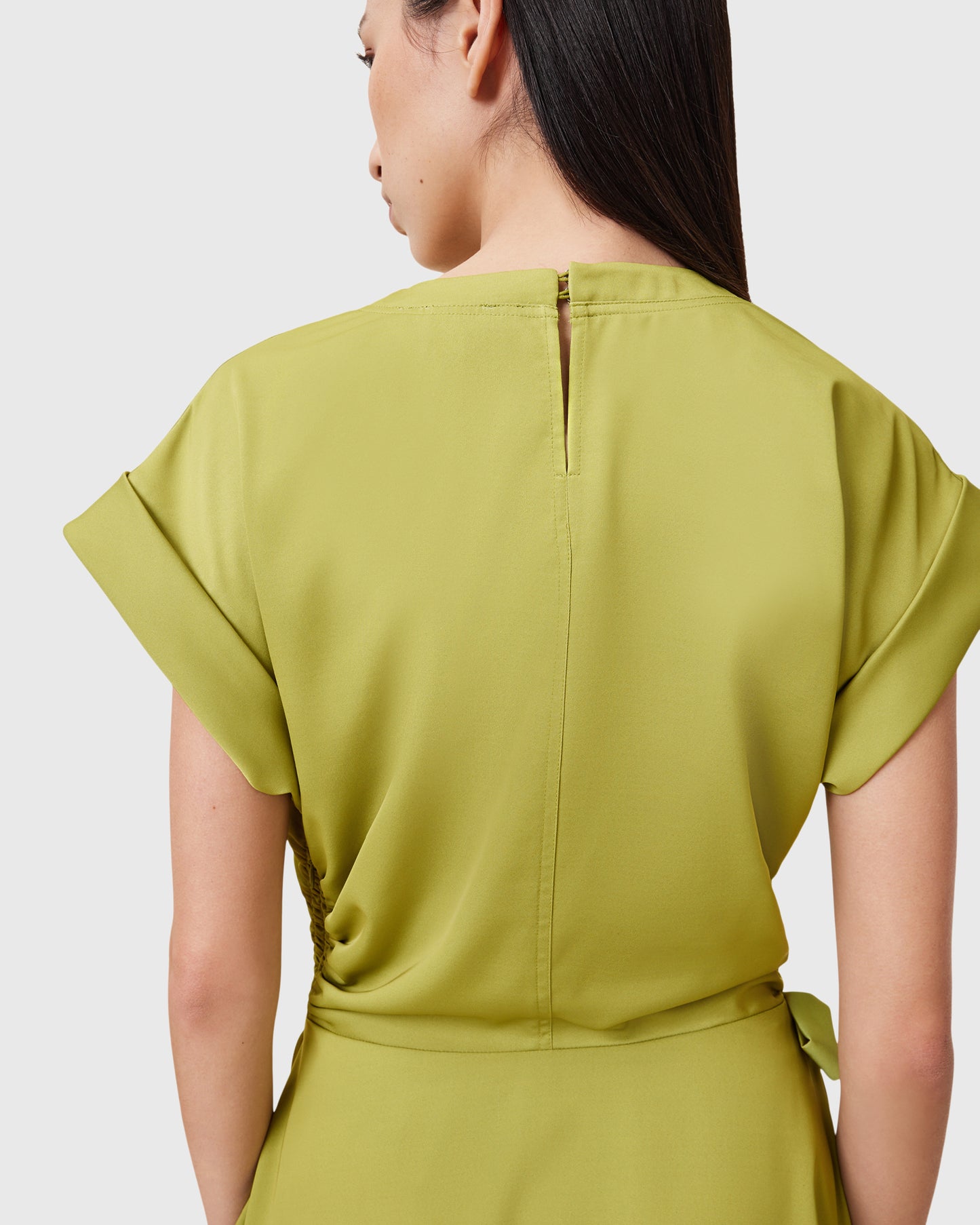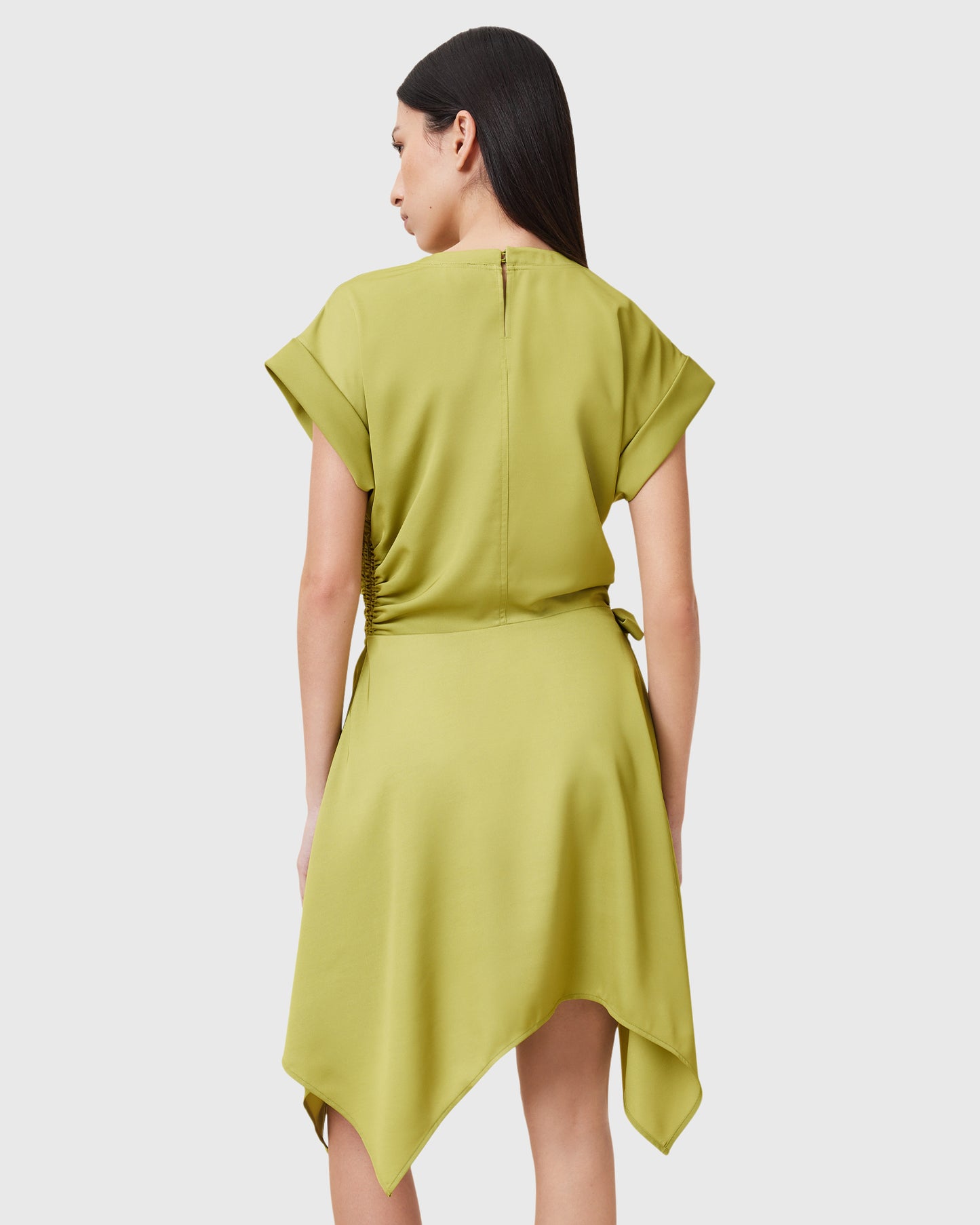שמלת מיני לנשים מבית המותג אולסיינטס. עם מפתח עגול, שרוולי חצי עומדים, חגורת קשירה במותן, וחצאית בסגנון מעטפת משוחררת.