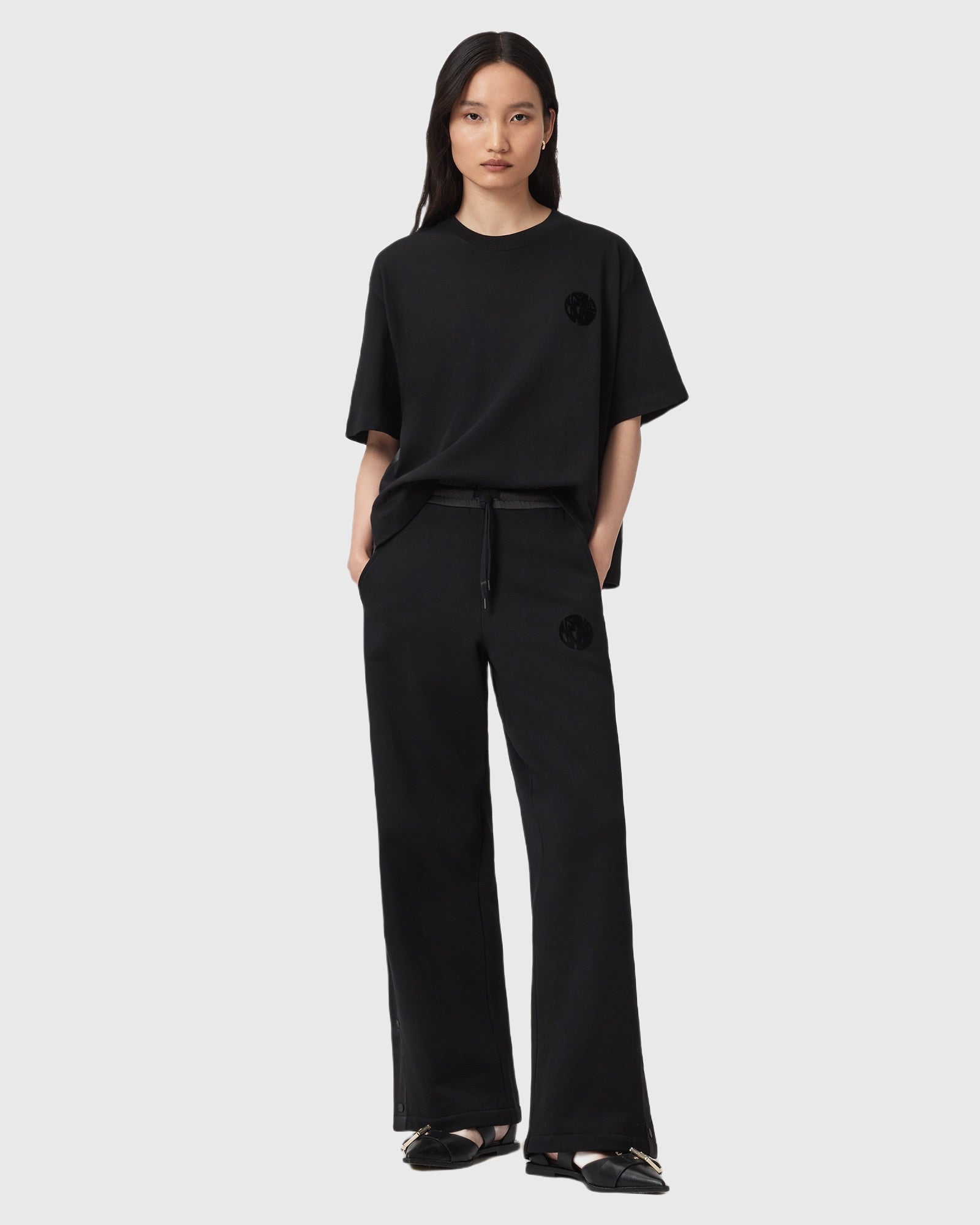 מכנסיים ארוכים לנשים מבית המותג אולסיינטס. בגזרת טרנינג ישרה, עם גומי ושרוכים במותן, הדפס לוגו המותג בצד הירך ושני כיסים קדמיים.