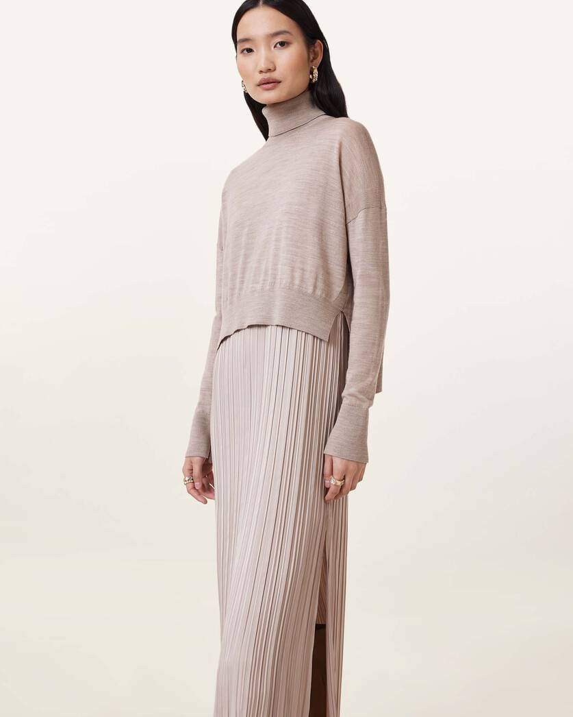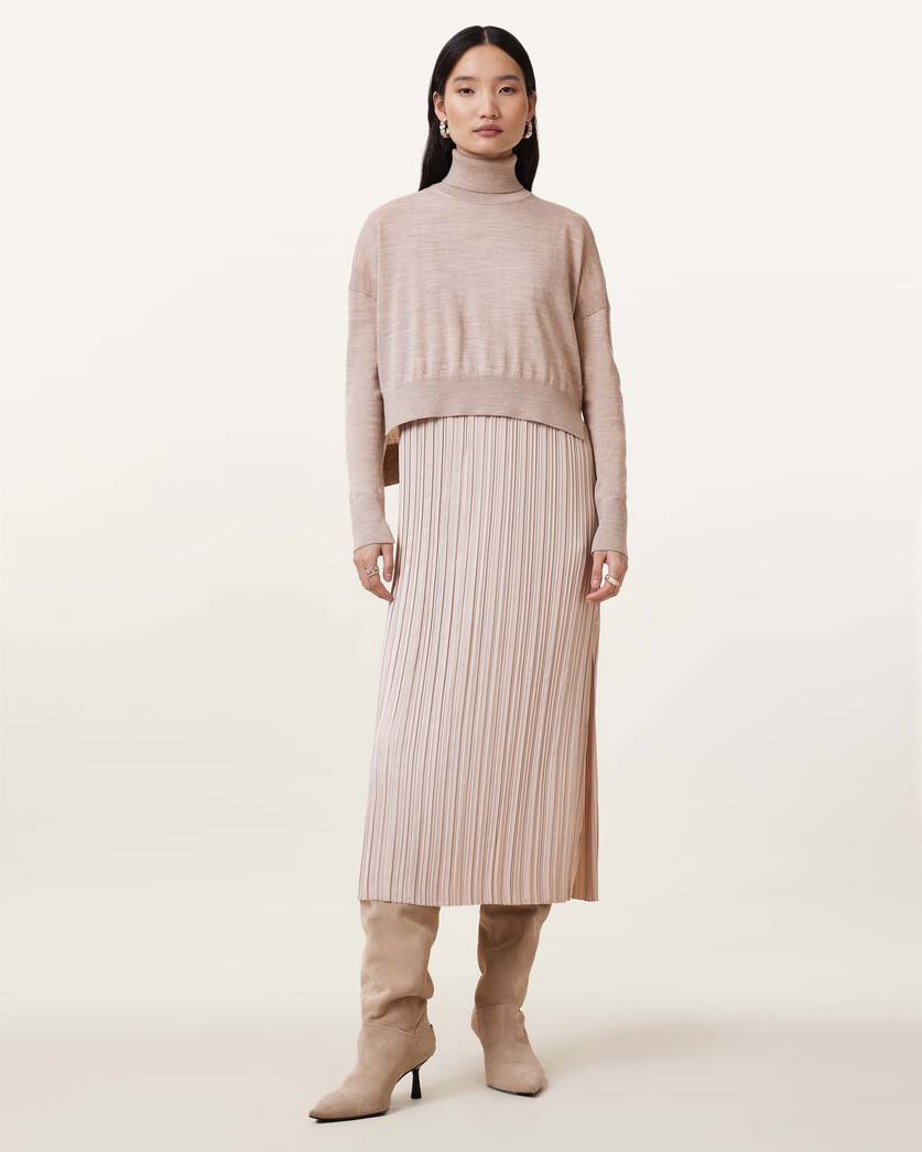 שמלת מידי 2 ב-1 לנשים מבית המותג אולסיינטס. בגזרה קלאסית עם מפתח סגור ועגול, השמלה מגיעה עם סריג קרופ שניתן להורדה, בעל צווארון גולף ושרוולים ארוכים. שמלה וורסטילית שניתן ללבוש כשחם וגם כשמתקרר.