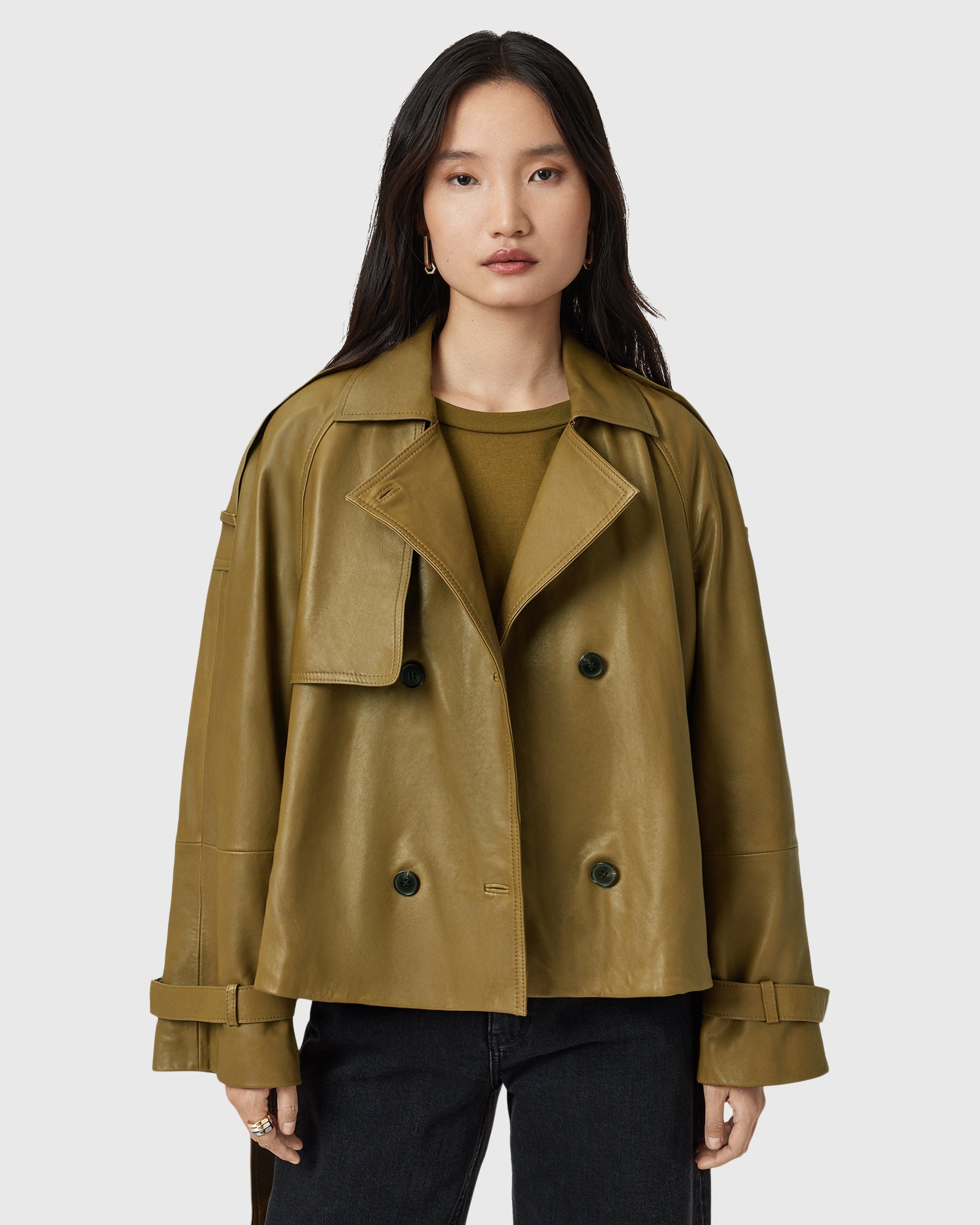ג'קט עור לנשים מבית המותג אולסיינטס. בגזרת טרנץ' קרופ, עם כפתורים בחזית ושרוולים ארוכים. בשילוב רצועה למותן.