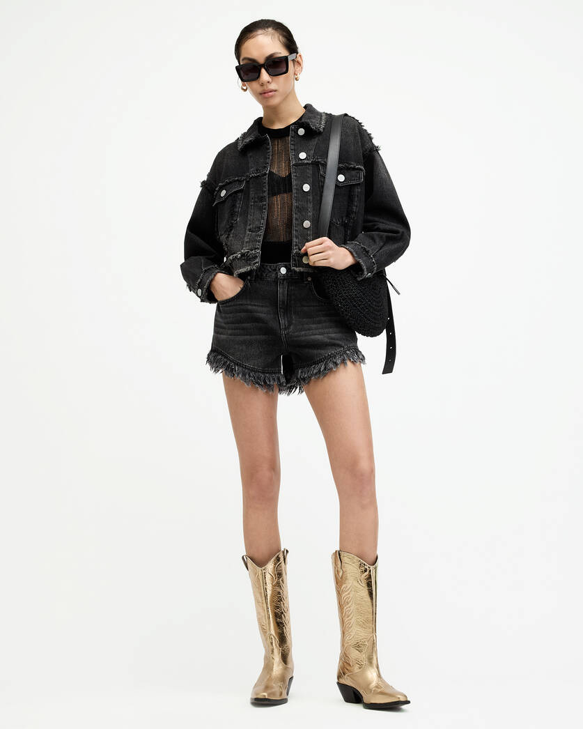 מכנסי ג'ינס קצרים לנשים מבית המותג אולסיינטס. בגזרה גבוהה, עם רוכסן סגירה וכפתור,, שני כיסים קדמיים ואחוריים וסיומת פרומה.