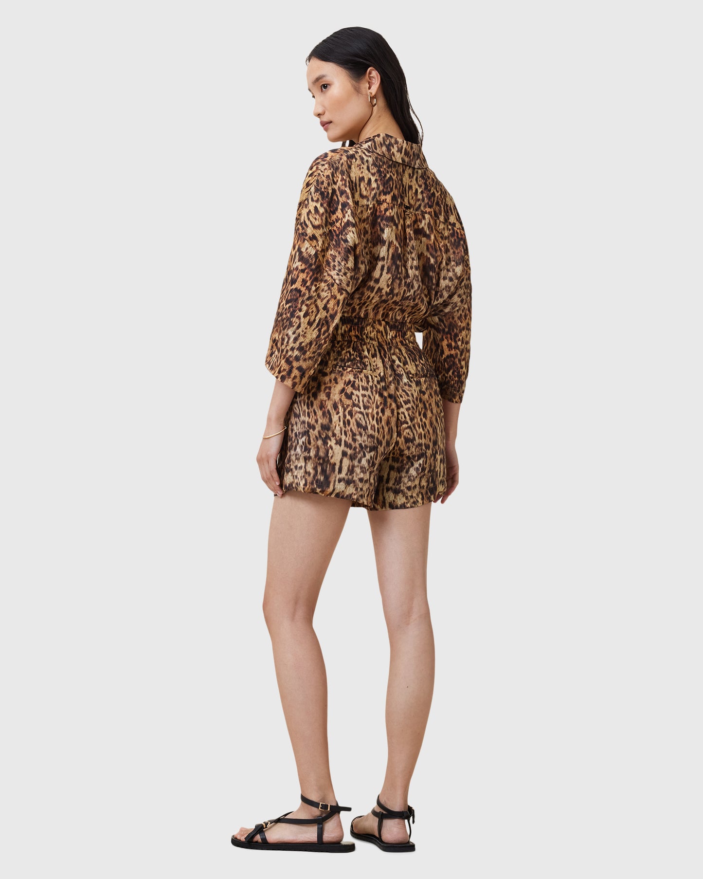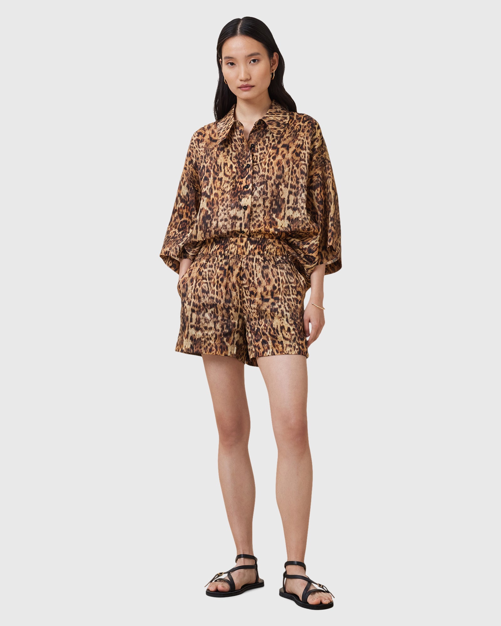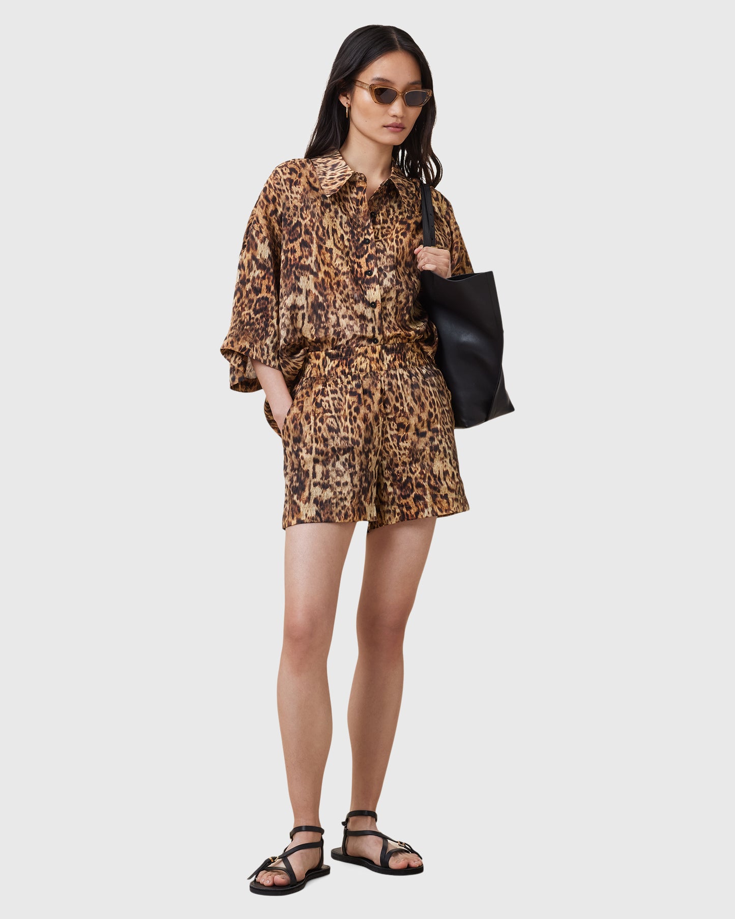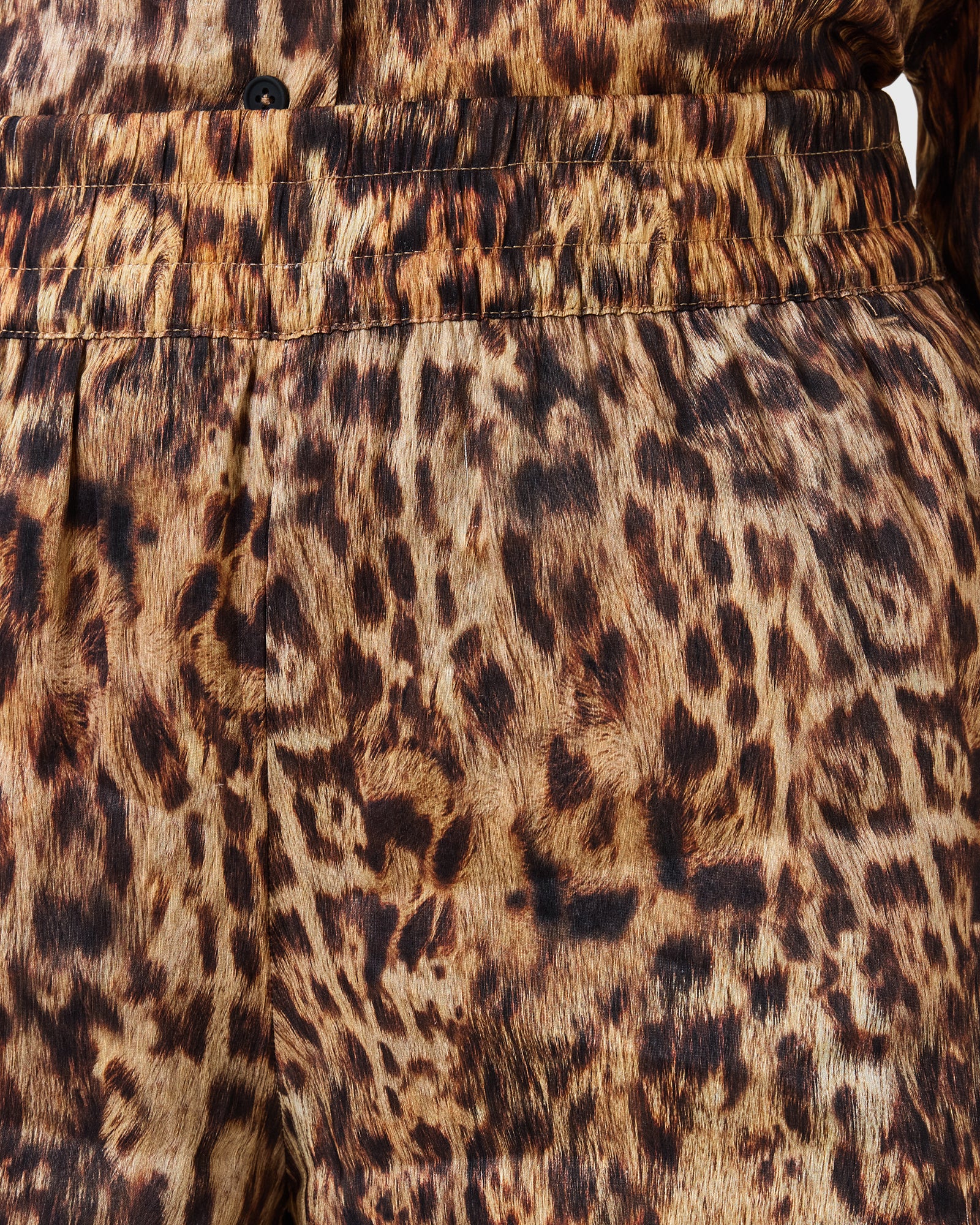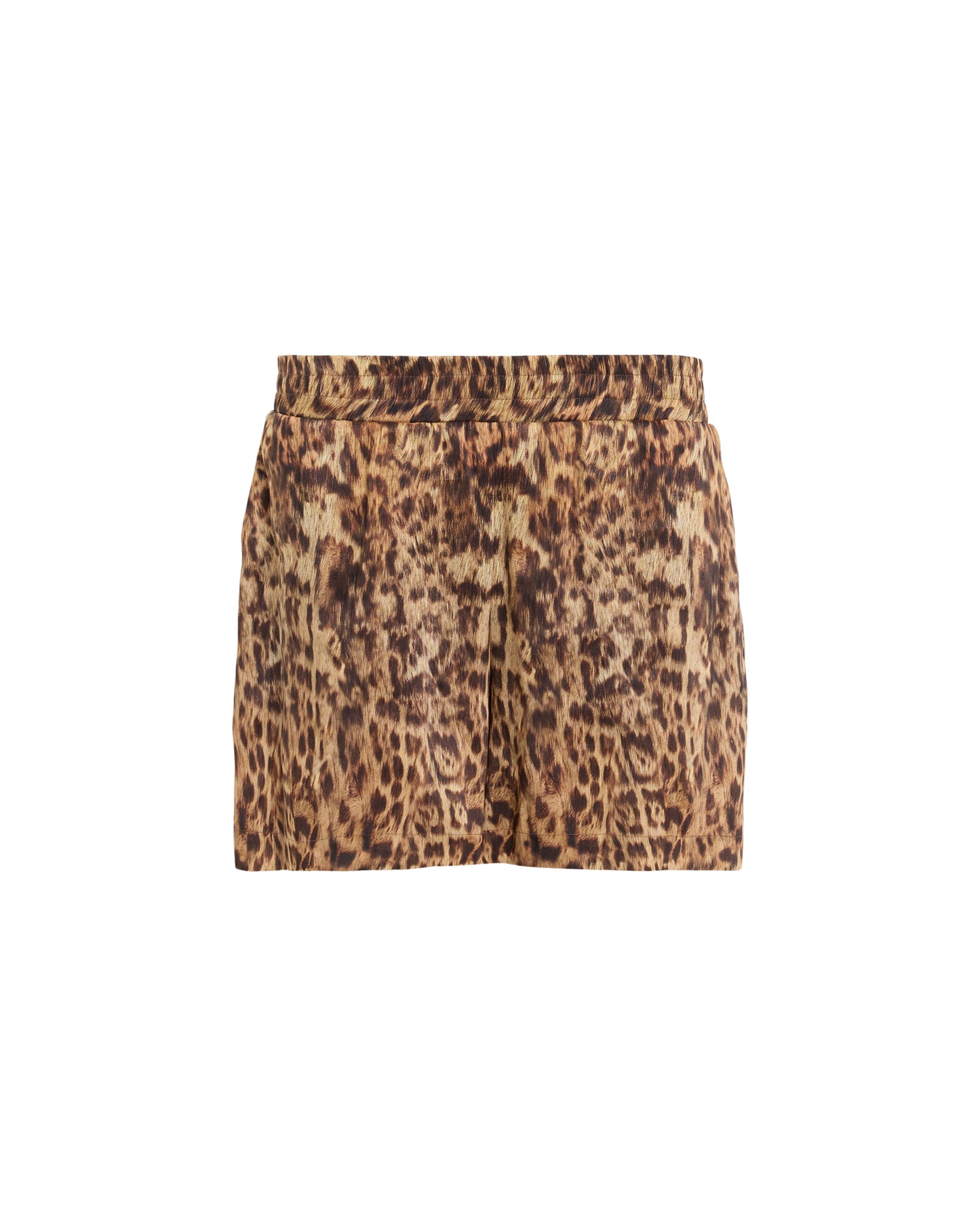 מכנסיים קצרים לנשים מבית המותג אולסיינטס. בגזרה משוחררת, עם גומי במותן ושני כיסים קדמיים. בהדפס מנומר.