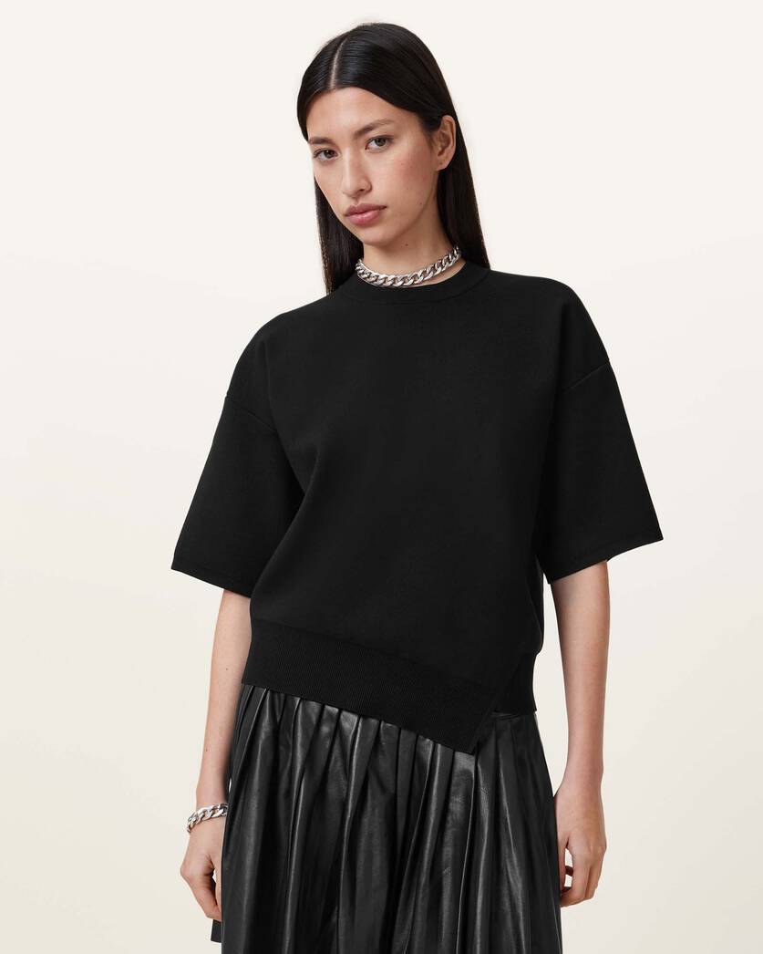 טי שירט סריג קצרה לנשים מבית המותג אולסיינטס. בגזרה משוחררת, עם מפתח עגול, שרוולים קצרים וסיומת אסימטרית.