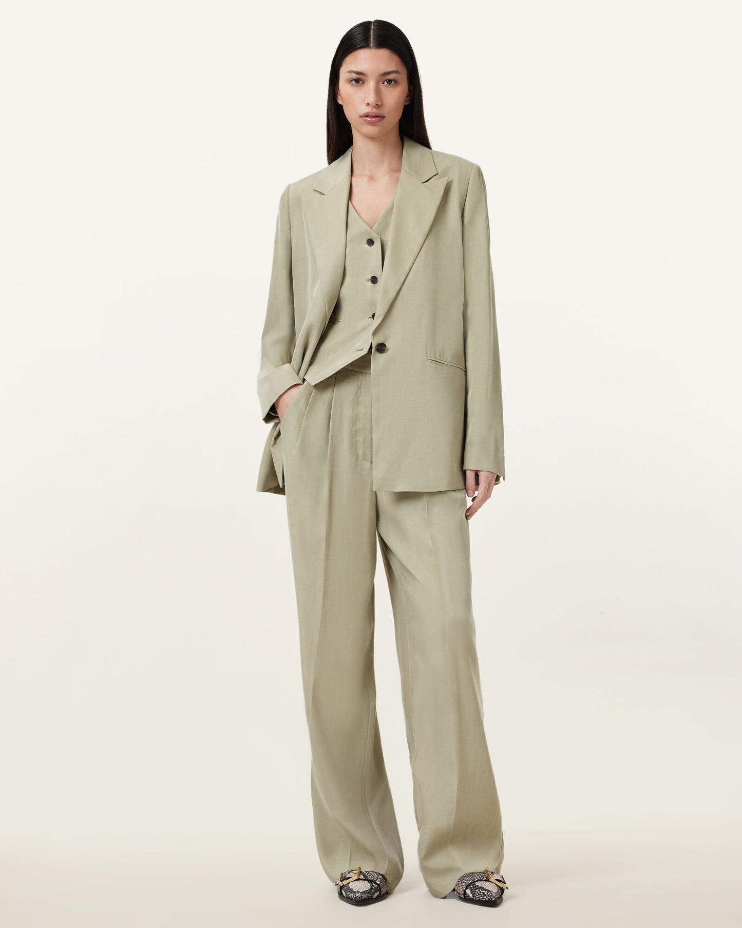 ווסט מחויט לנשים מבית המותג אולסיינטס. בגזרה משוחררת, עם מפתח וי, כפתורי סגירה לכל האורך, וסיומת וי פתוחה.