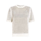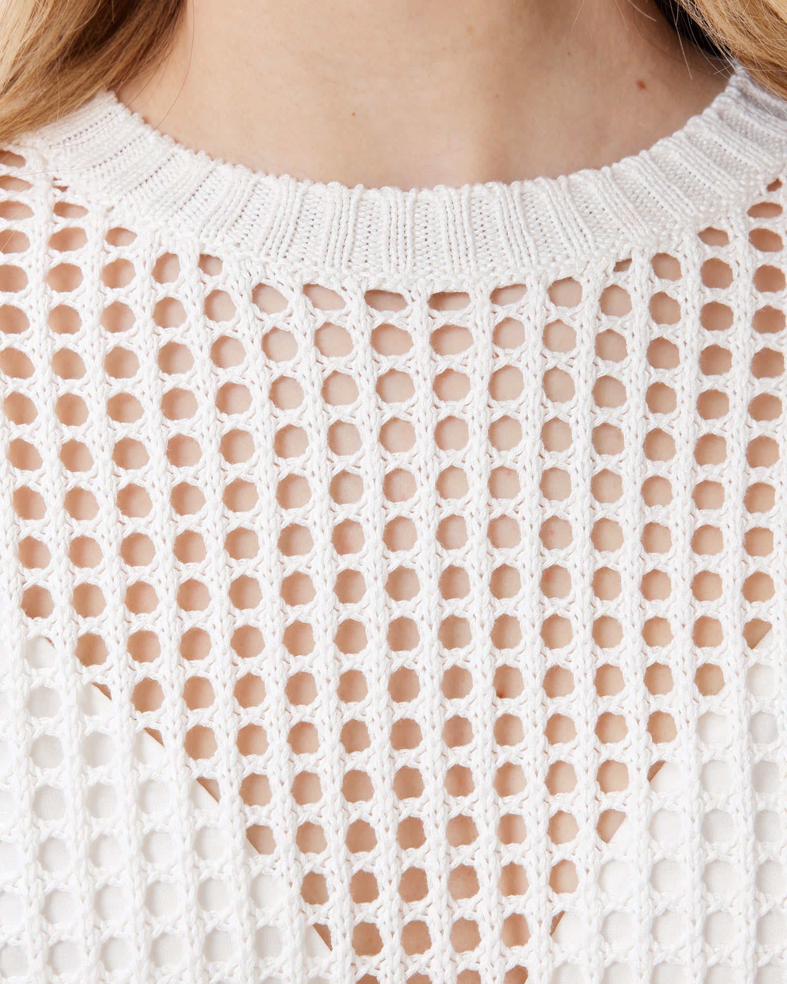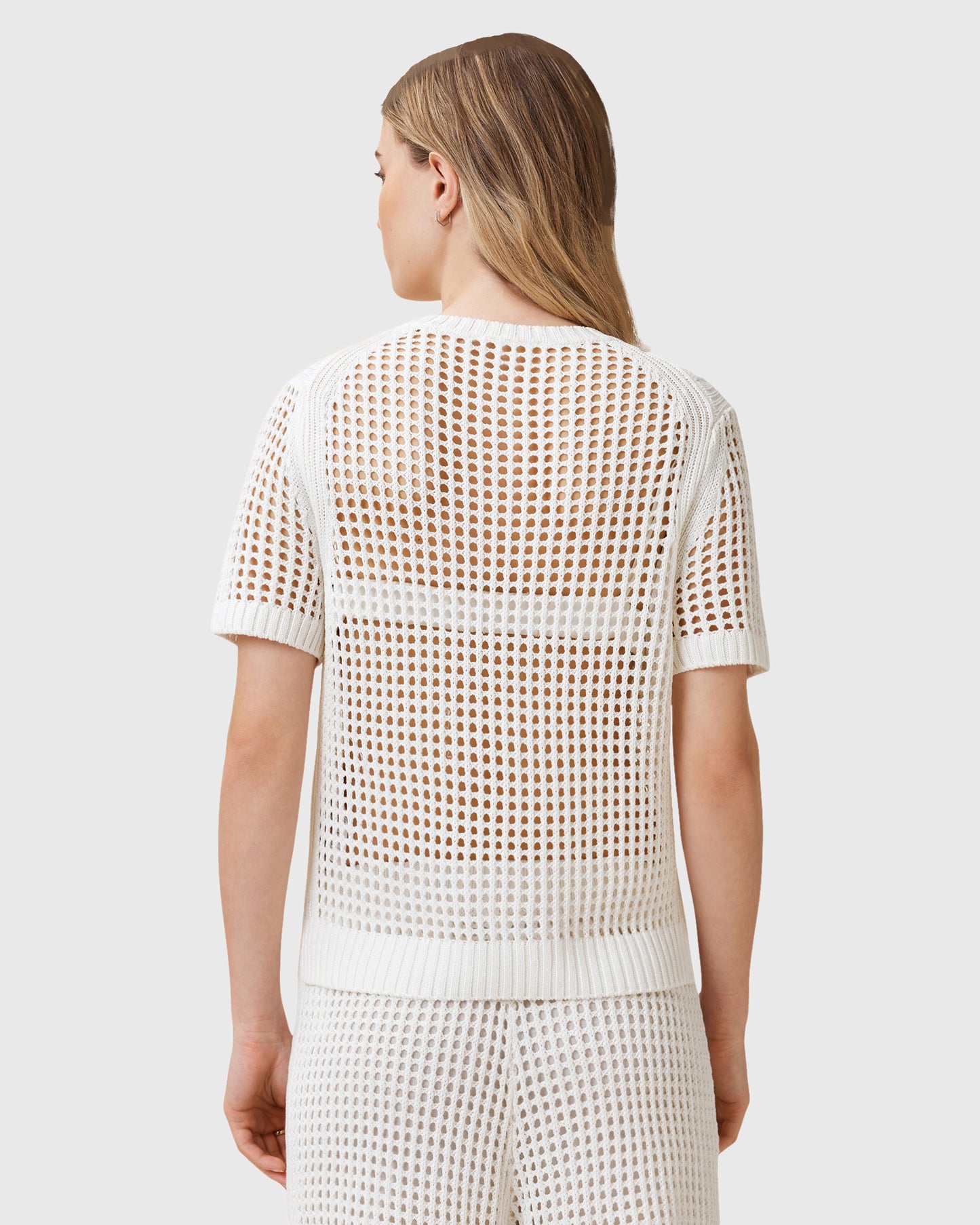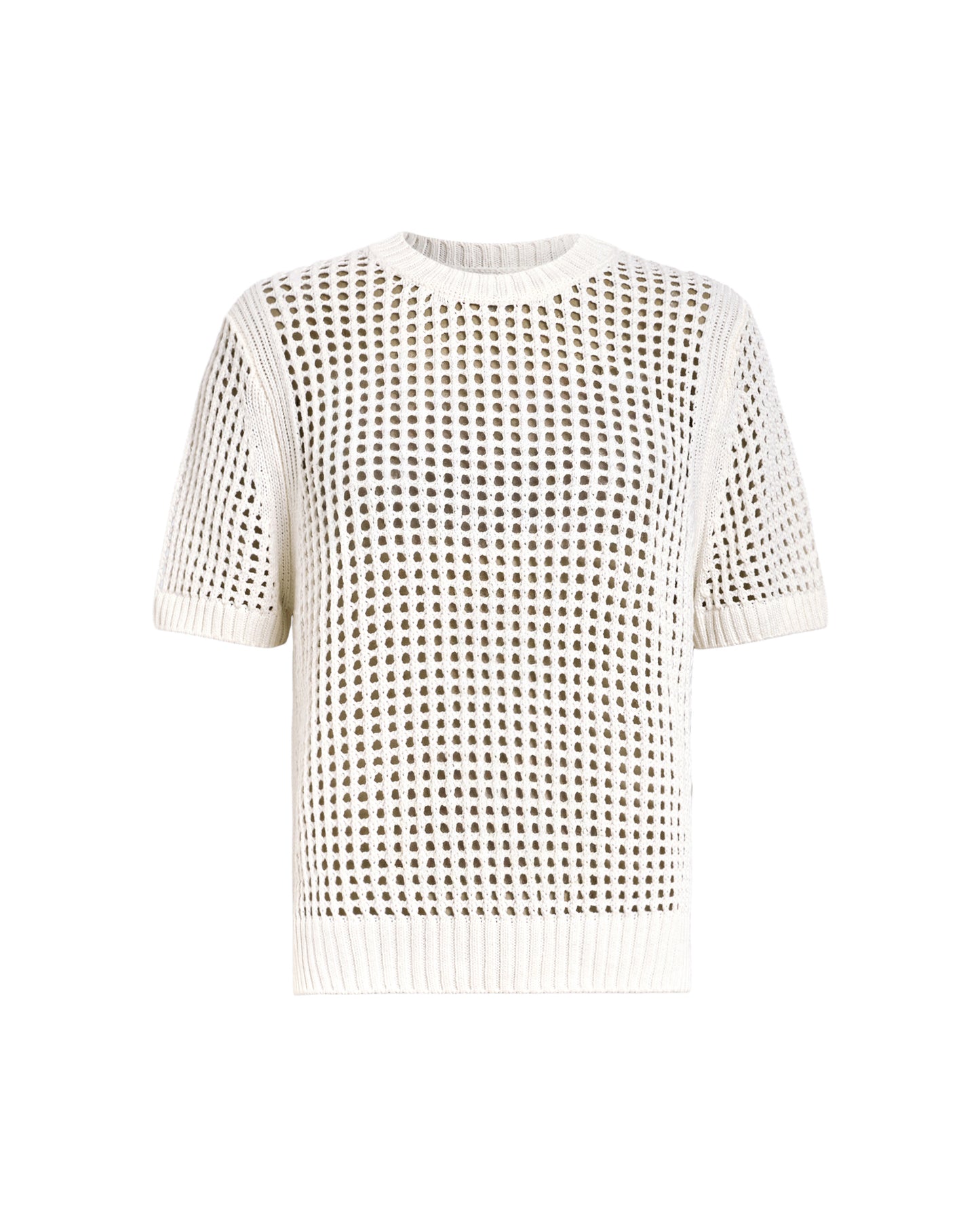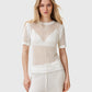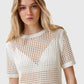 טי שירט קצרה רשת לנשים מבית המותג אולסיינטס. בגזרה צמודה, עם מפתח עגול צמוד ושרוולים קצרים. החולצה שקופה.