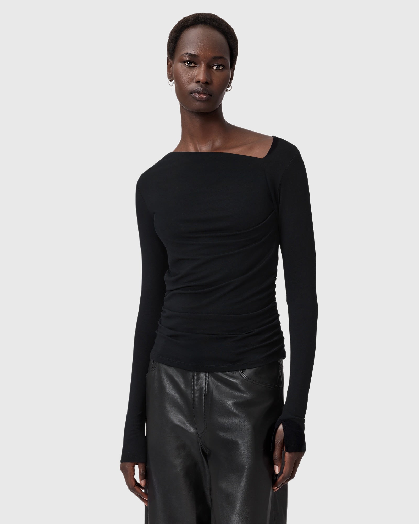 חולצה ארוכה לנשים מבית המותג אולסיינטס. בגזרה צמודה, עם שרוולים ארוכים ומפתח אסימטרי.