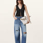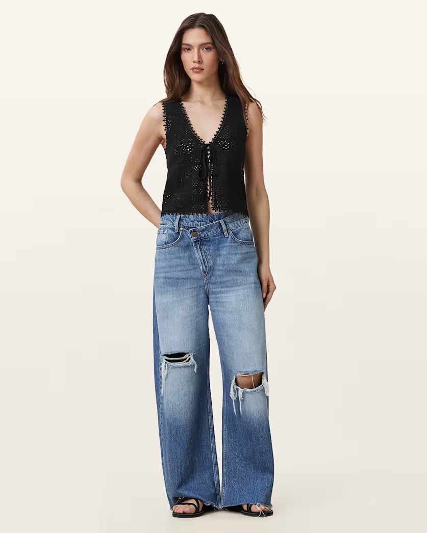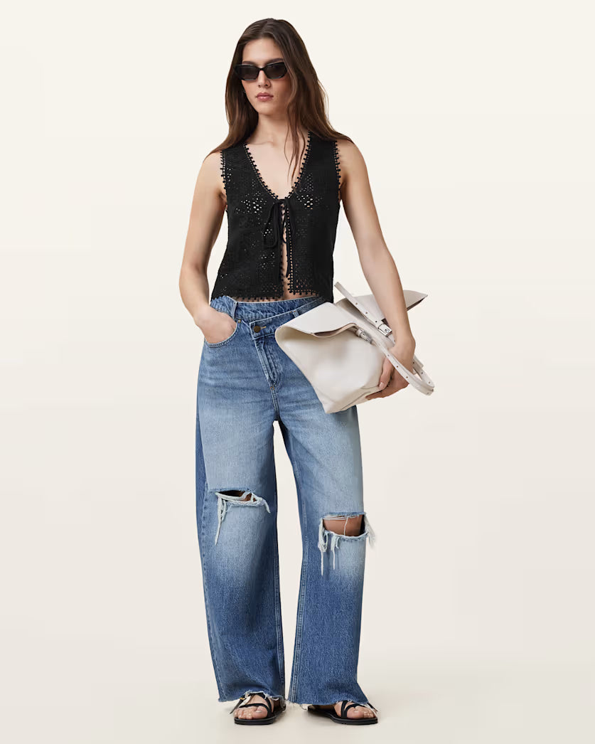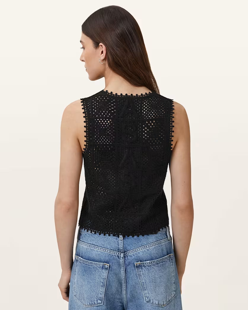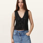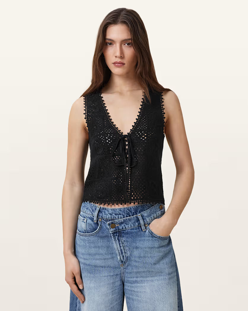 גופית קרושה לנשים מבית המותג אולסיינטס. בגזרה צמודה, עם מפתח וי, ללא שרוולים. עם קשירה בחזית.