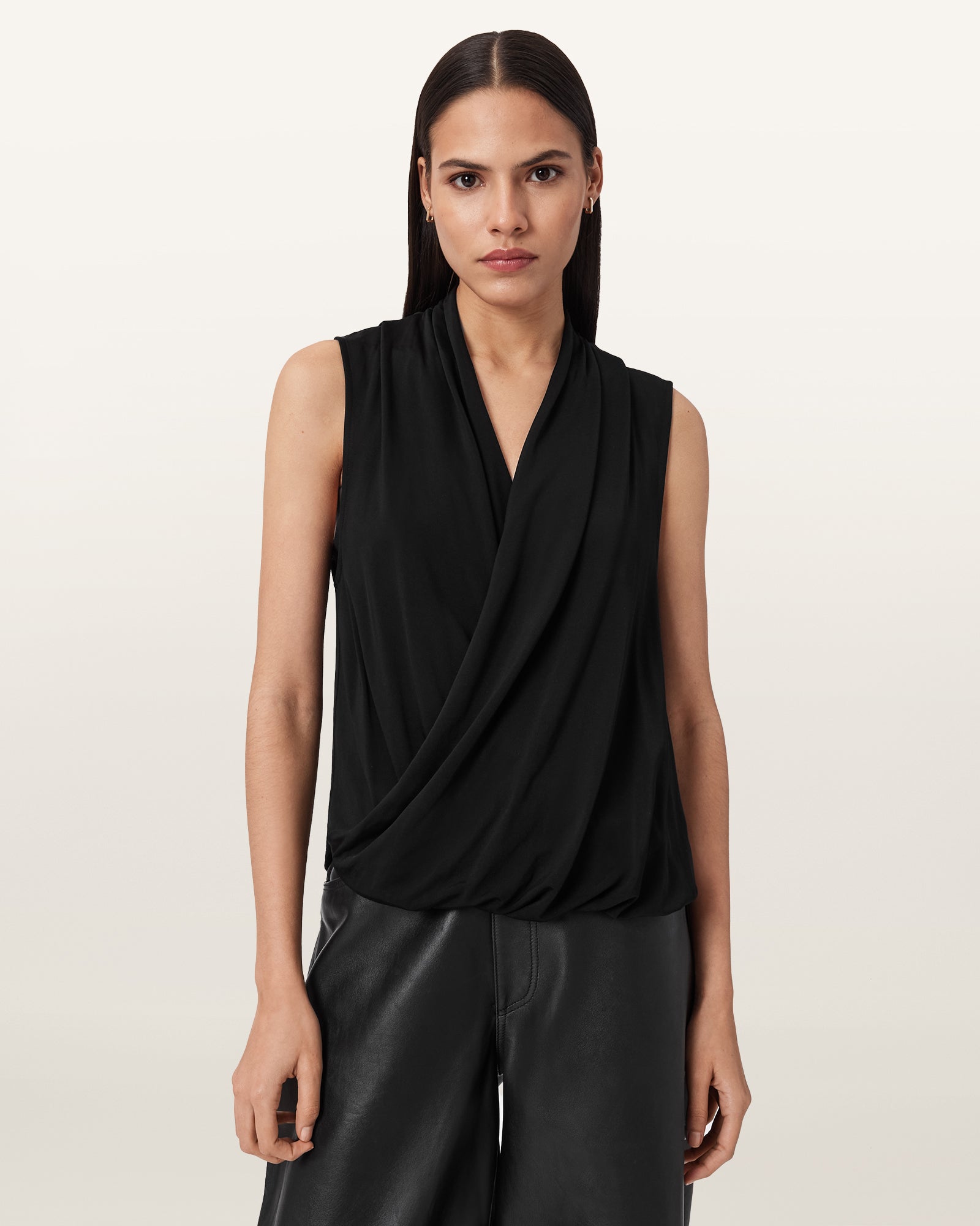 טופ נשי עם נוכחות רוקיסטית מבית המותג אולסיינטס, בעיצוב מעטפת מחמיא עם מפתח וי עמוק. הדגם ללא שרוולים וכולל בנדאו פנימי לתמיכה ונוחות, למראה ערב מדויק עם טאץ' אדג’י.