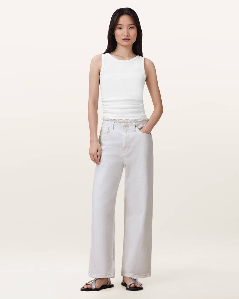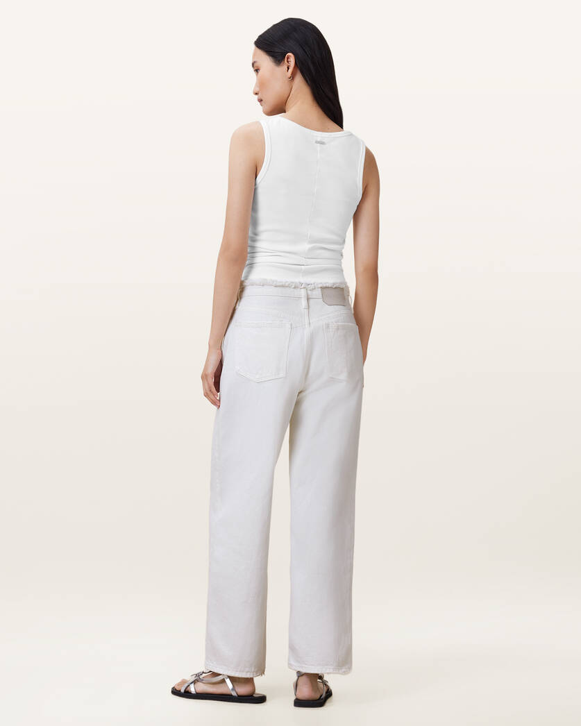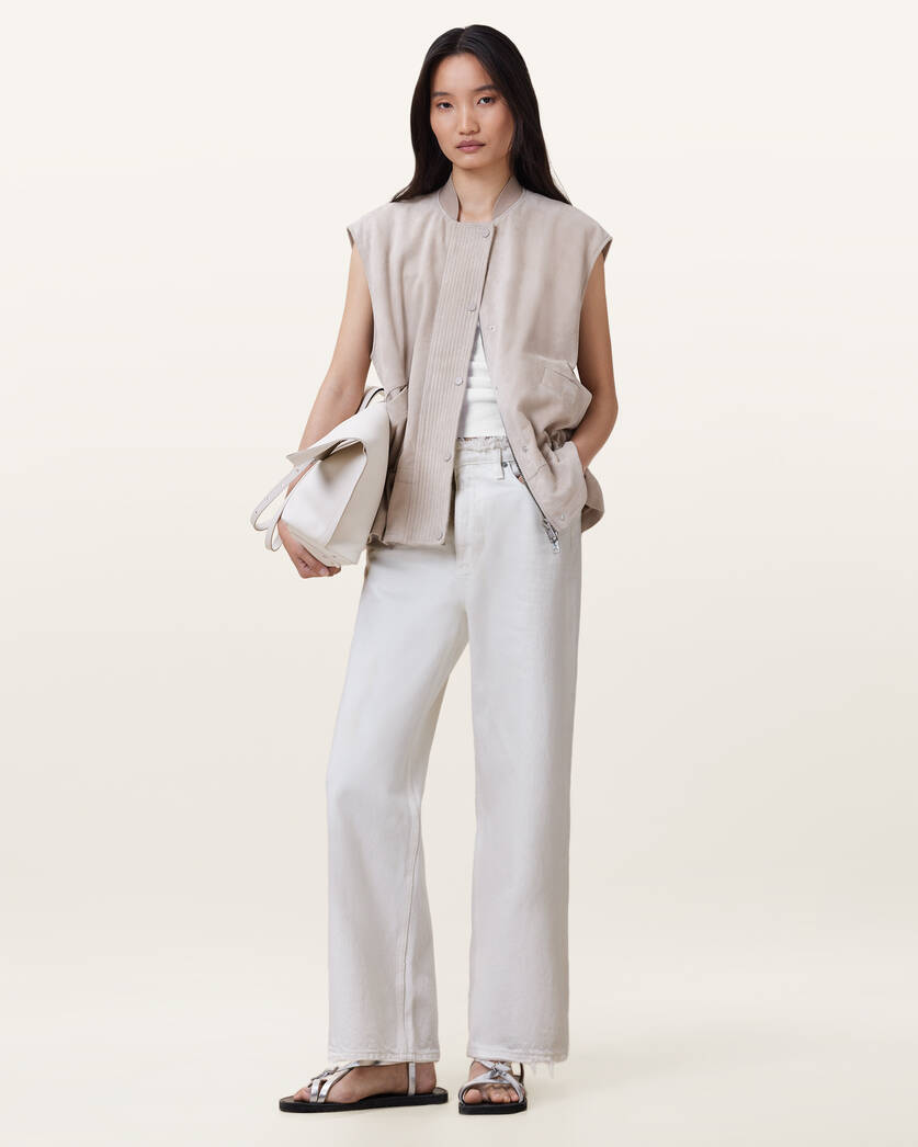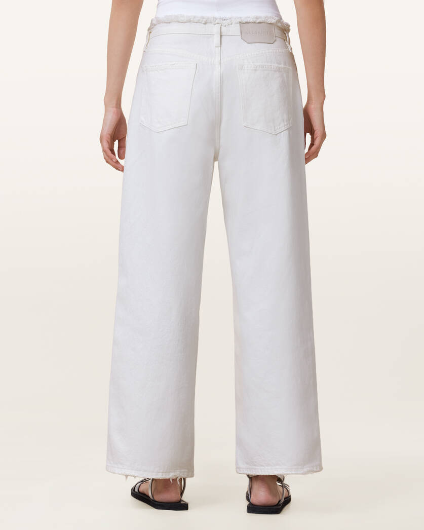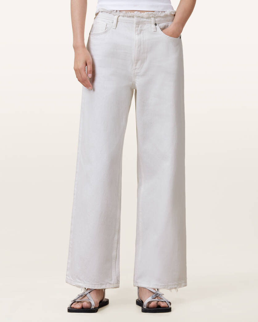 ג'ינס ארוך לנשים מבית המותג אולסיינטס. בגזרה נמוכה ורחבה, עם סגירת רוכסן וכפתור, כיסים קדמיים ואחוריים בשילוב סיומת פרומה במותן.