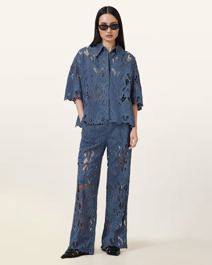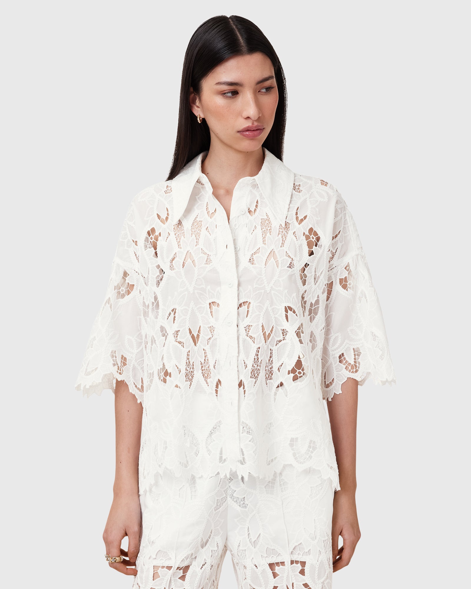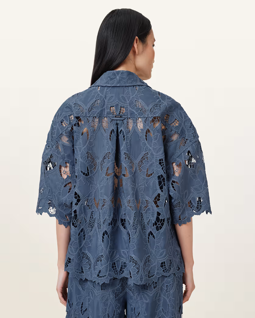 חולצה קצרה לנשים מבית המותג אולסיינטס. בגזרה משוחררת, עם כפתורי סגירה לכל האורך, צווארון קלאסי ושרוולים קצרים. מבד תחרה מיוחד.