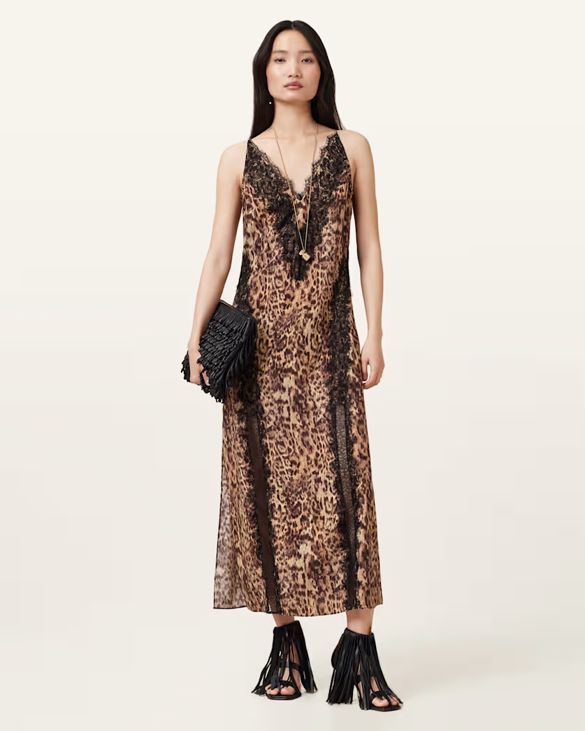 שמלת מקסי לנשים מבית המותג אולסיינטס. בגזרה קלילה ומשוחררת, בהדפס מנומר, עם כתפיות דקות, מפתח וי, בשילוב תחרה שחורה דקורטיבית. עשויה בד שקפקף עם שסעים בצדדים.