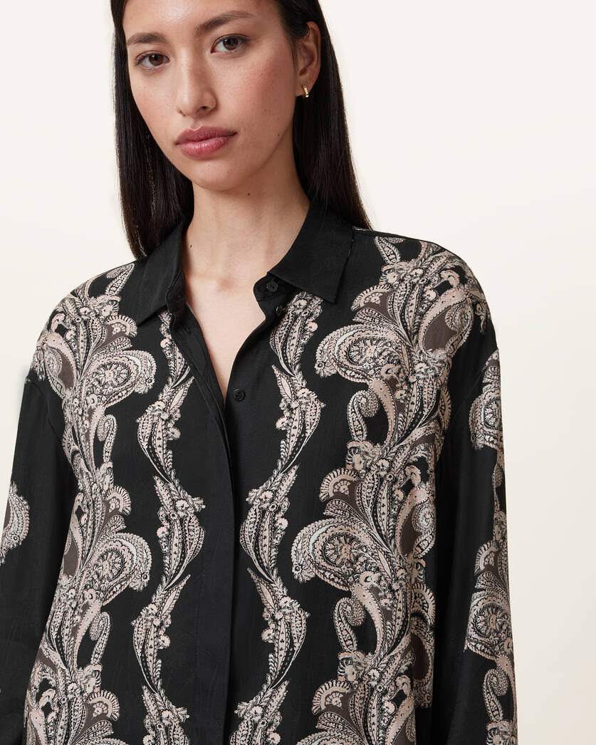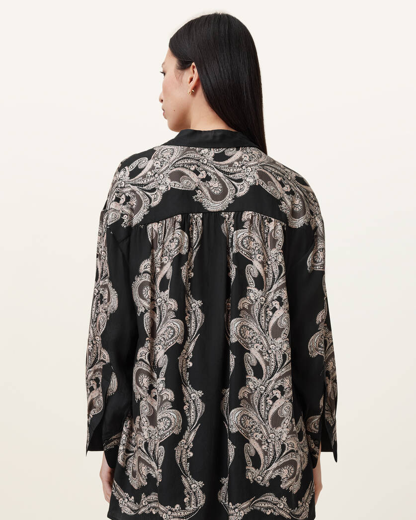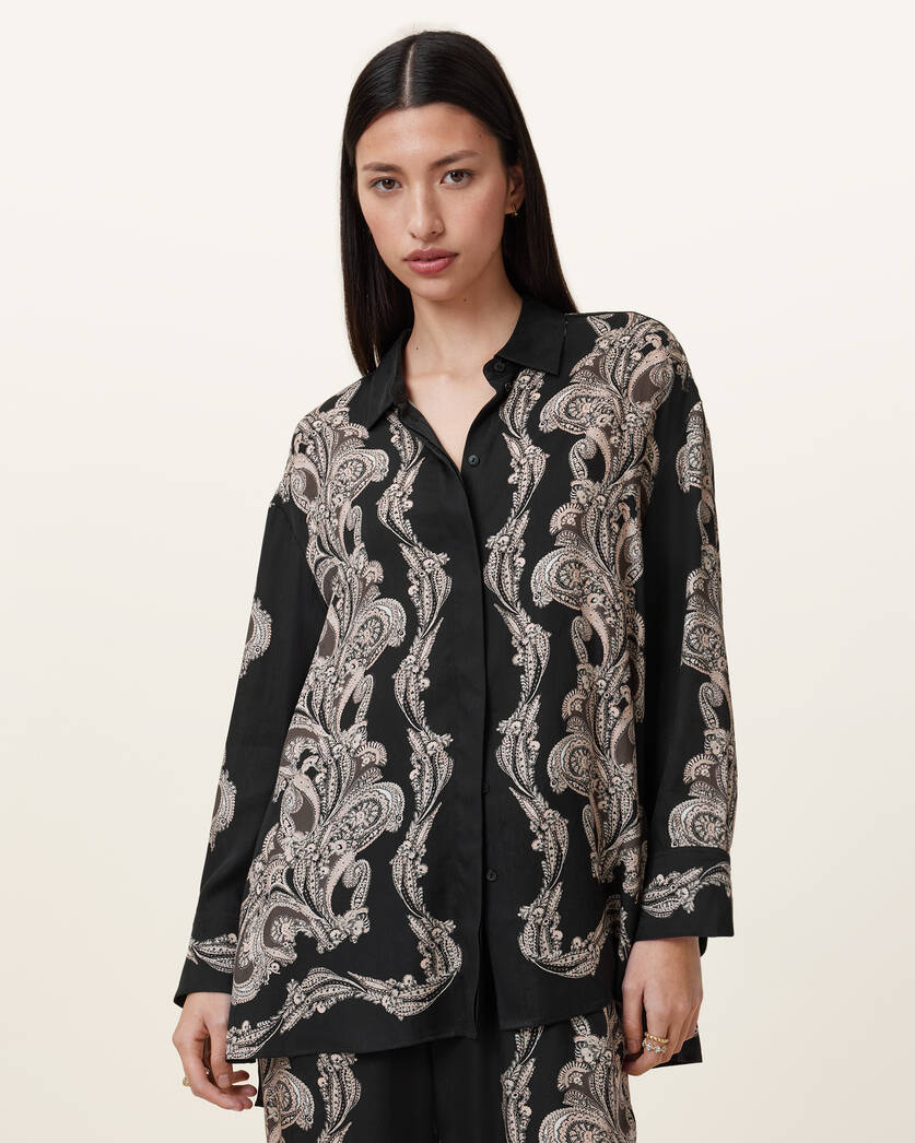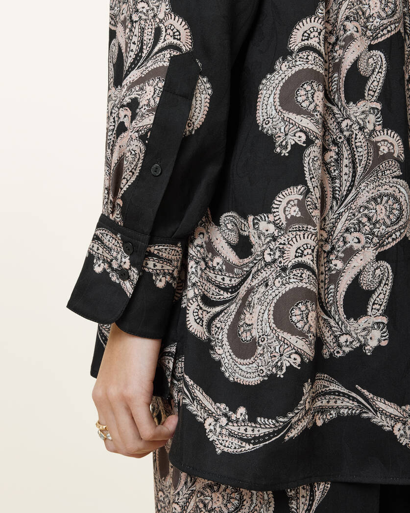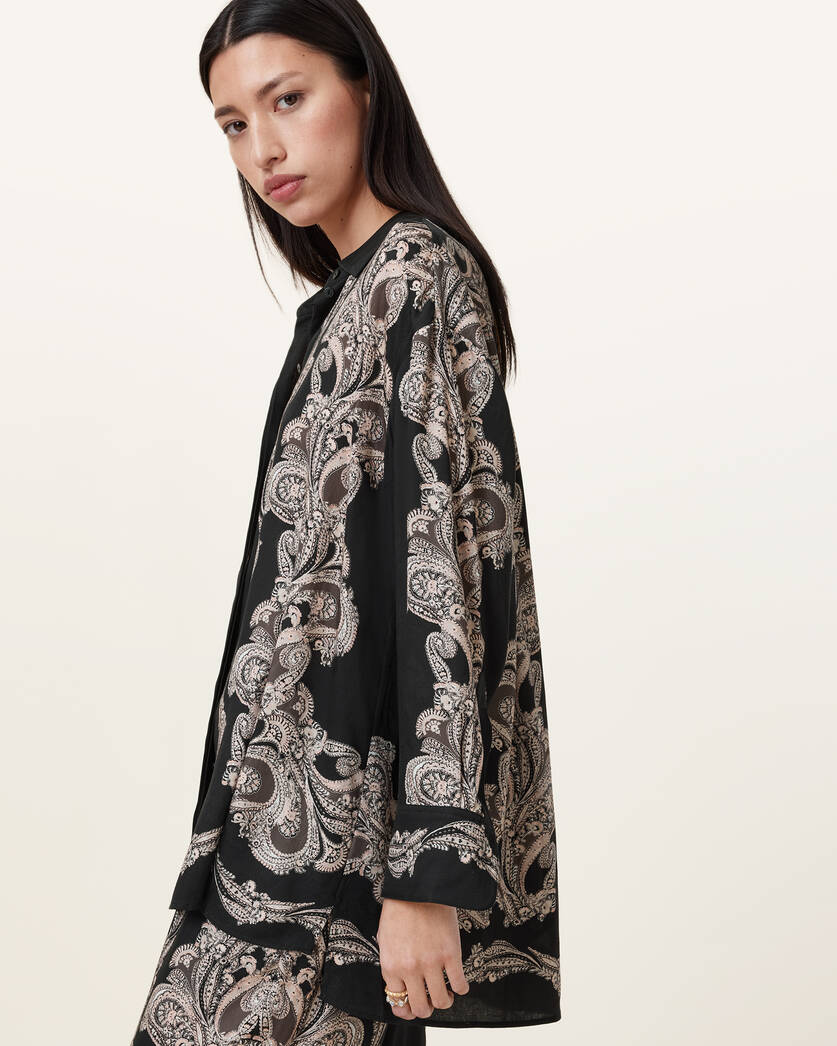 חולצה ארוכה לנשים מבית המותג אולסיינטס. בגזרה רחבה, עם כפתורי סגירה לכל האורך, צווארון ושרוולים ארוכים. בשילוב הדפס מיוחד לאורך כל החולצה.