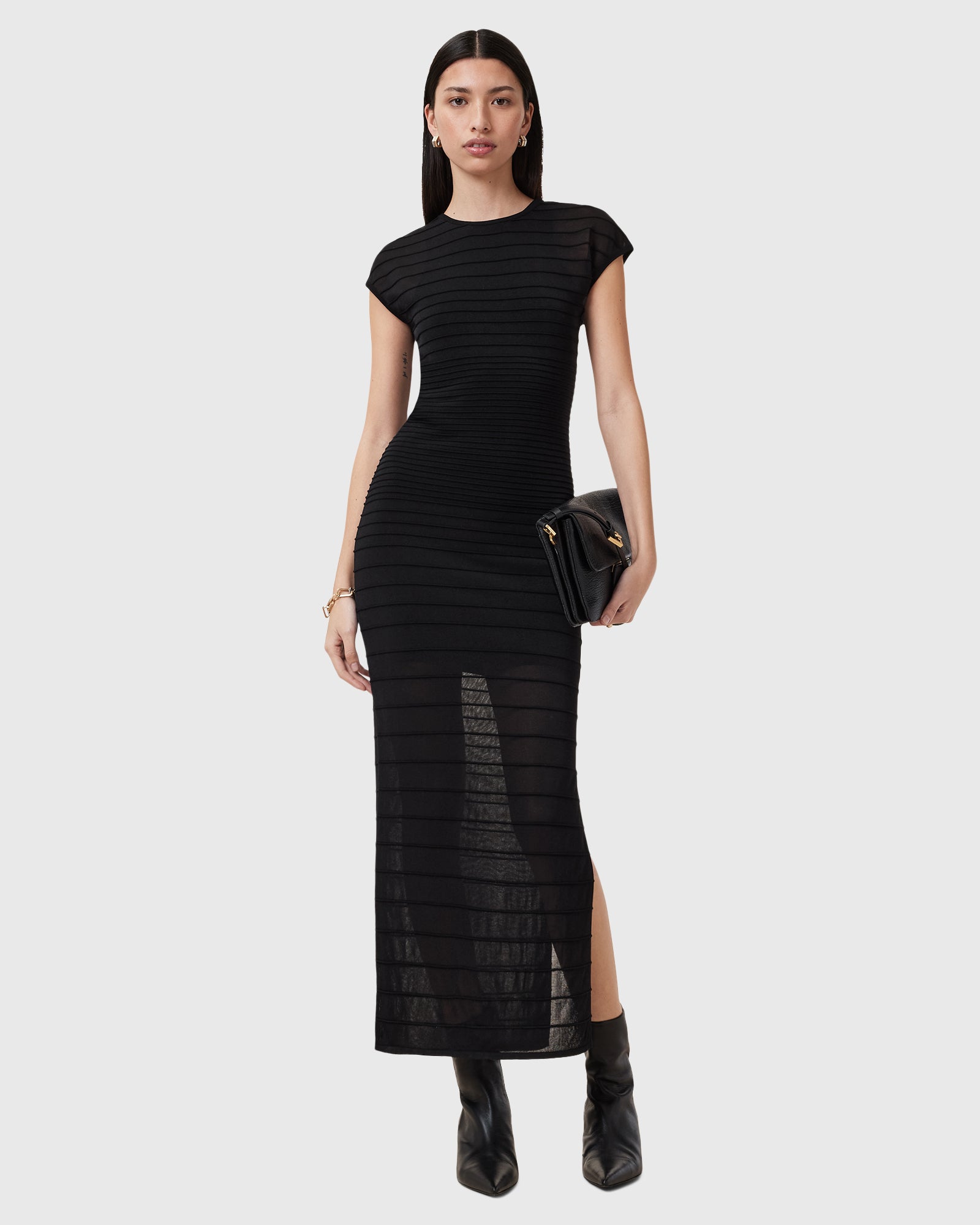 שמלת מקסי לנשים מבית המותג אולסיינטס. בגזרה צמודה, עם שרוולים מקוצרים ושסע קטן.