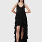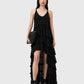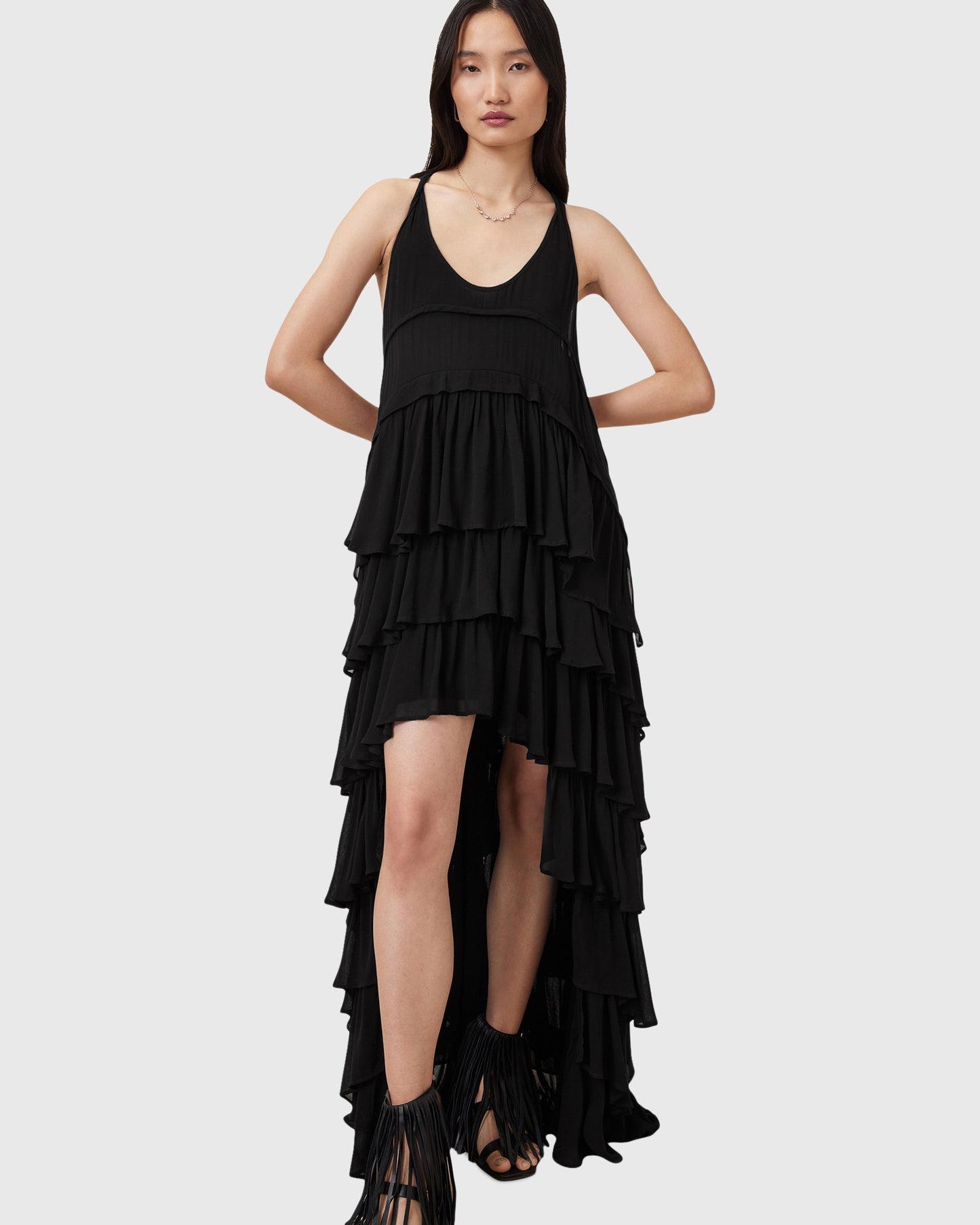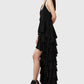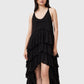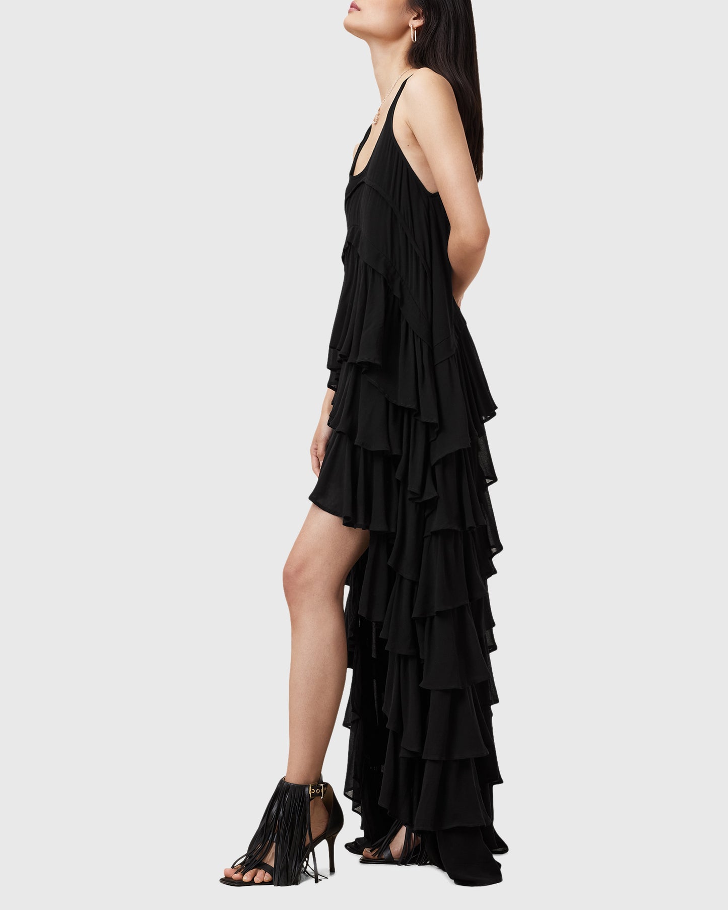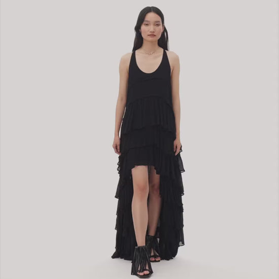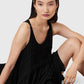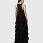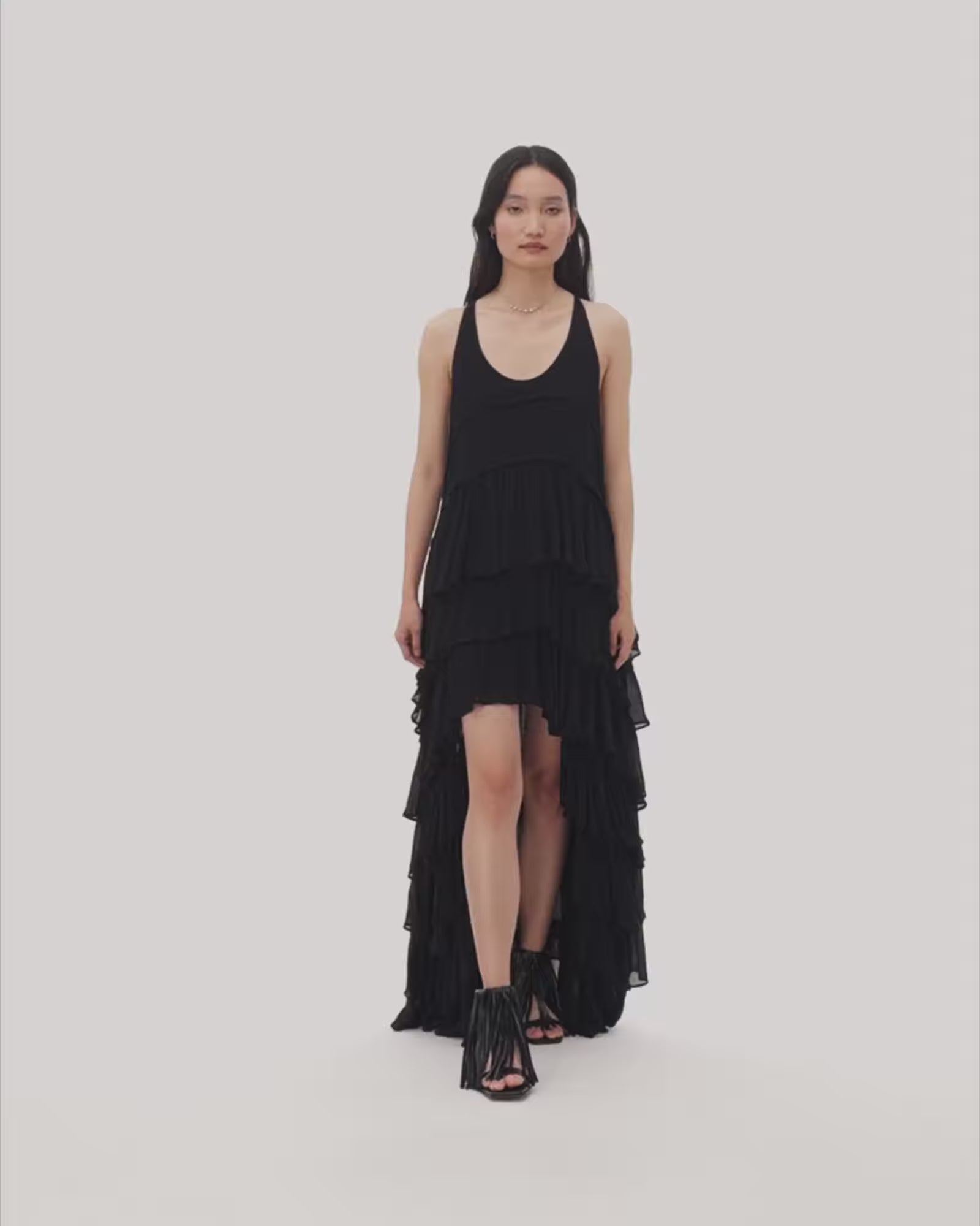 בגזרה משוחררת ומתרחבת, עשויה שכבות רבות של בד נשפך המעניקות נפח ותנועה דרמטית. עם מפתח עגול וכתפיות דקות.