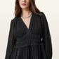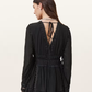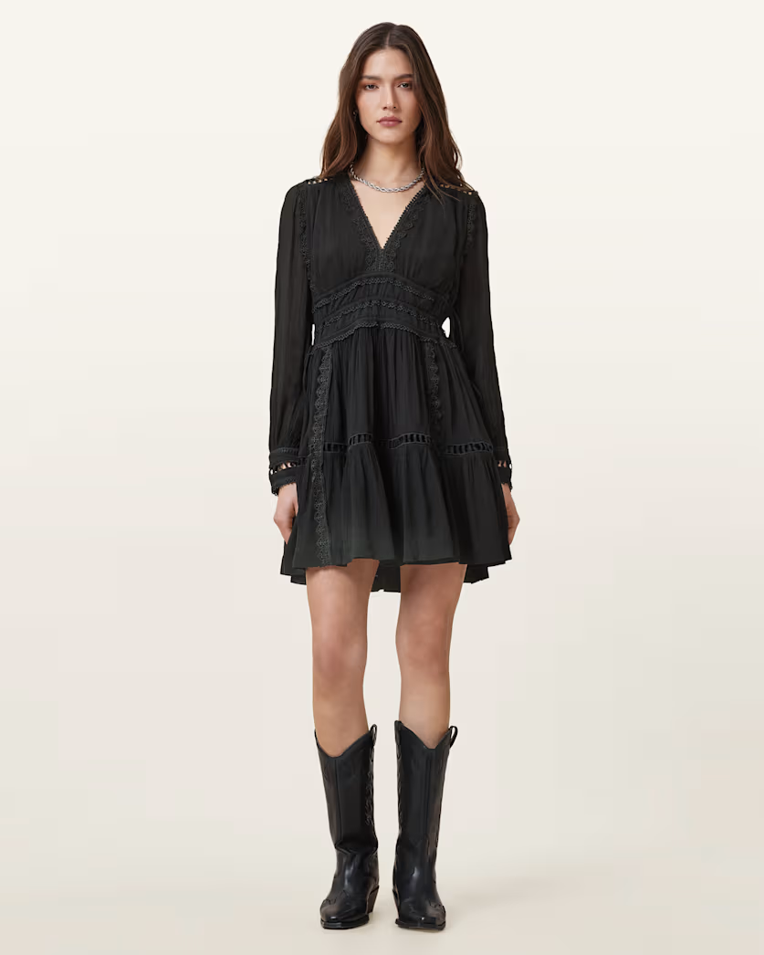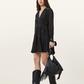 שמלת מיני לנשים מבית המותג אולסיינטס. בגזרה משוחררת, עם מפתח וי, שרוולים ארוכים, עם הצרה במותן. וקשירה בגב.