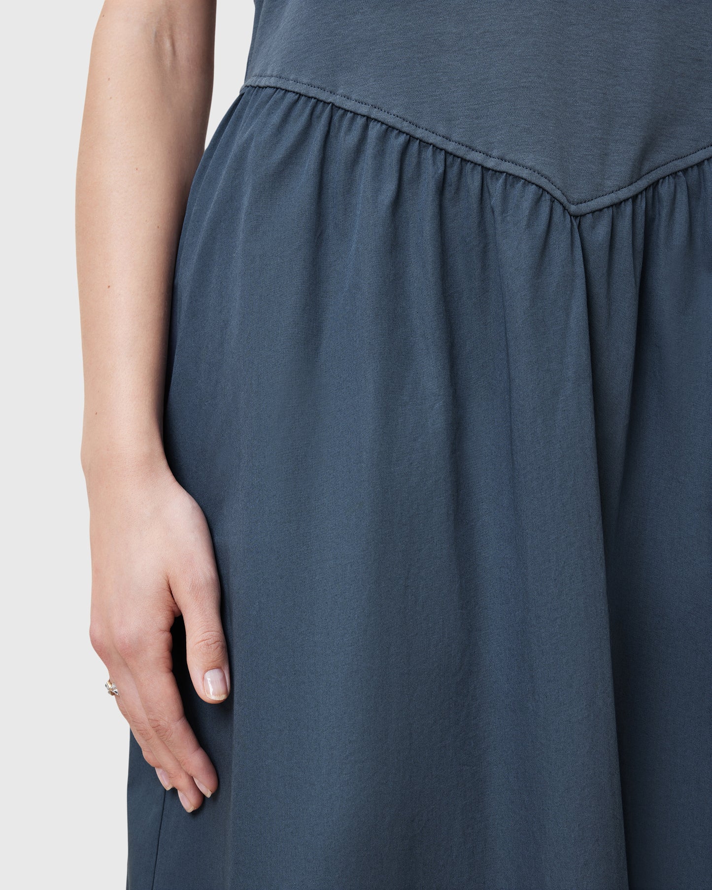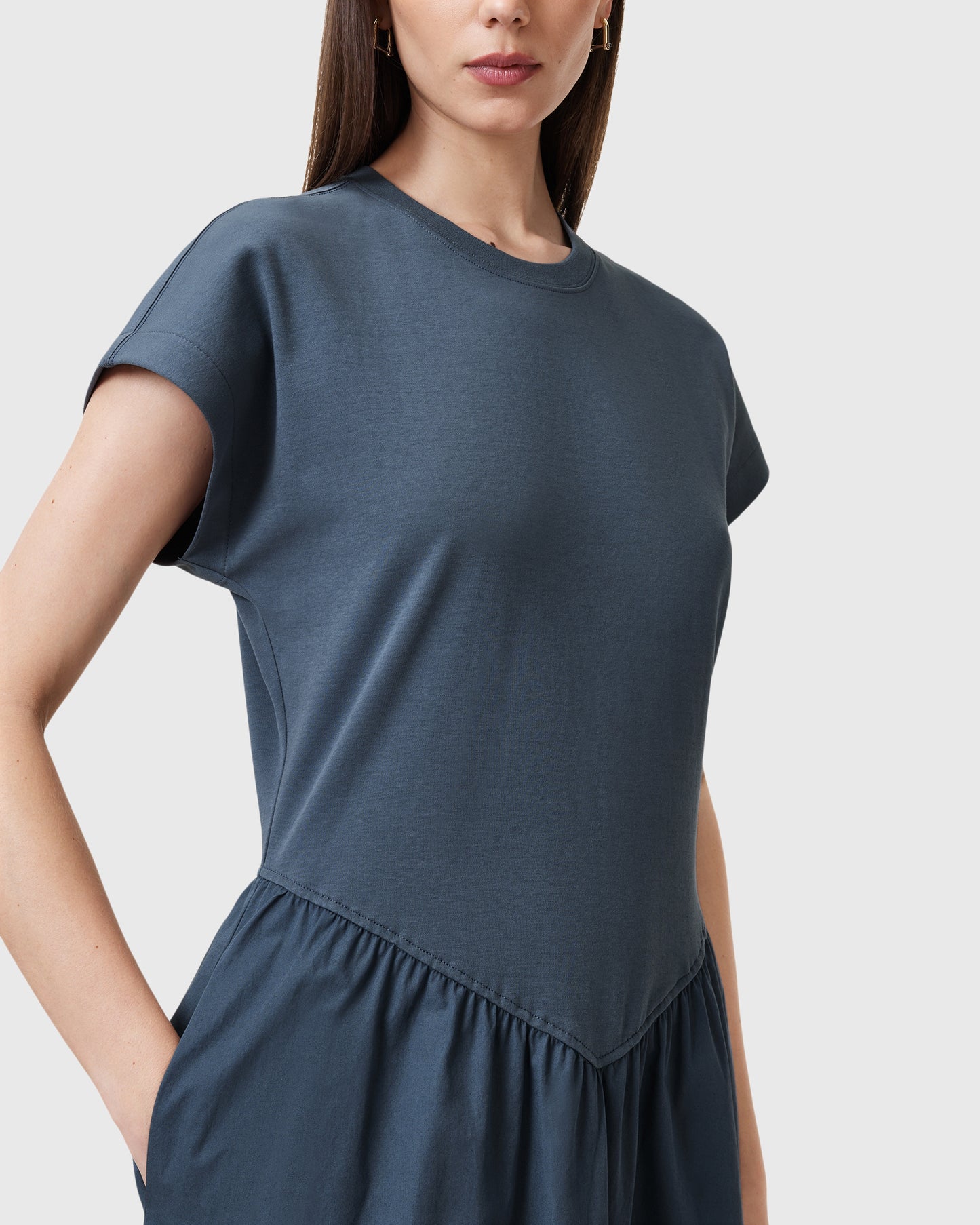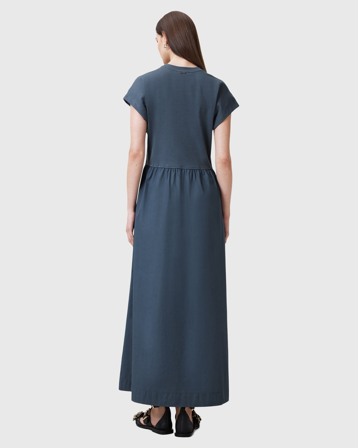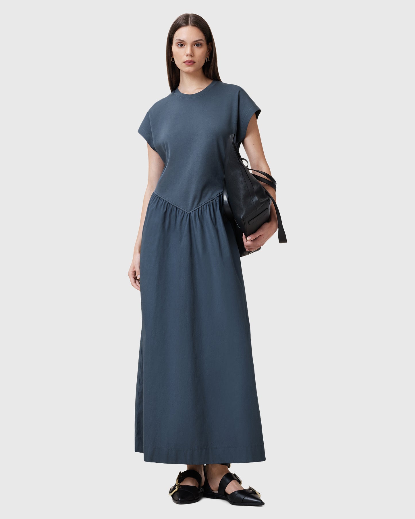 שמלת מקסי לנשים מבית המותג אולסיינטס. בגזרה משוחררת, עם מפתח עגול ושרוולים קצרים ועומדים, עם הצרה בצורת מושלש באזור הבטן שמעניקה מראה מחמיא יותר, חצאית השמלה רחבה יותר. .