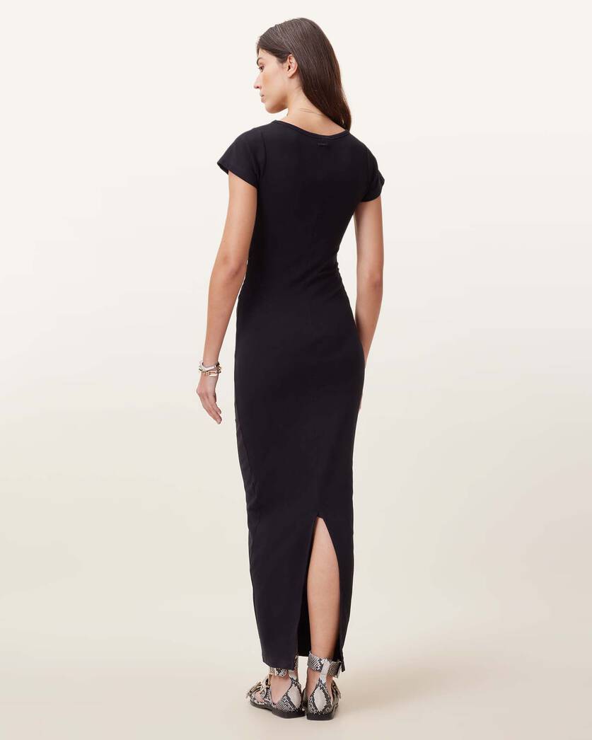 שמלת מקסי לנשים מבית המותג אולסיינטס. בגזרת סלים עם מפתח ישר וצמוד, שרוולים קצרים חתוכים, עם כיווץ במותן שמעניק מראה מחמיא יותר ושסע אחורי תחתון.