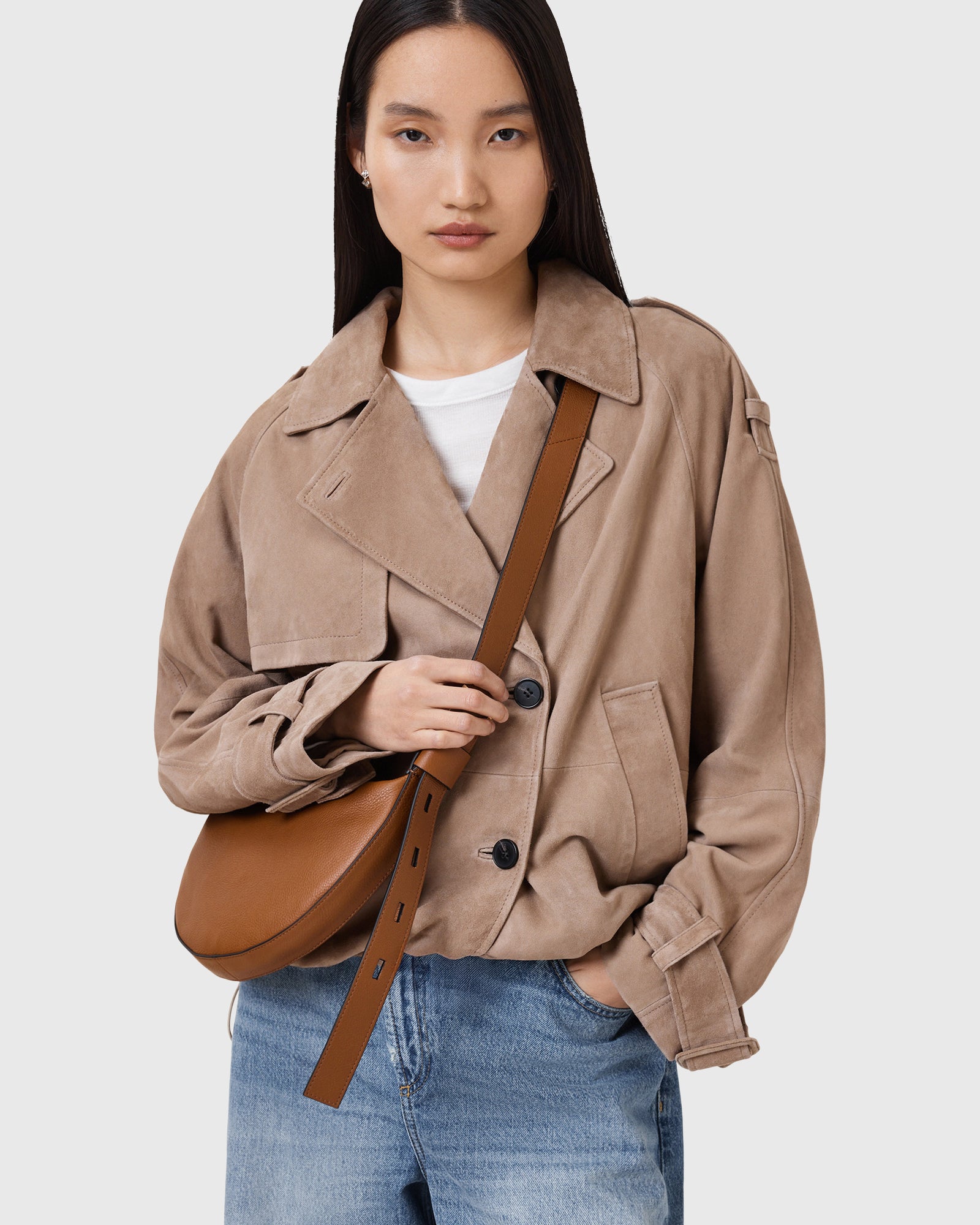 תיק צד לנשים מבית המותג אולסיינטס. בגזרת חצי עיגול עם רצועה עבה ומתכווננת, בסגירת רוכסן ובשילוב שני כיסים פנימיים.