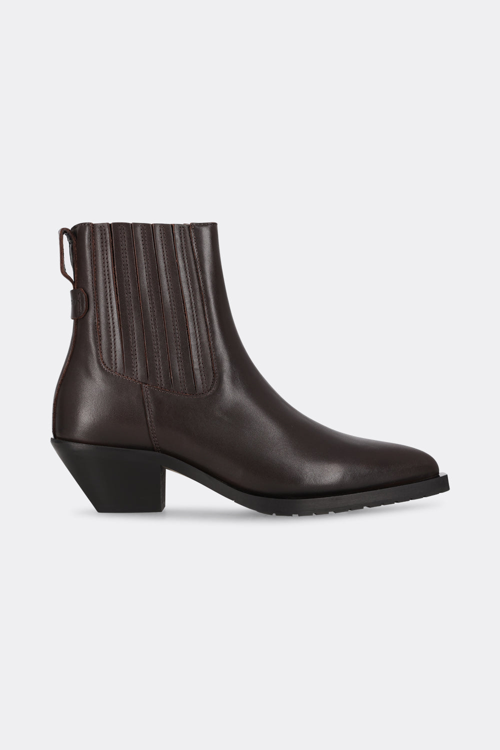 מגפוני עור בצבע חום כהה בגזרה חלקה ללא סגירה, עם חרטום מחודד ועקב בינוני יציב.