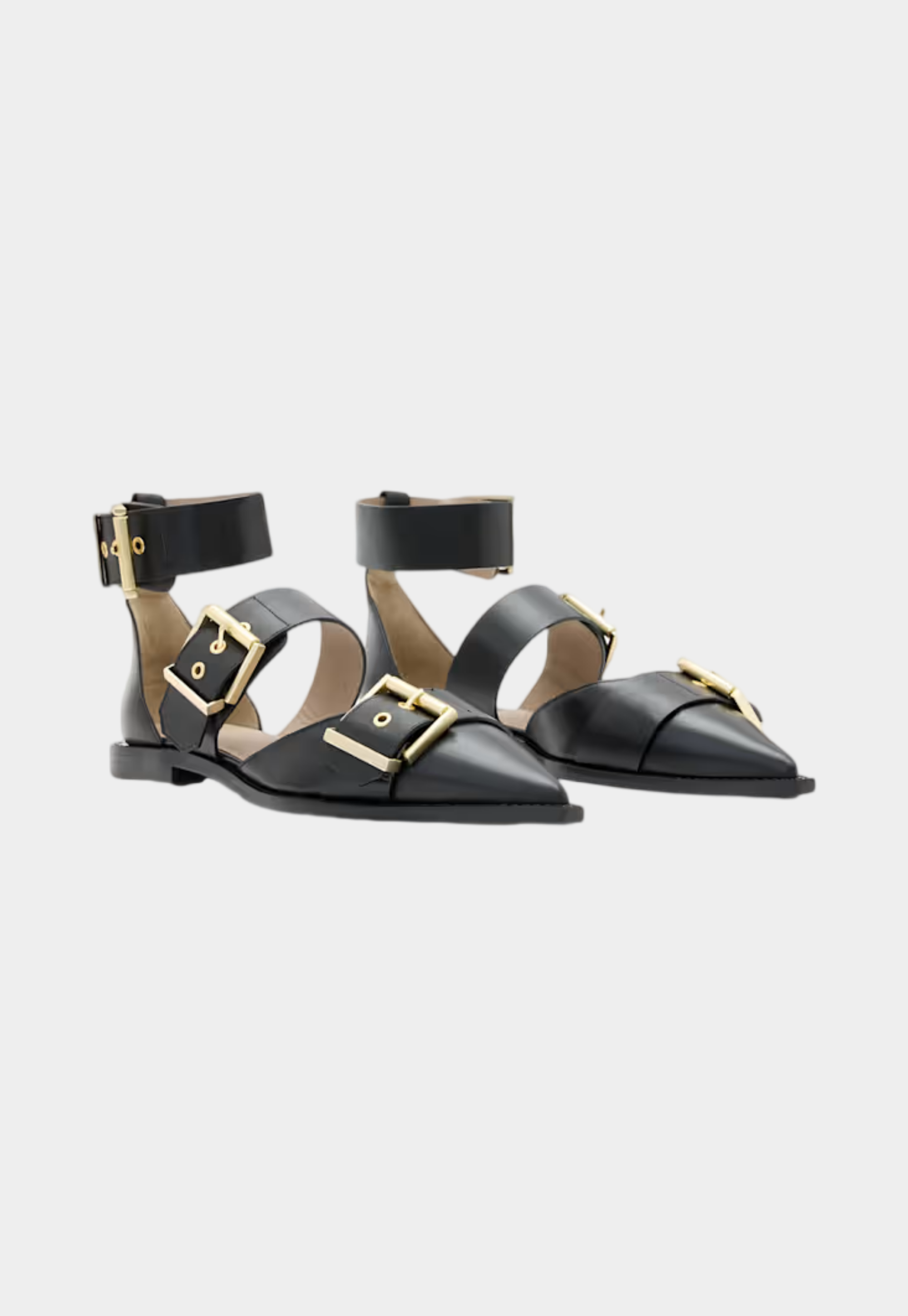סנדלים לנשים מבית המותג אולסיינטס. בגזה שטוחה, גימור מטאלי, אבזמי כסף וחרטום שפיץ.