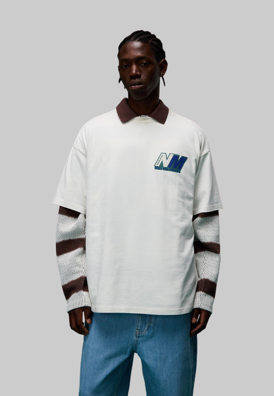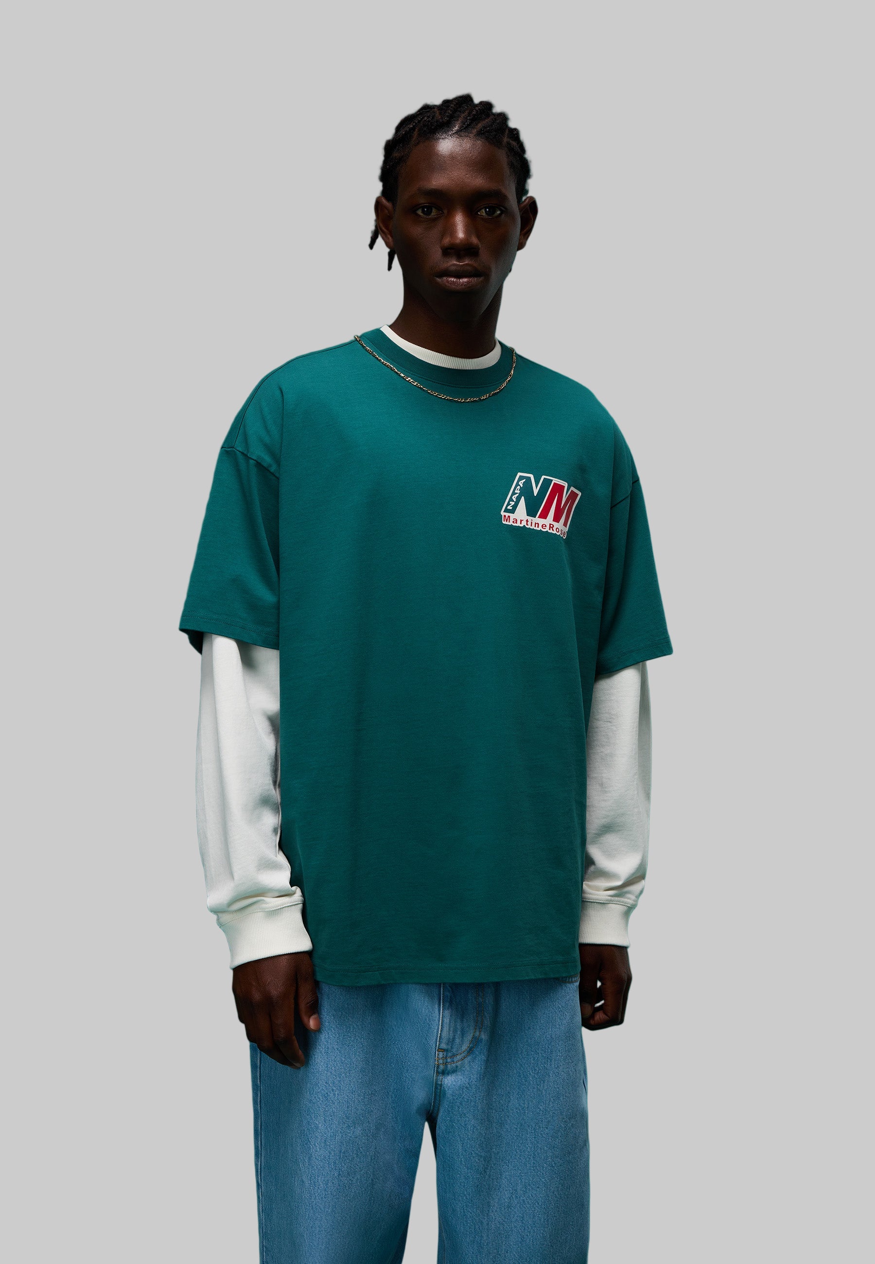 הגזרה משוחררת ומעניקה נפח ונוחות, עשויה בגזרת אוברסייז עם הדפס שיתופי בולט על החזה השמאלי.