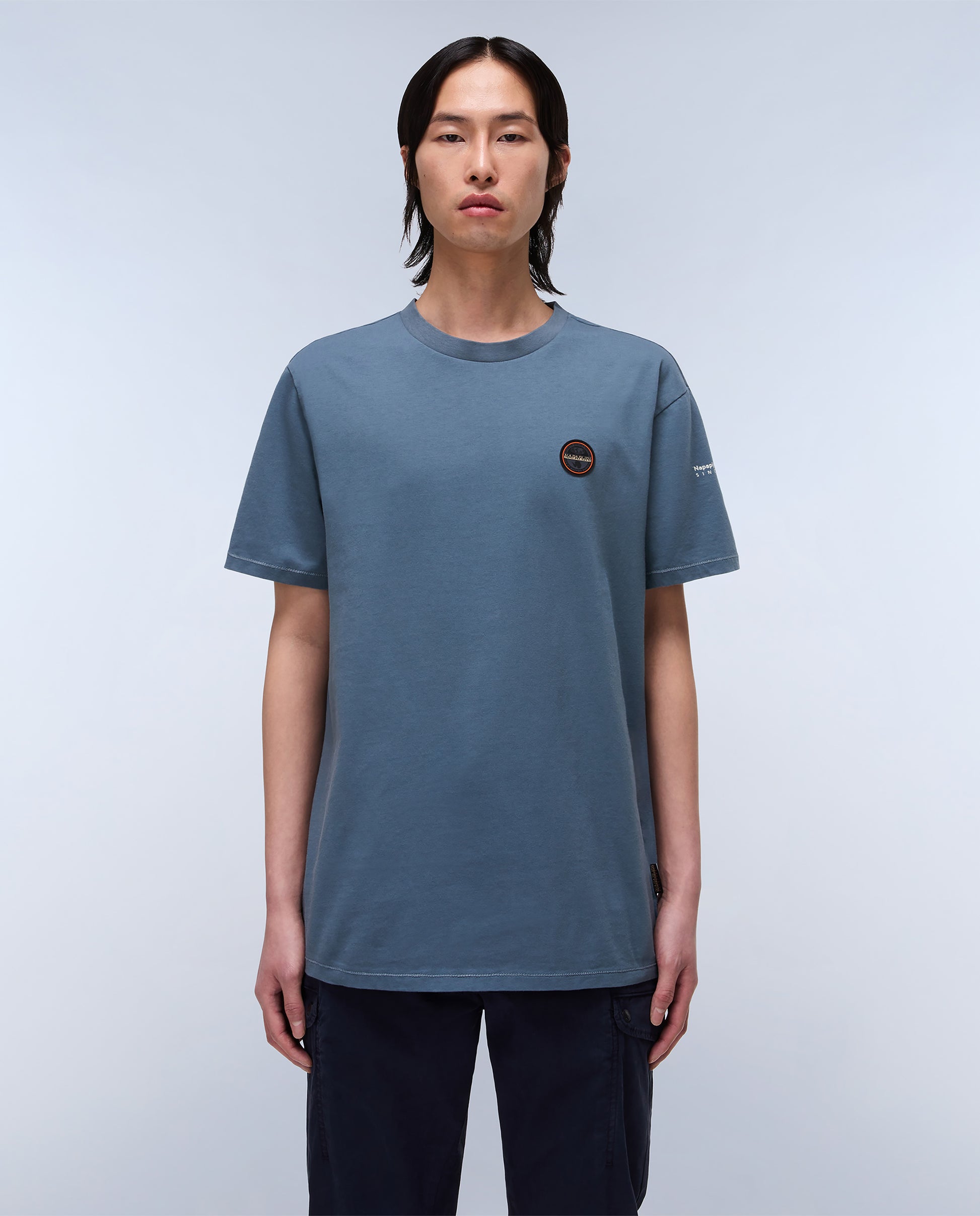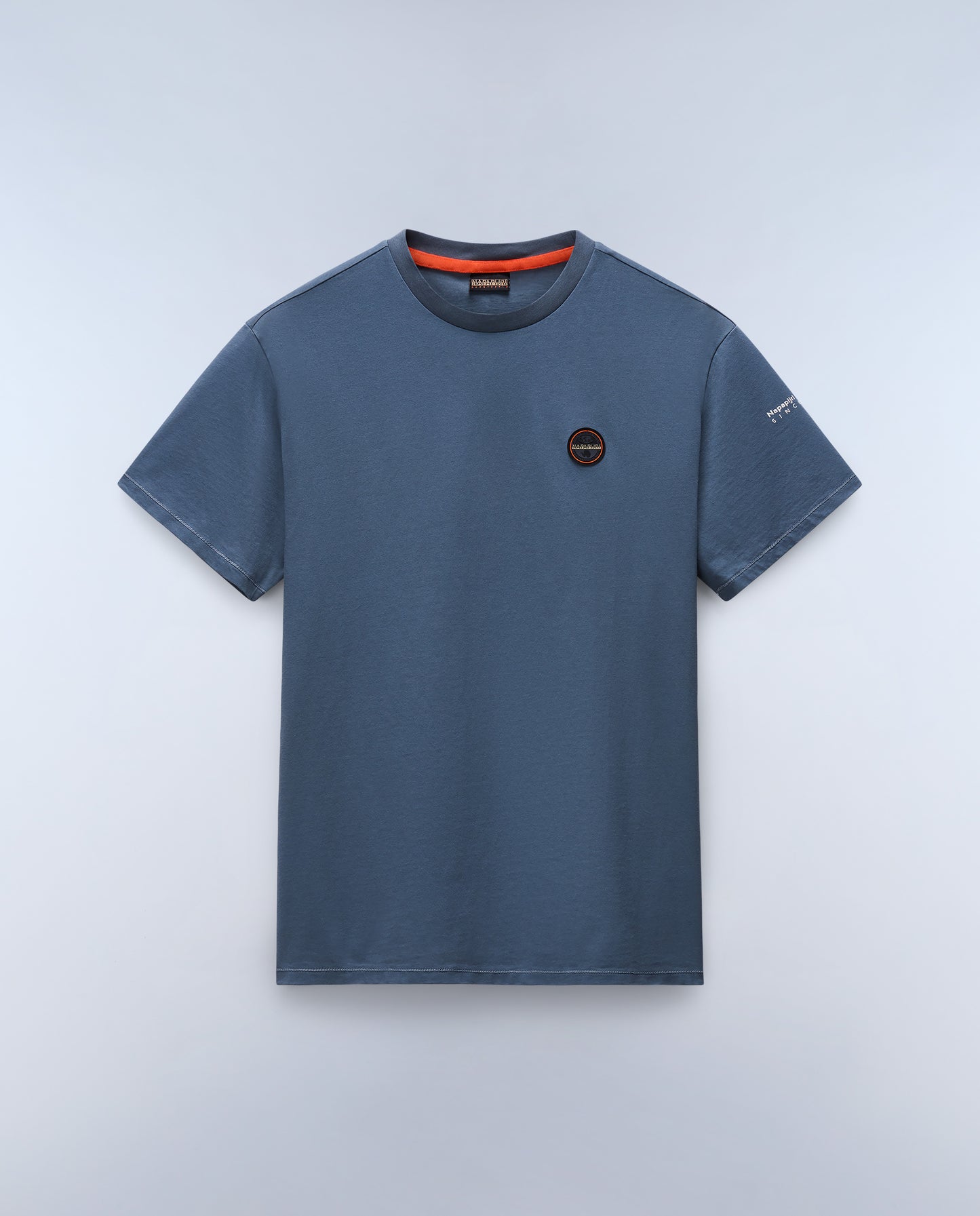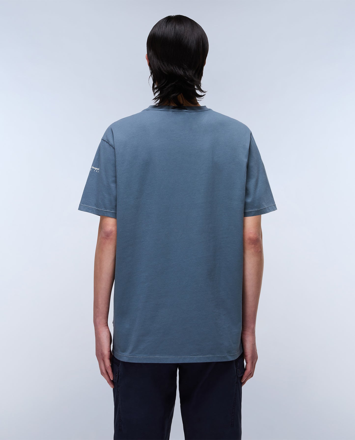 טי שירט קצרה לגברים מבית המותג נאפפירי. גזרה משוחררת עם מפתח עגול ושרוולים קצרים. פאץ' לוגו המותג בצד החזה והדפס בשרוול.
