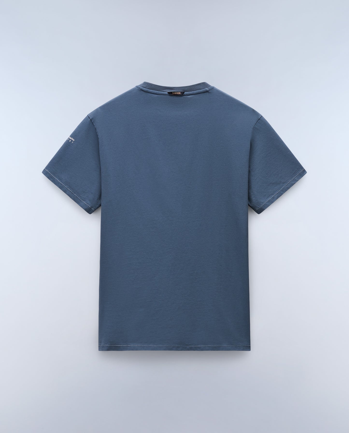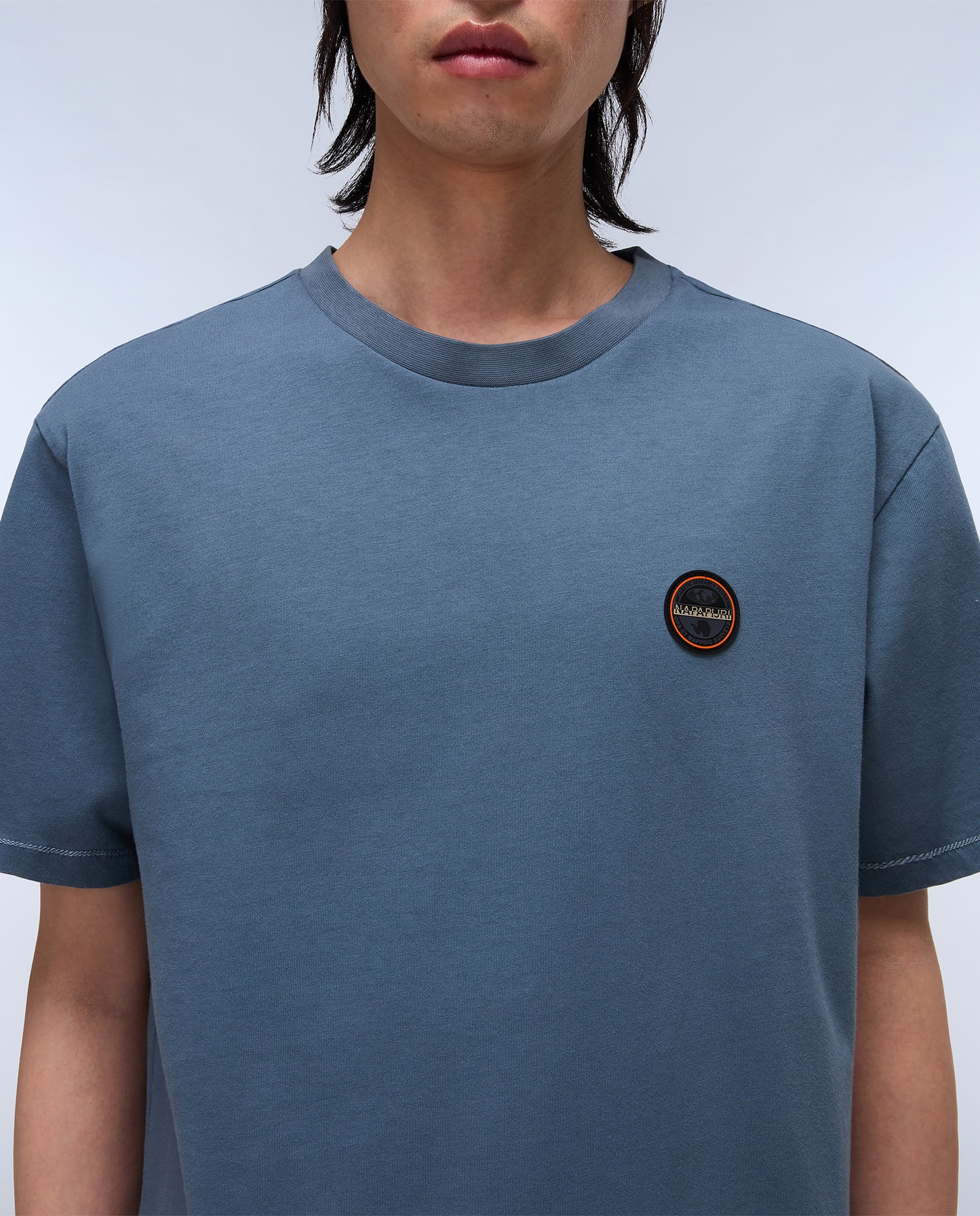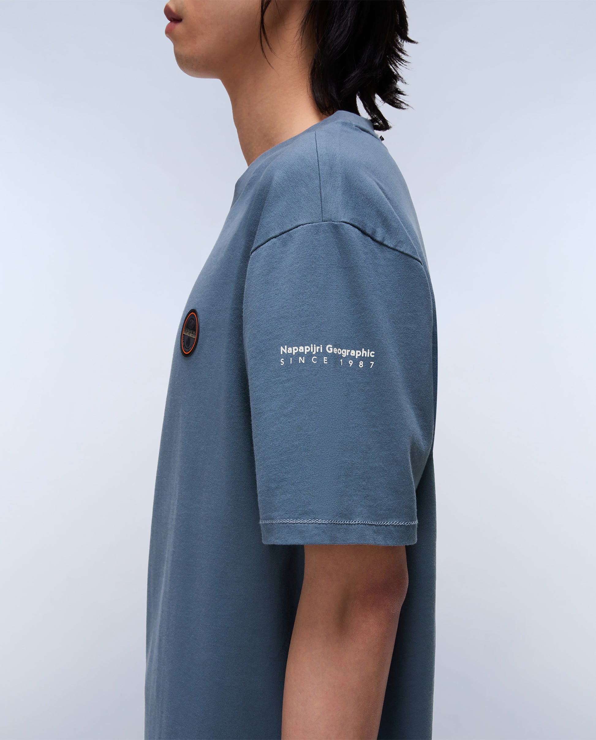 טי שירט קצרה לגברים מבית המותג נאפפירי. גזרה משוחררת עם מפתח עגול ושרוולים קצרים. פאץ' לוגו המותג בצד החזה והדפס בשרוול.