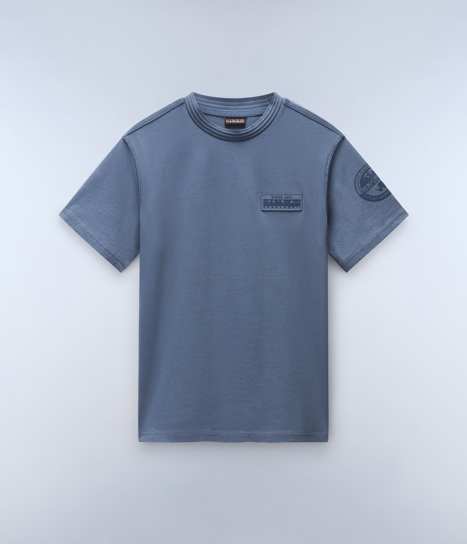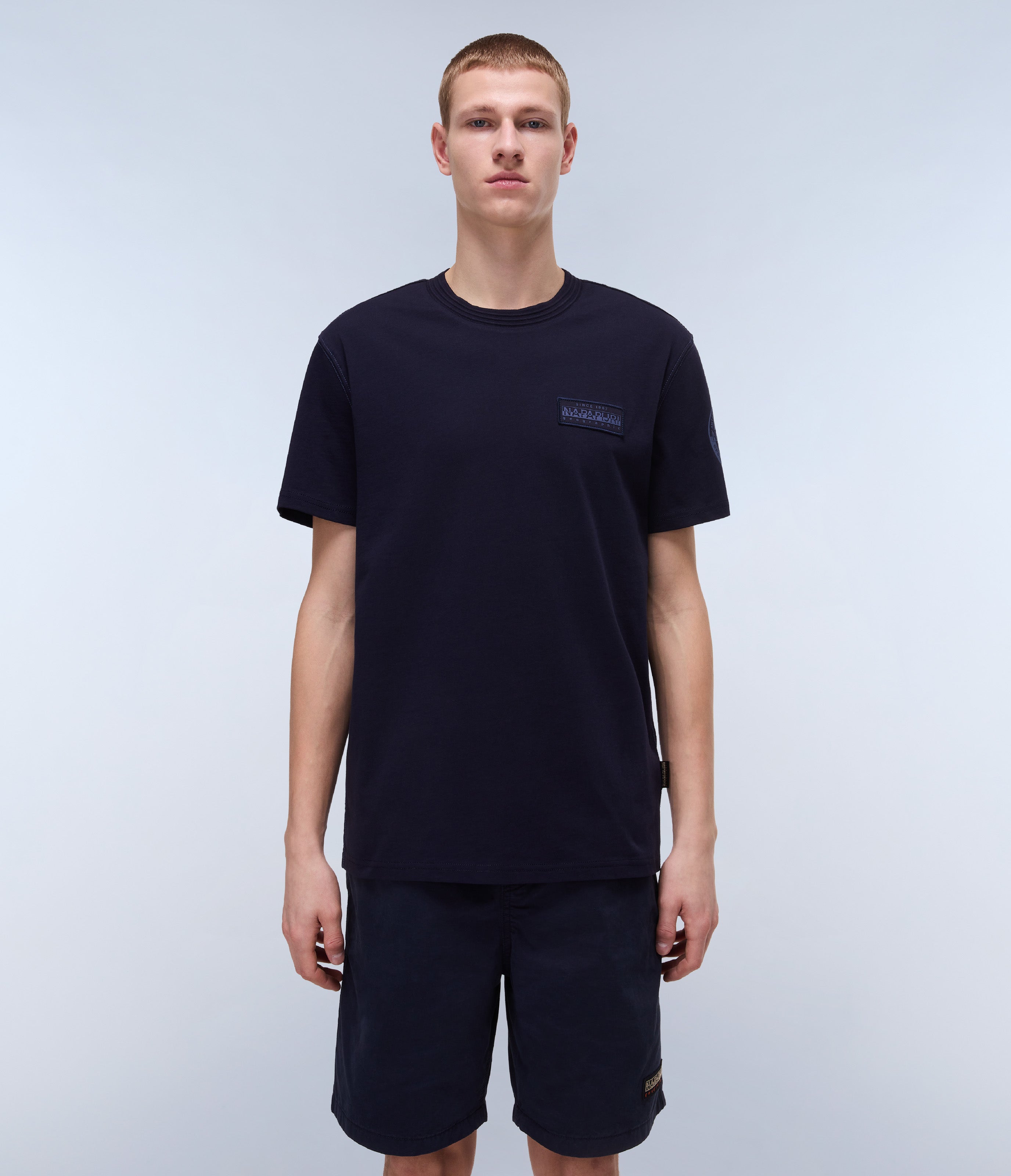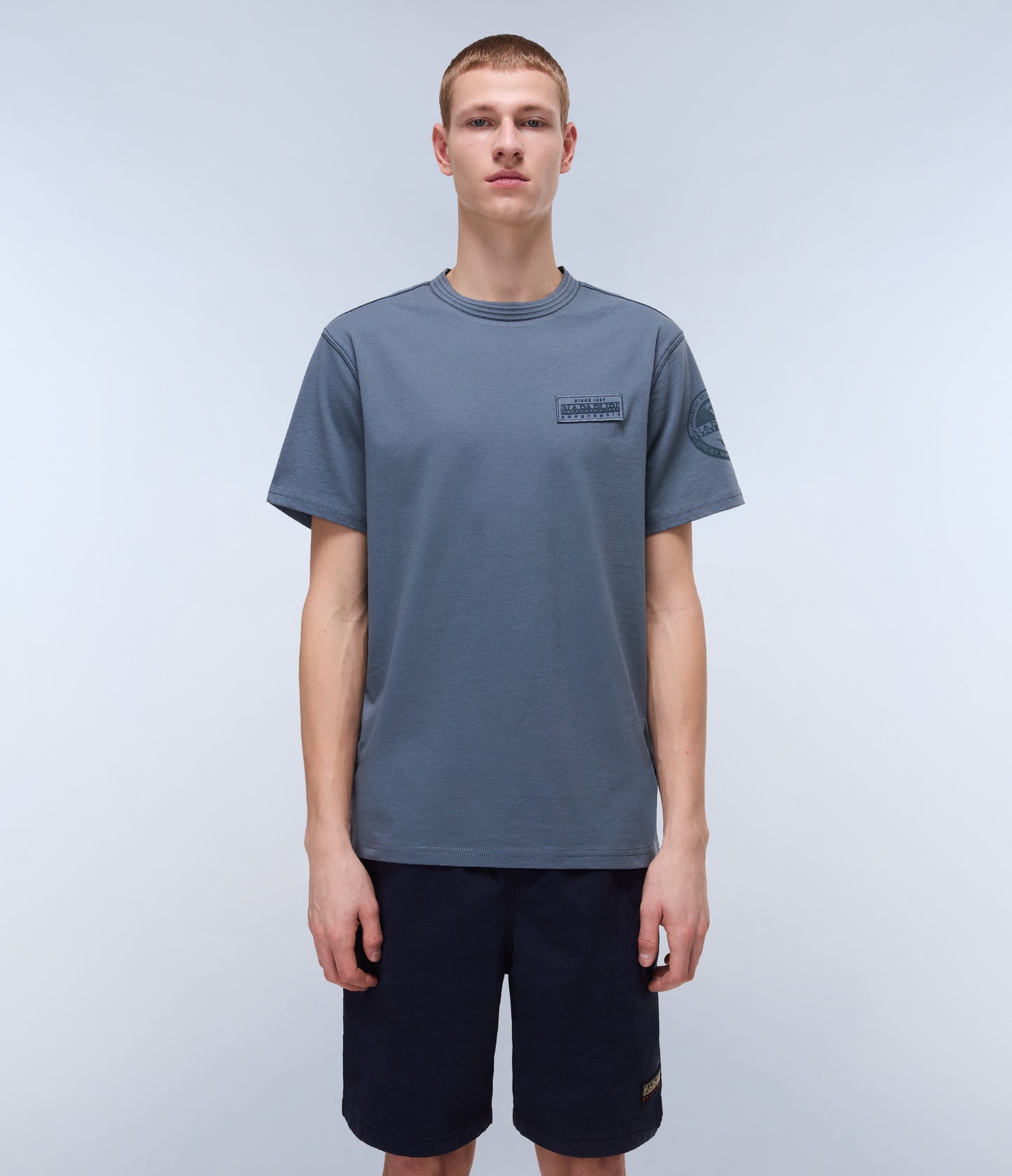טי שירט קצרה לגברים מבית המותג נאפפירי. בגזרה קלאסית, עם מפתח עגול, שרוולים קצרים, בשילוב לוגו המותג בצד החזה ובכתף.