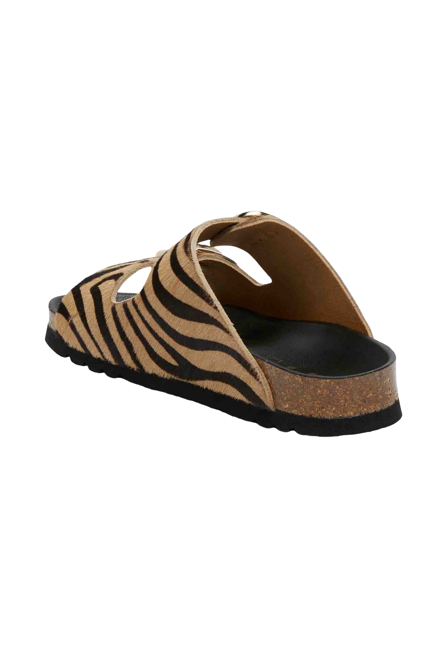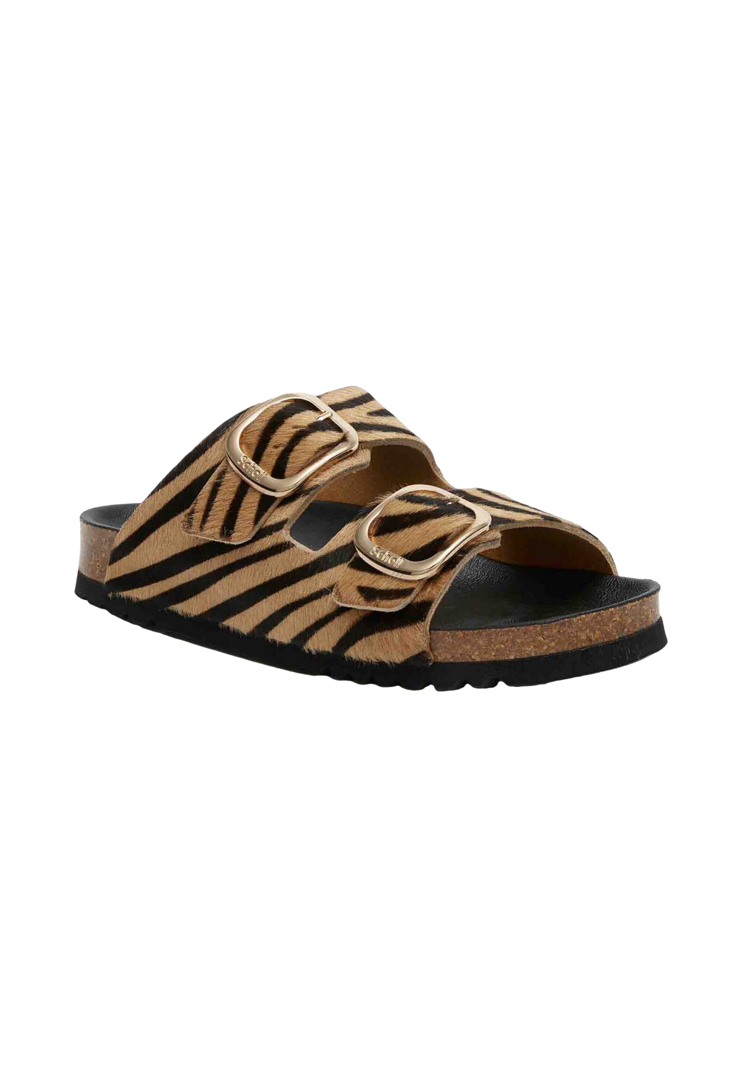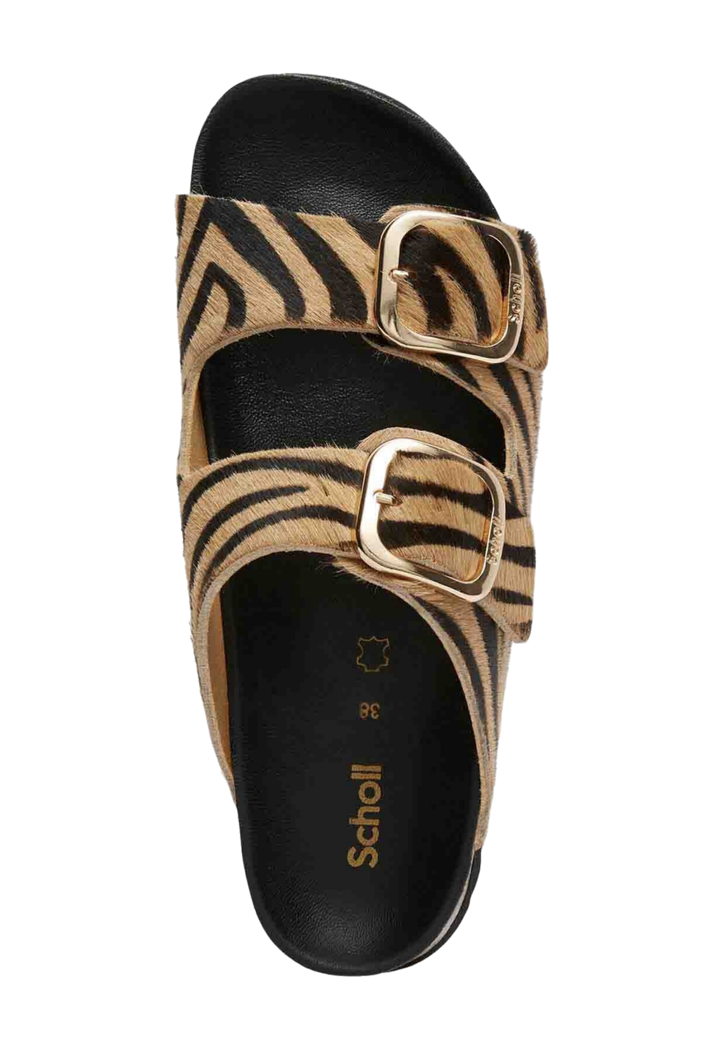 כפכפים לנשים מבית המותג שול. בגזרה קלאסית עם שתי רצועות רחבות בשילוב אבזם, עם סוליה משוננת. בהדפס זברה.