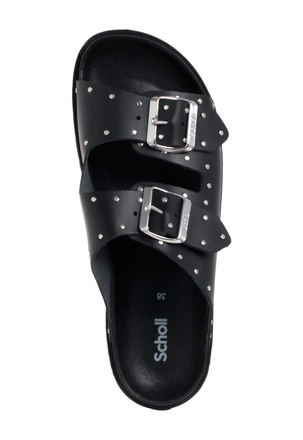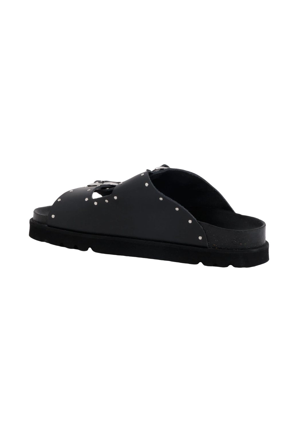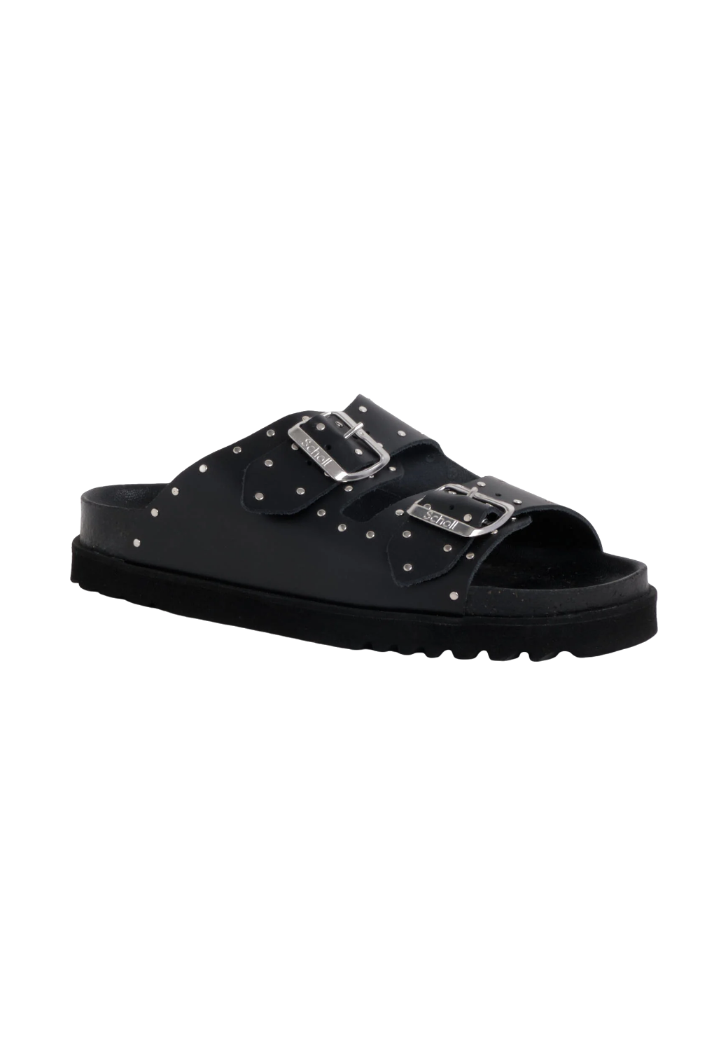 כפכפים לנשים מבית המותג שול אייקוניק. בגזרת שתי רצועות עור בשילוב ניטים כסופים ואבזמים. עם סוליה משוננת בגובה 3.5 ס"מ.