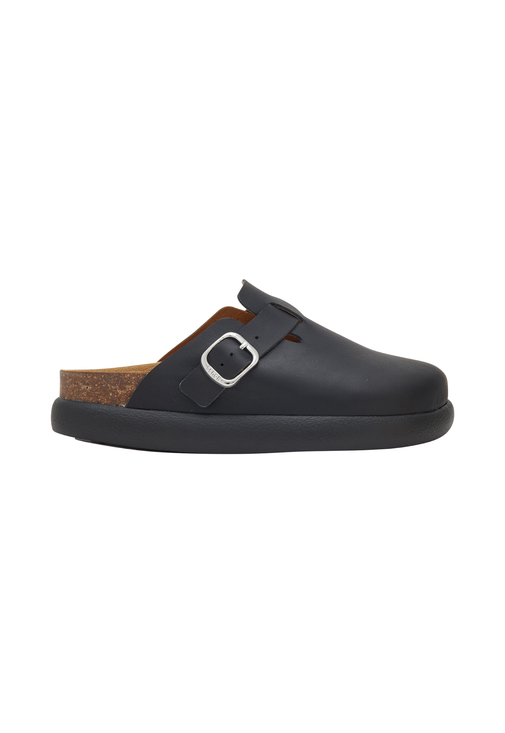 בגזרת קלוגס, החלק העליון עשוי עור, בשילוב רצועה עם אבזם כסוף, וסוליה צ'אנקית.