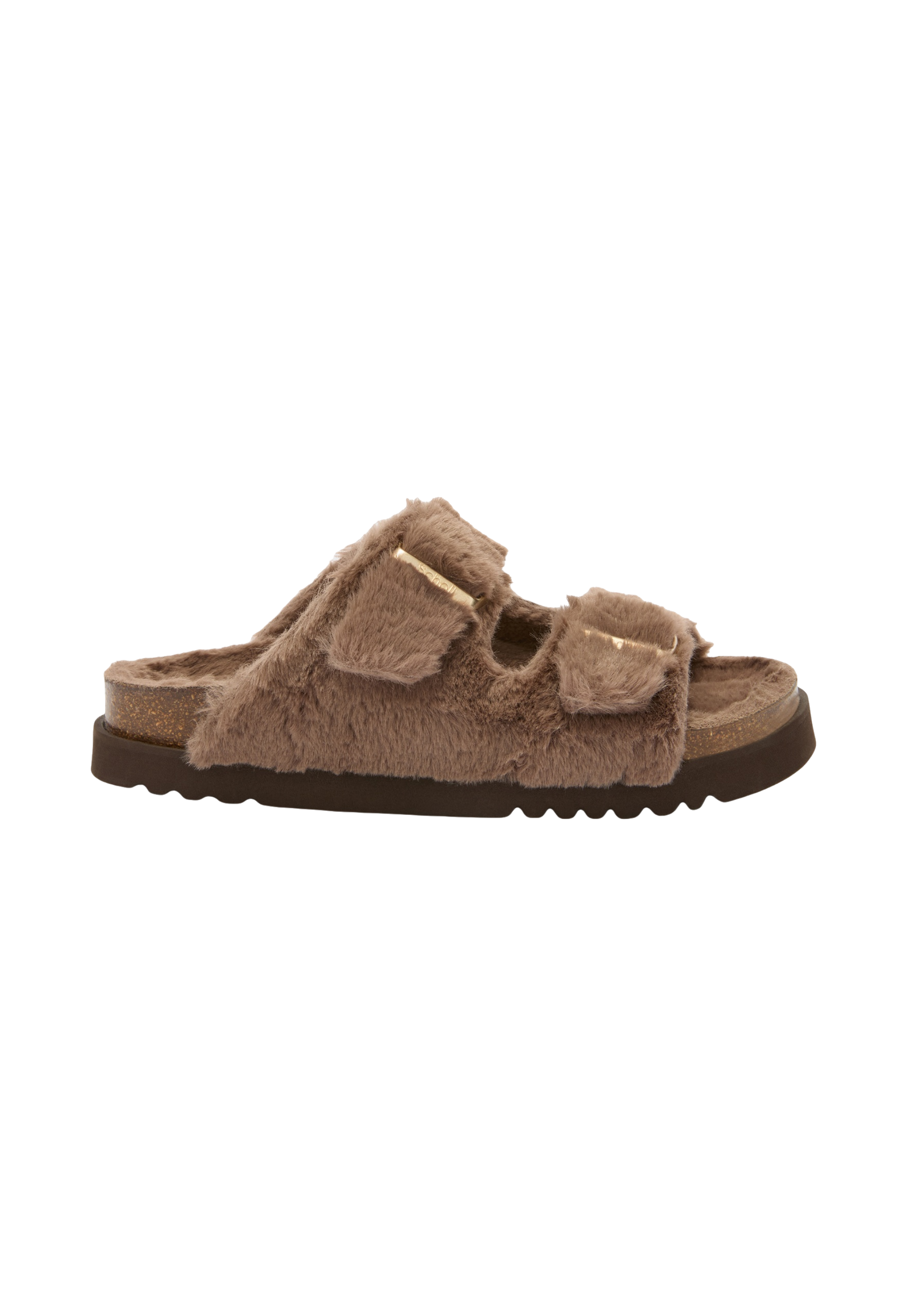 כפכפי מיול לנשים מבית המותג שול. בעלי שתי רצועות קדמיות עם אבזם כסף, סוליה משוננת ופרווה אול אובר.