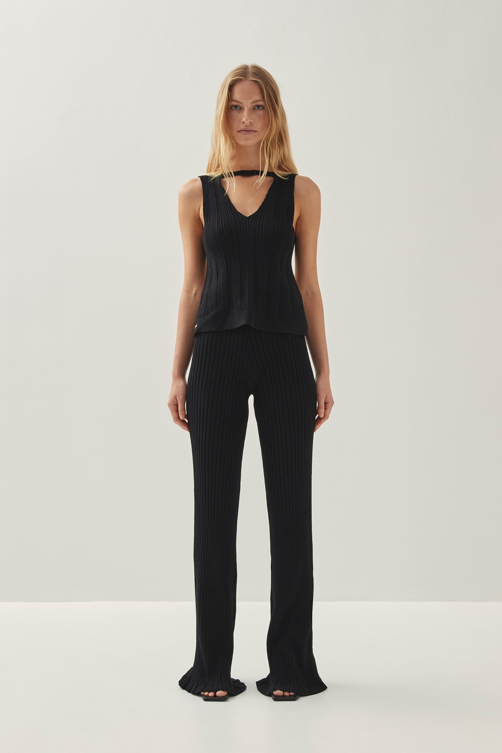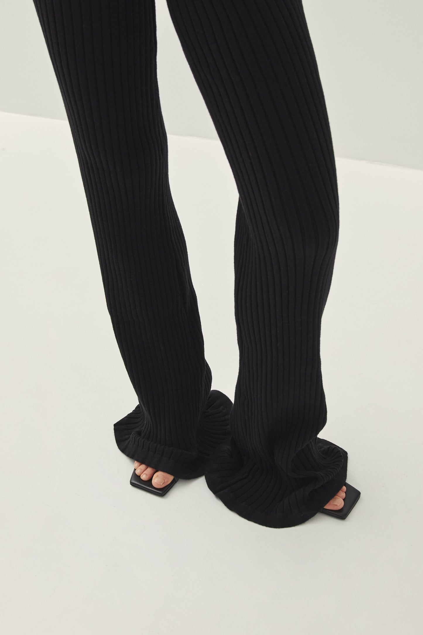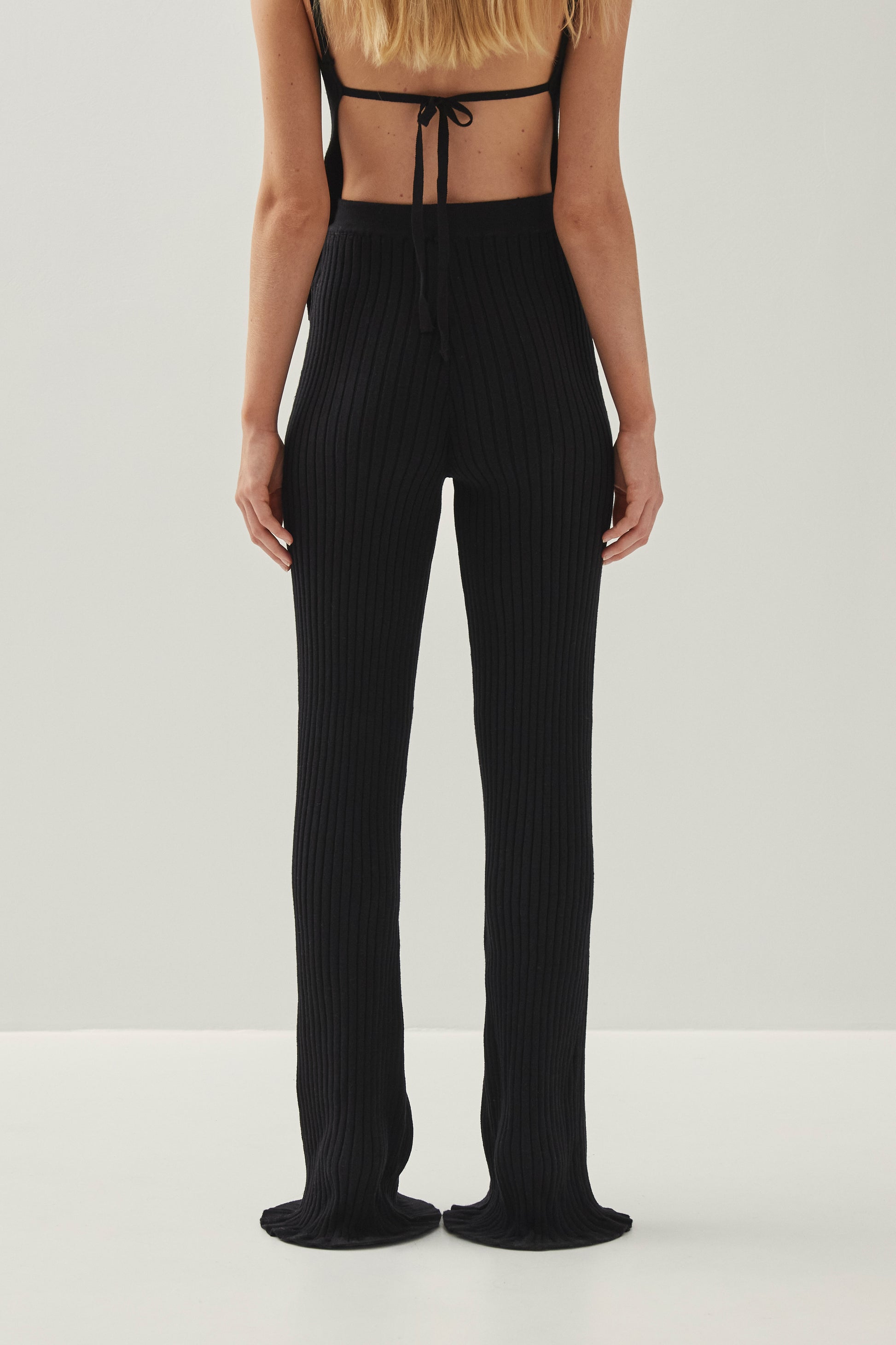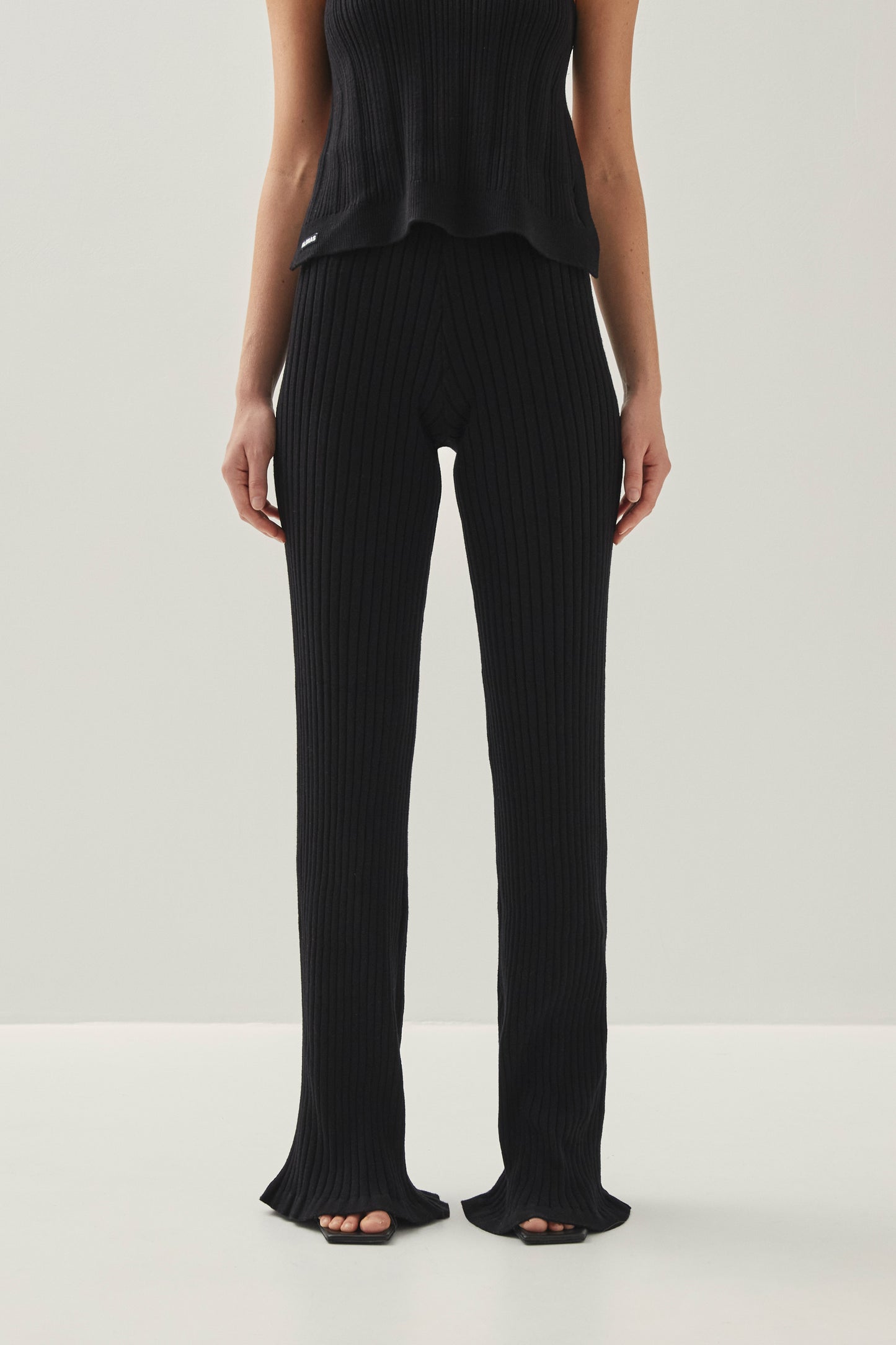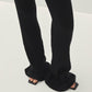 מכנסיים ארוכים לנשים מבית המותג אלוהס. בגזרה צמודה ומתרחבת, עם גומי במותן ובמרקם ריב. המכנסיים ארוכים ונשפכים בסיומת.