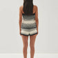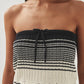 גופיית סטרפלס קיצית בסריגה לנשים מבית המותג אלוהס .בדוגמת פסים בשחור ושמנת, וגומי באזור החזה עם קשירה חזיתית.