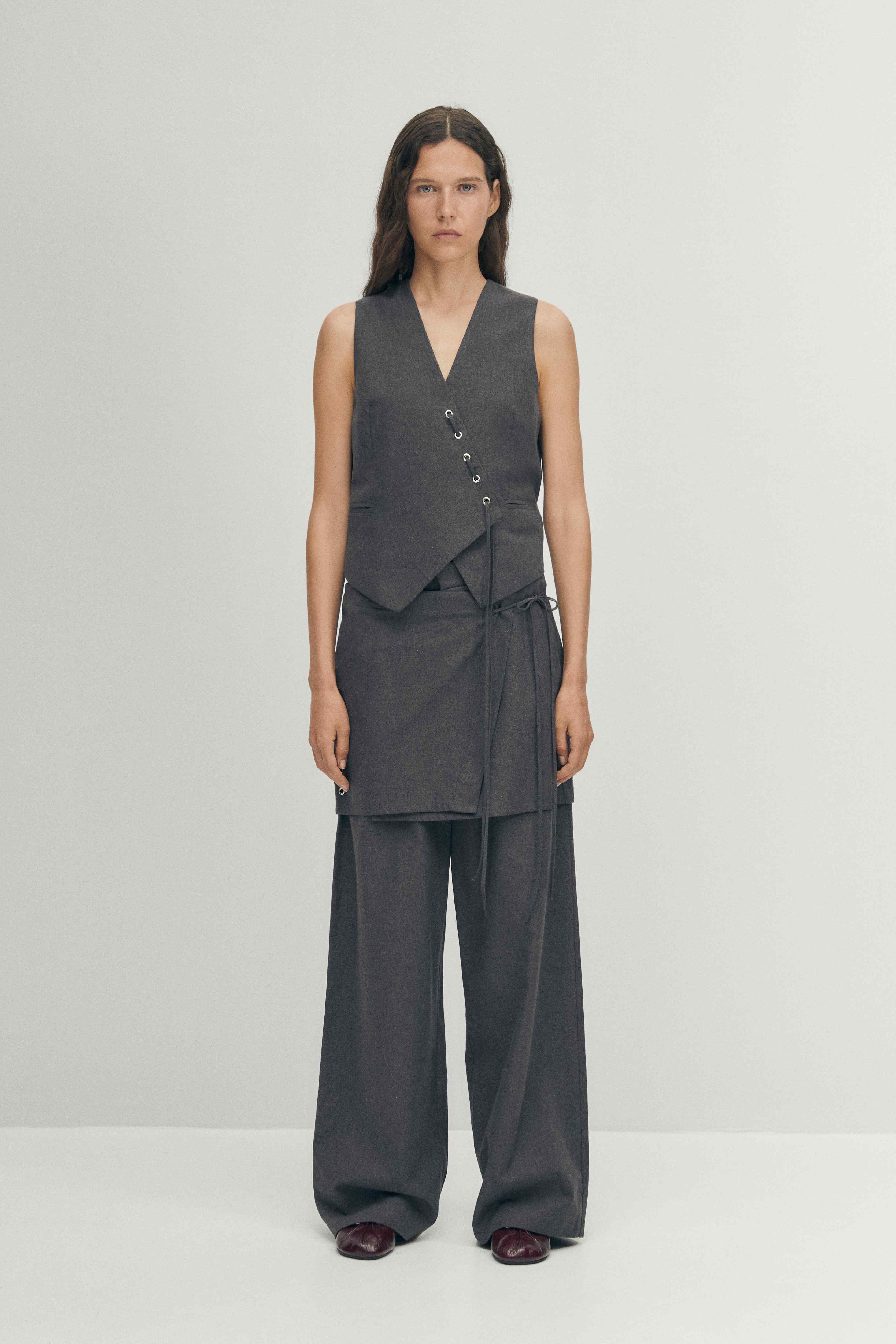 עשוי דנים אפור רך במראה שטוף קלות, עם גזרה ישרה ומפתח V עמוק שמעניק מראה אלגנטי וקליל. כולל כיסים קדמיים, סגירה כפולה עם כפתורים ולולאות צד לקשירה להתאמה אישית.