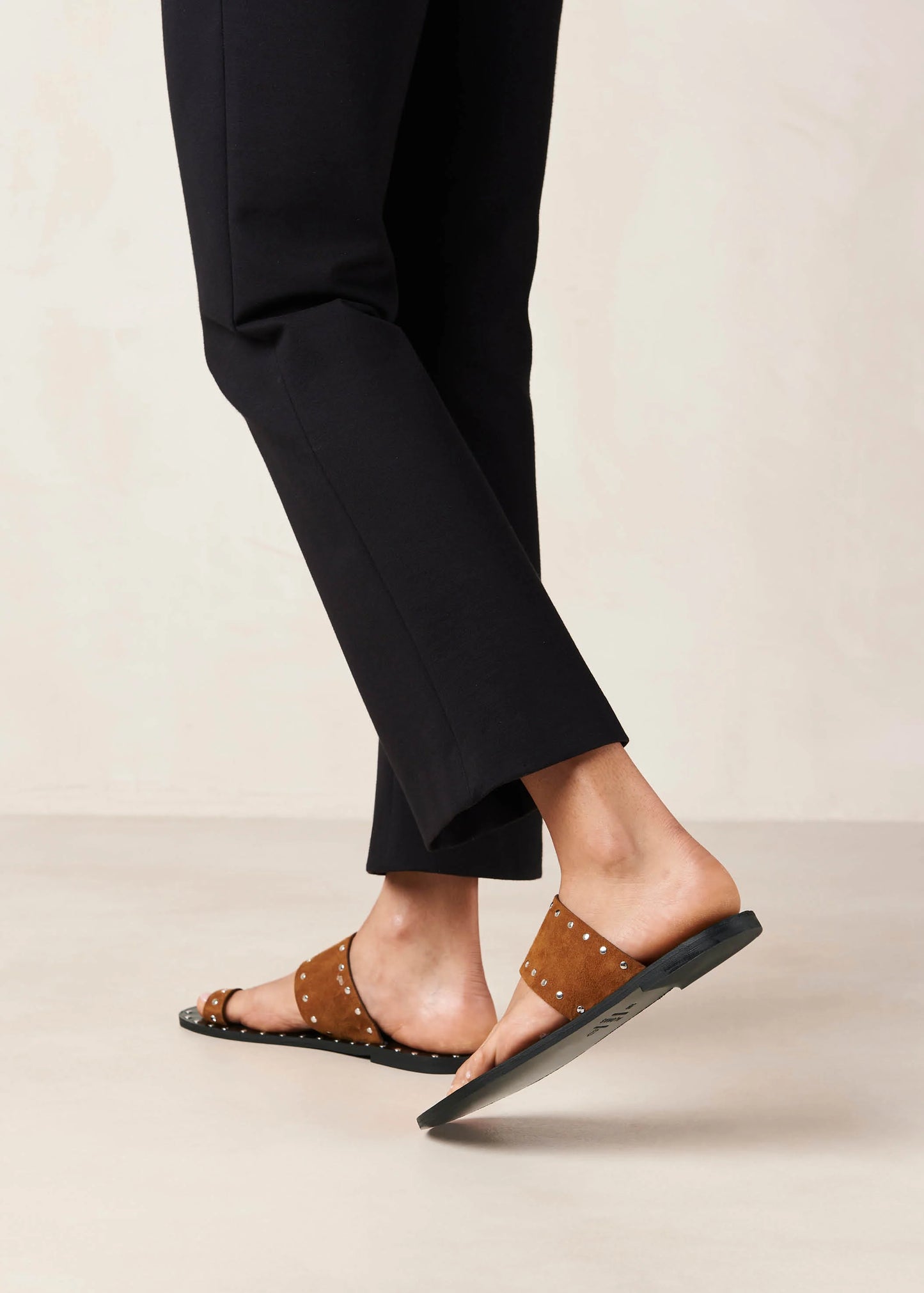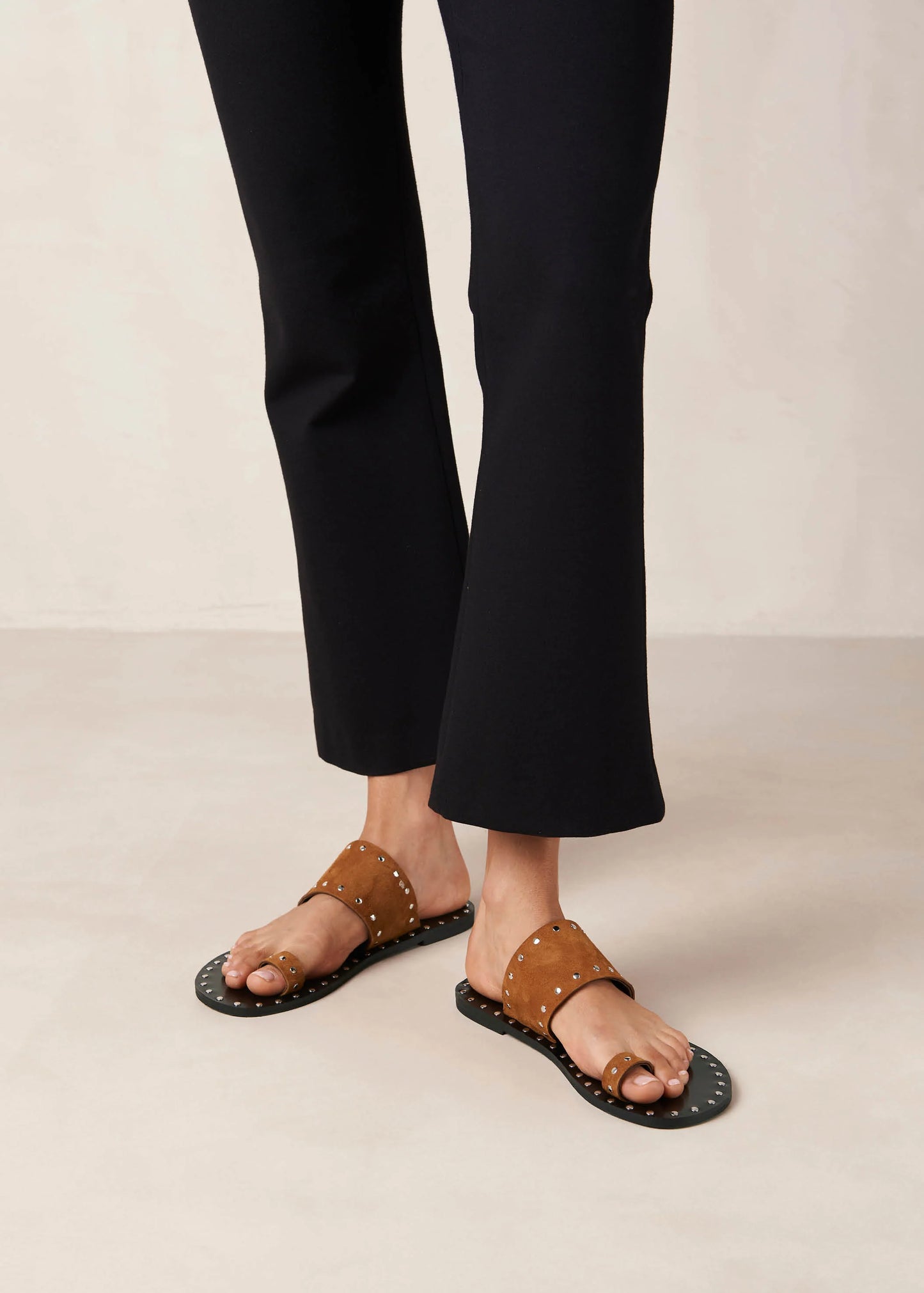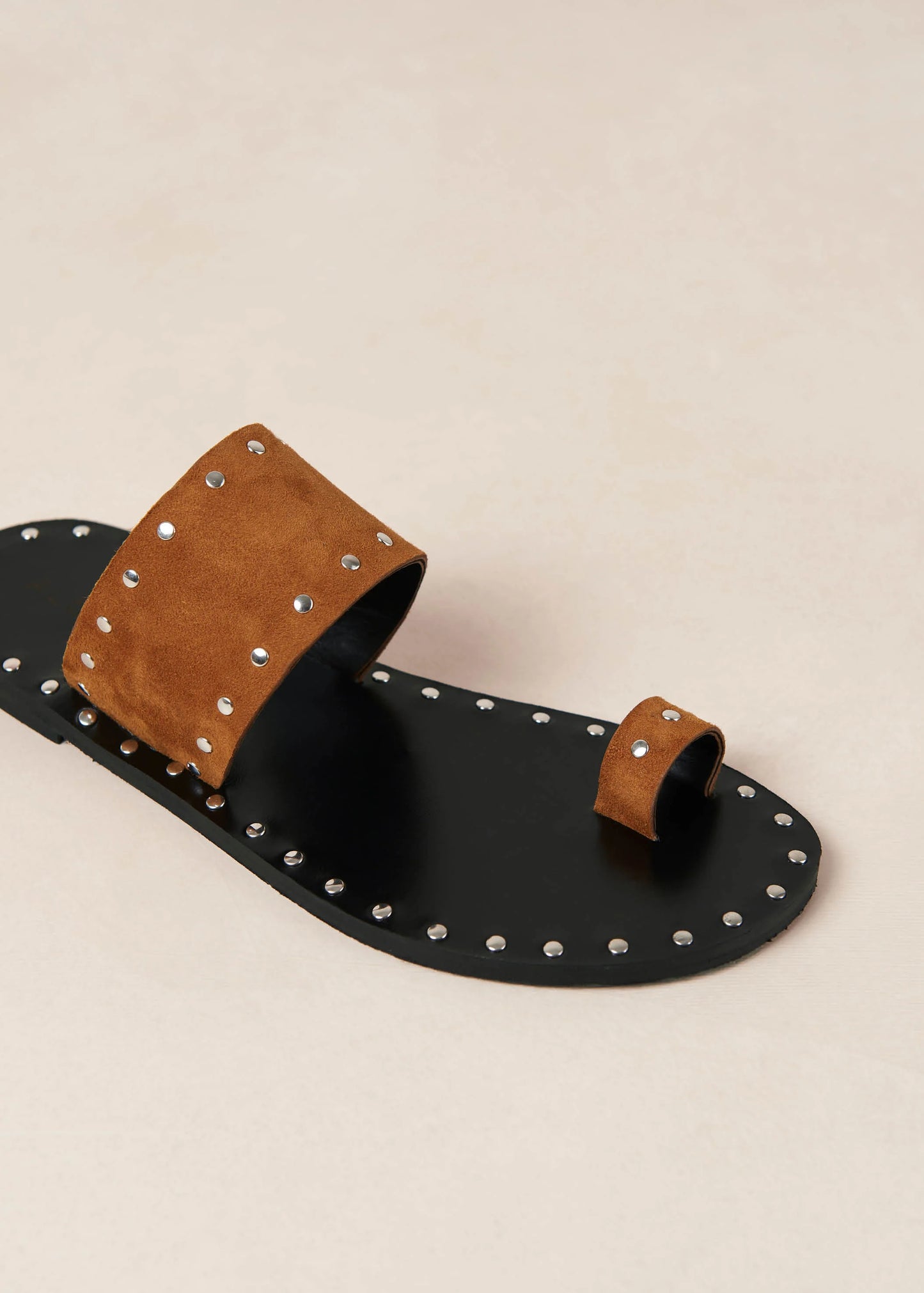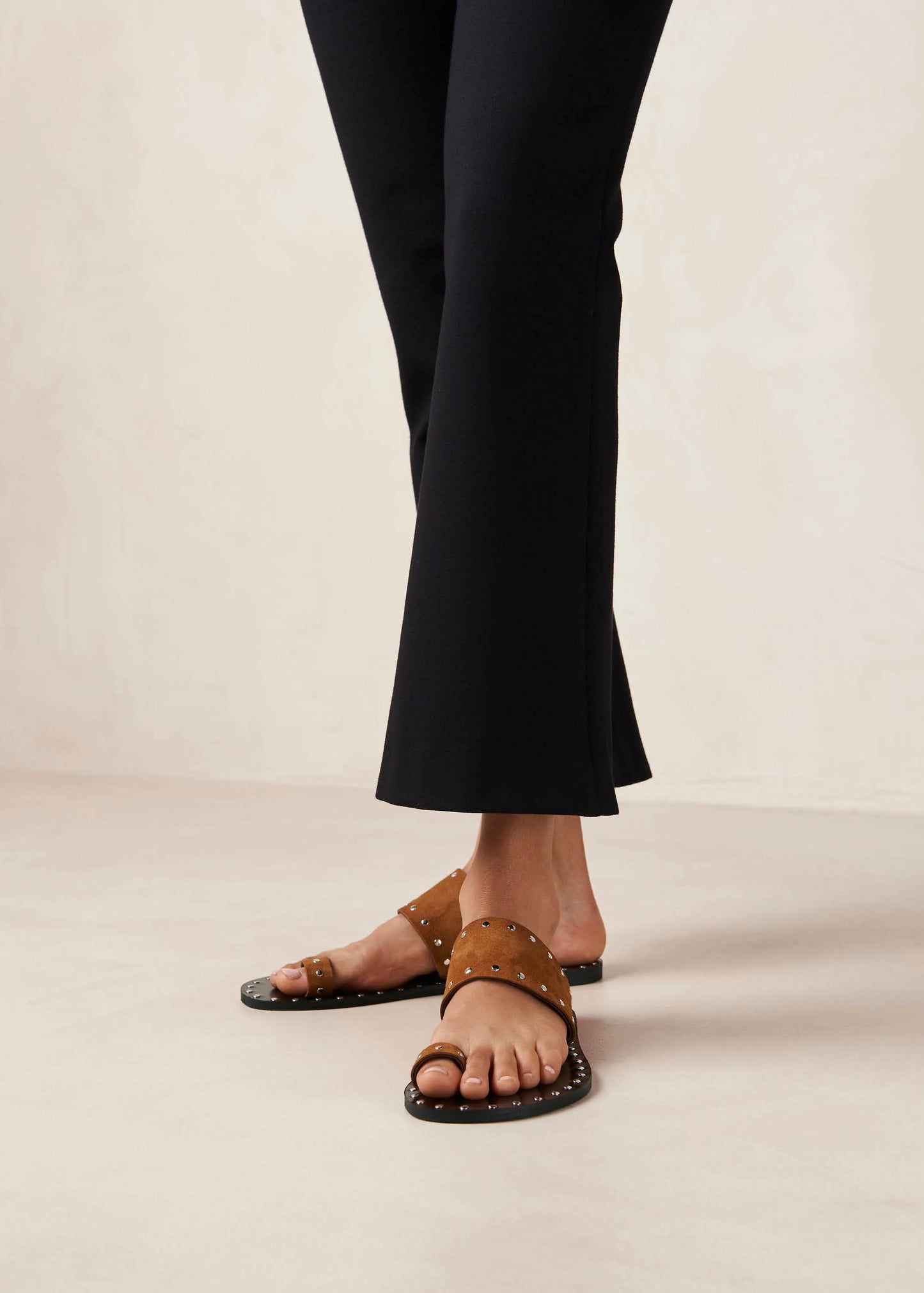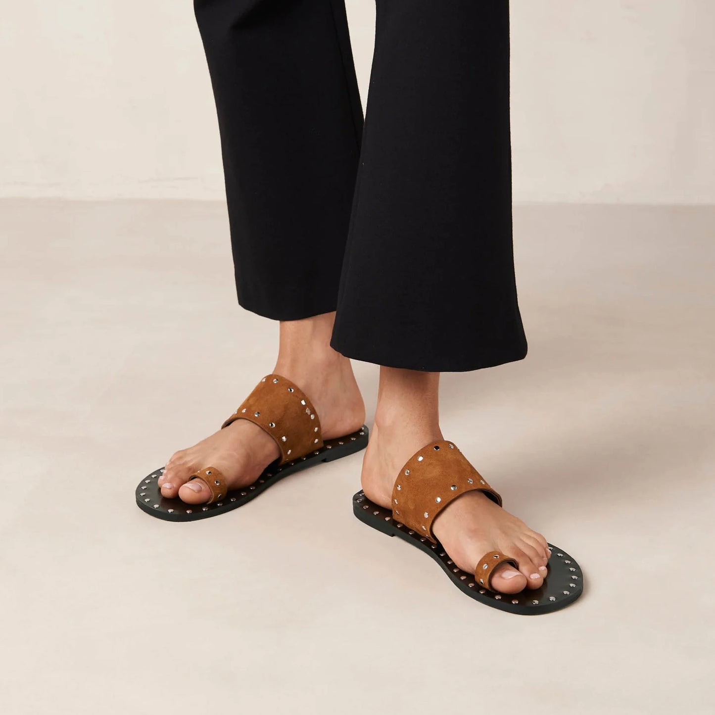 כפכפים לנשים מבית המותג אלוהס. בגזרה שטוחה, עם רצועה עבה מרכזית מזמש ורצועה קטנה לבוהן, עם ניטים כסופים במסגרת וברצועות .עשויים מעור.