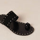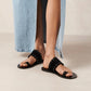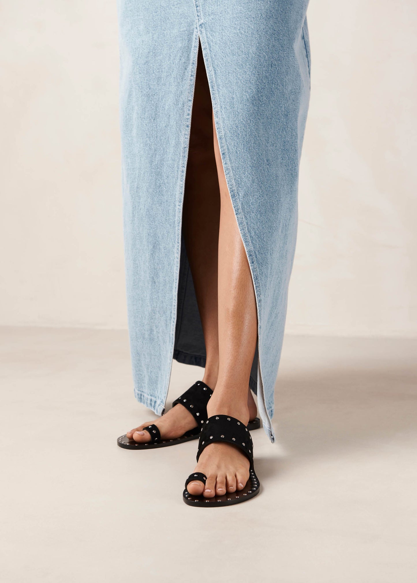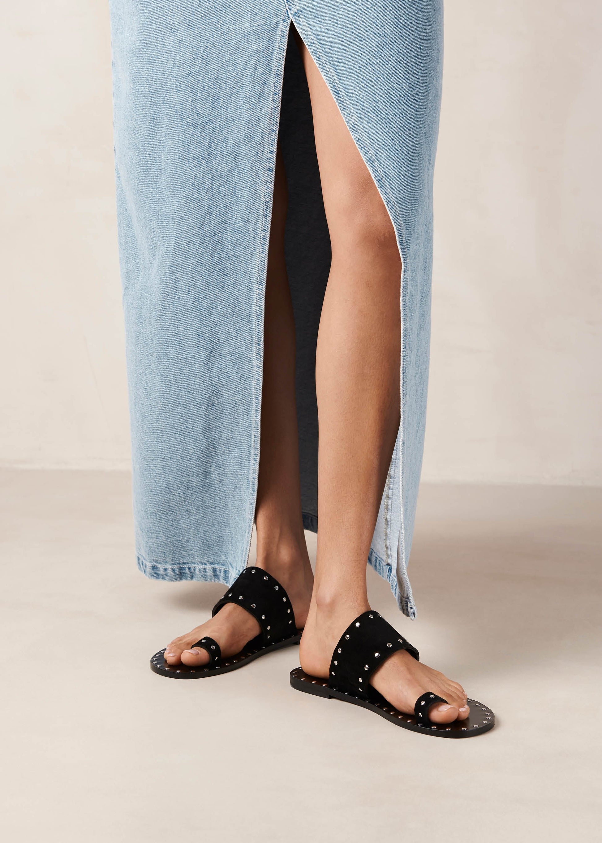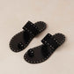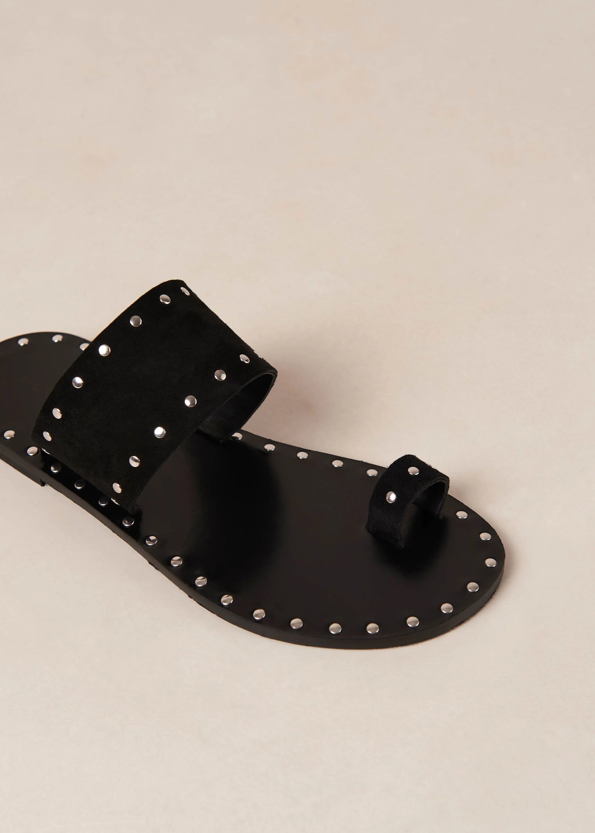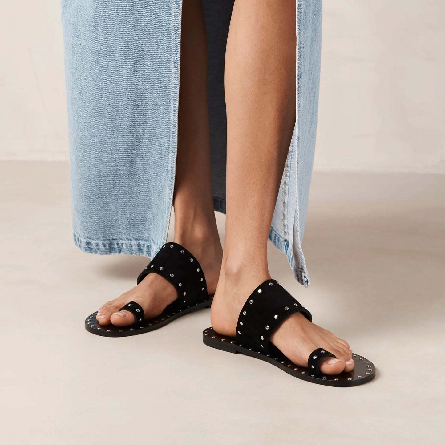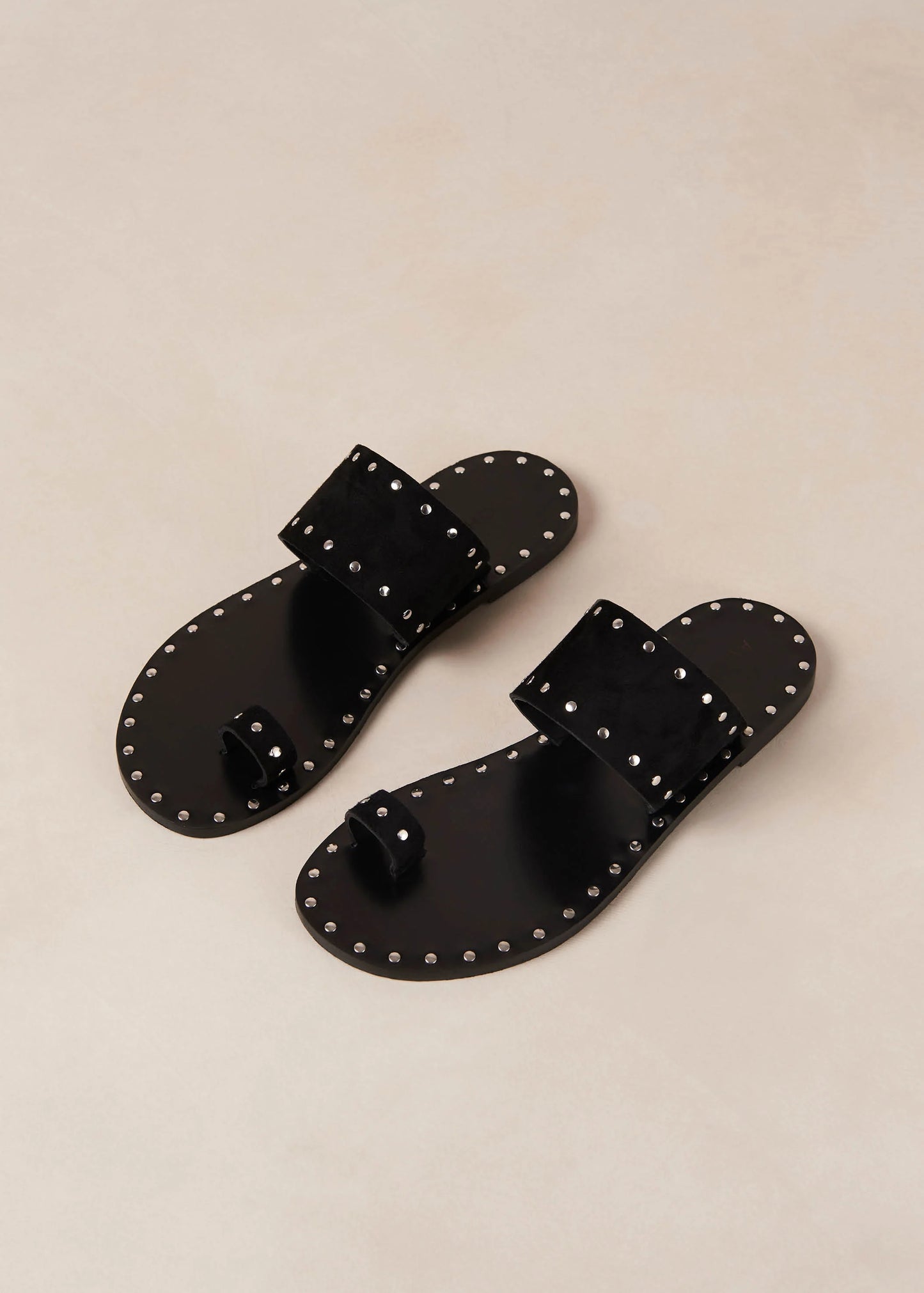 כפכפים לנשים מבית המותג אלוהס. בגזרה שטוחה, עם רצועה עבה מרכזית מזמש ורצועה קטנה לבוהן, עם ניטים כסופים במסגרת וברצועות .עשויים מעור.