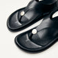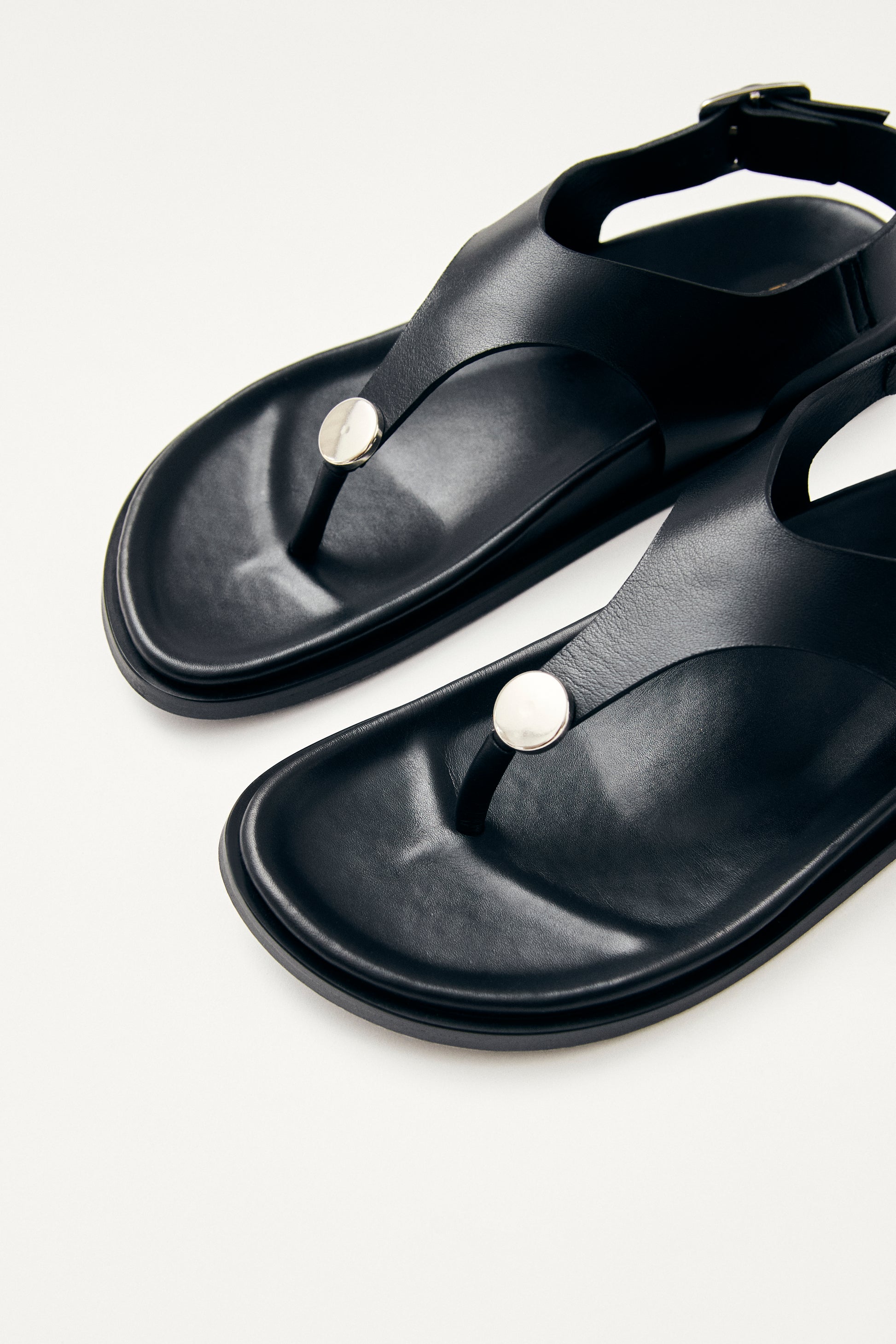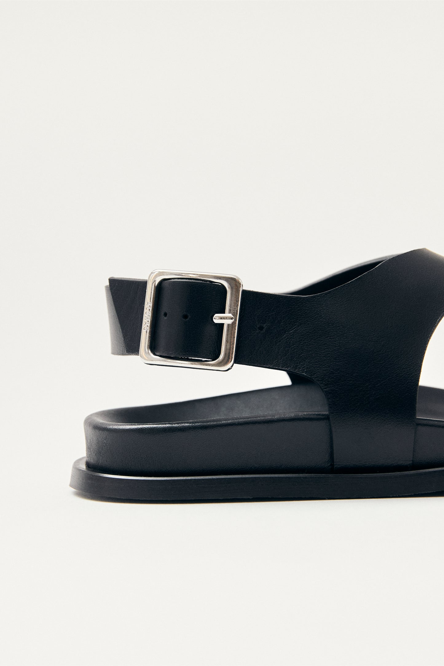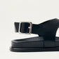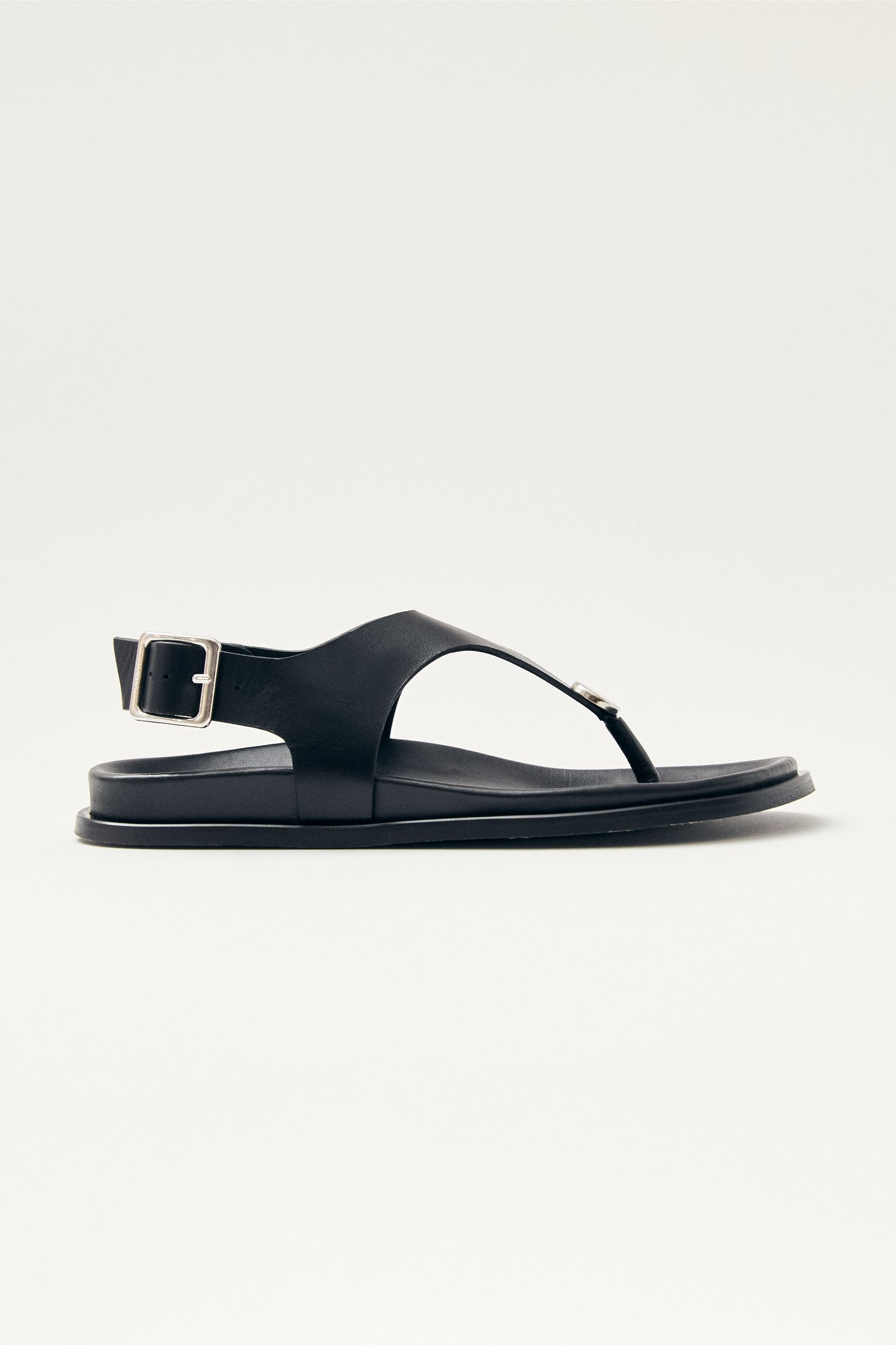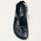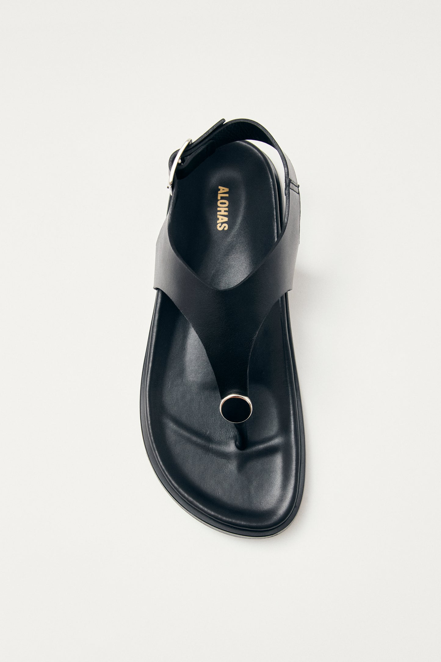 סנדלים לנשים מבית המותג אלוהס. סנדל אצבע שטוח, עם רצועת עור רחבה וטבעת כסופה במרכז ואבזם סגירה בצד.