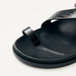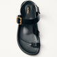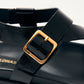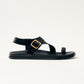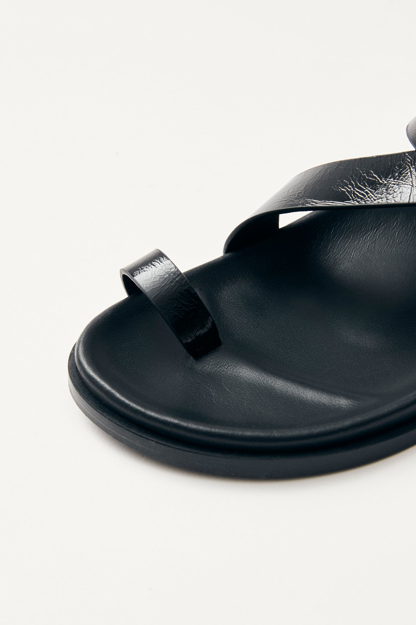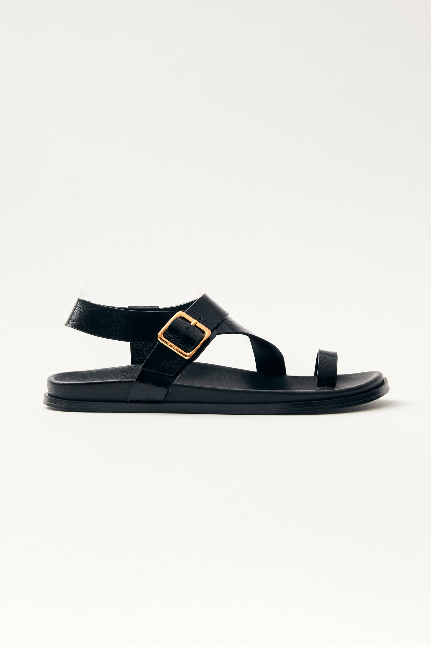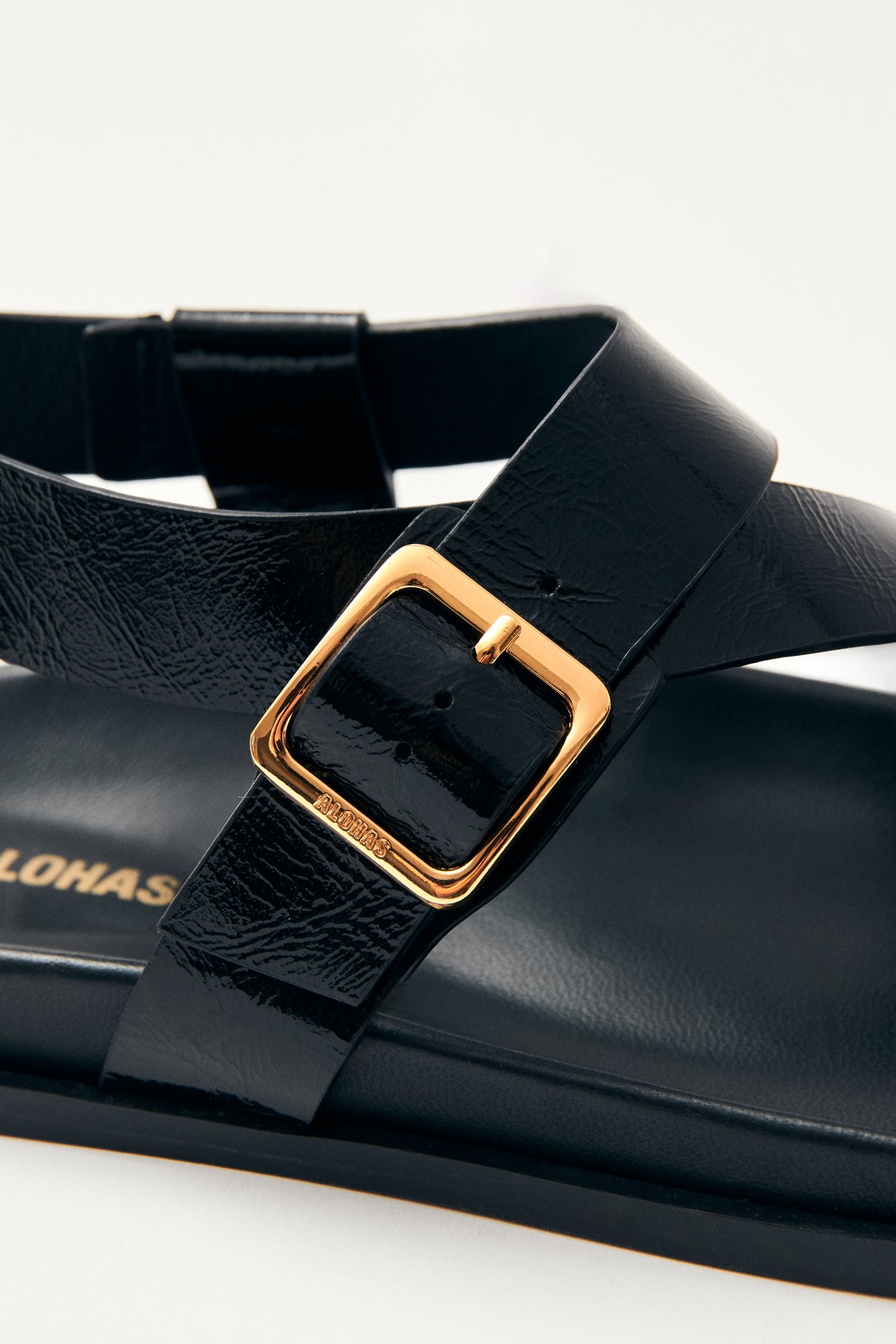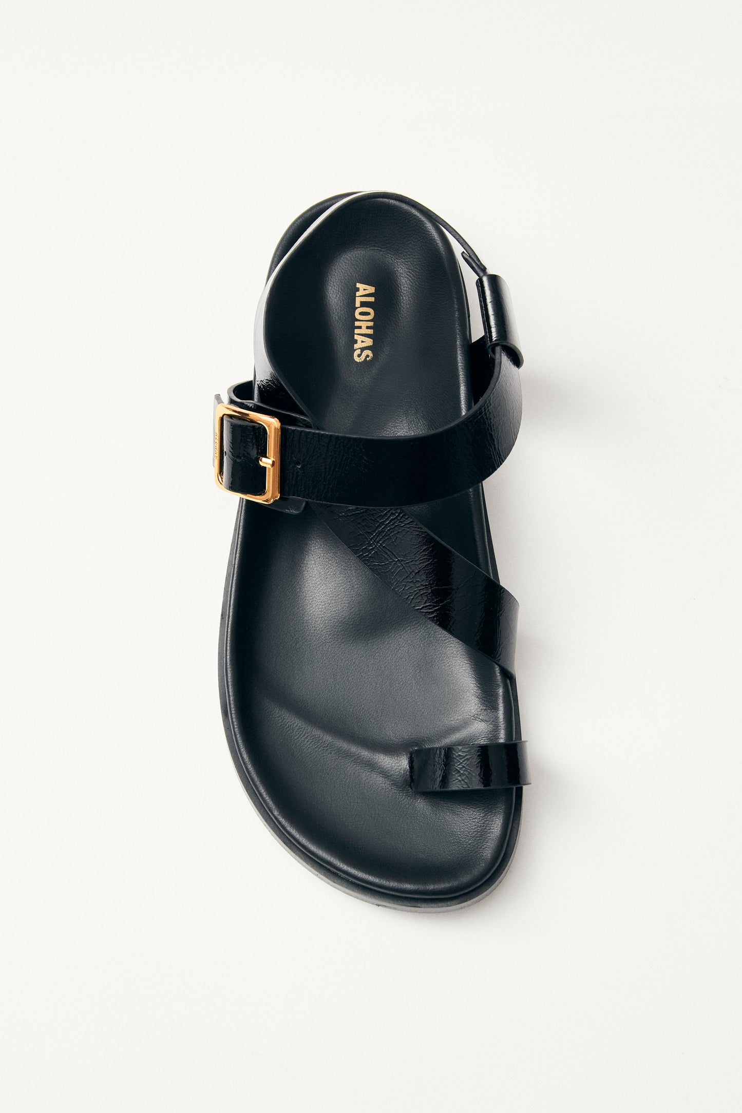 סנדלים לנשים מבית המותג אלוהס. עם רצועות עור שחורות בגימור מבריק, אבזם מוזהב בצד הניתן להתכווננות.
