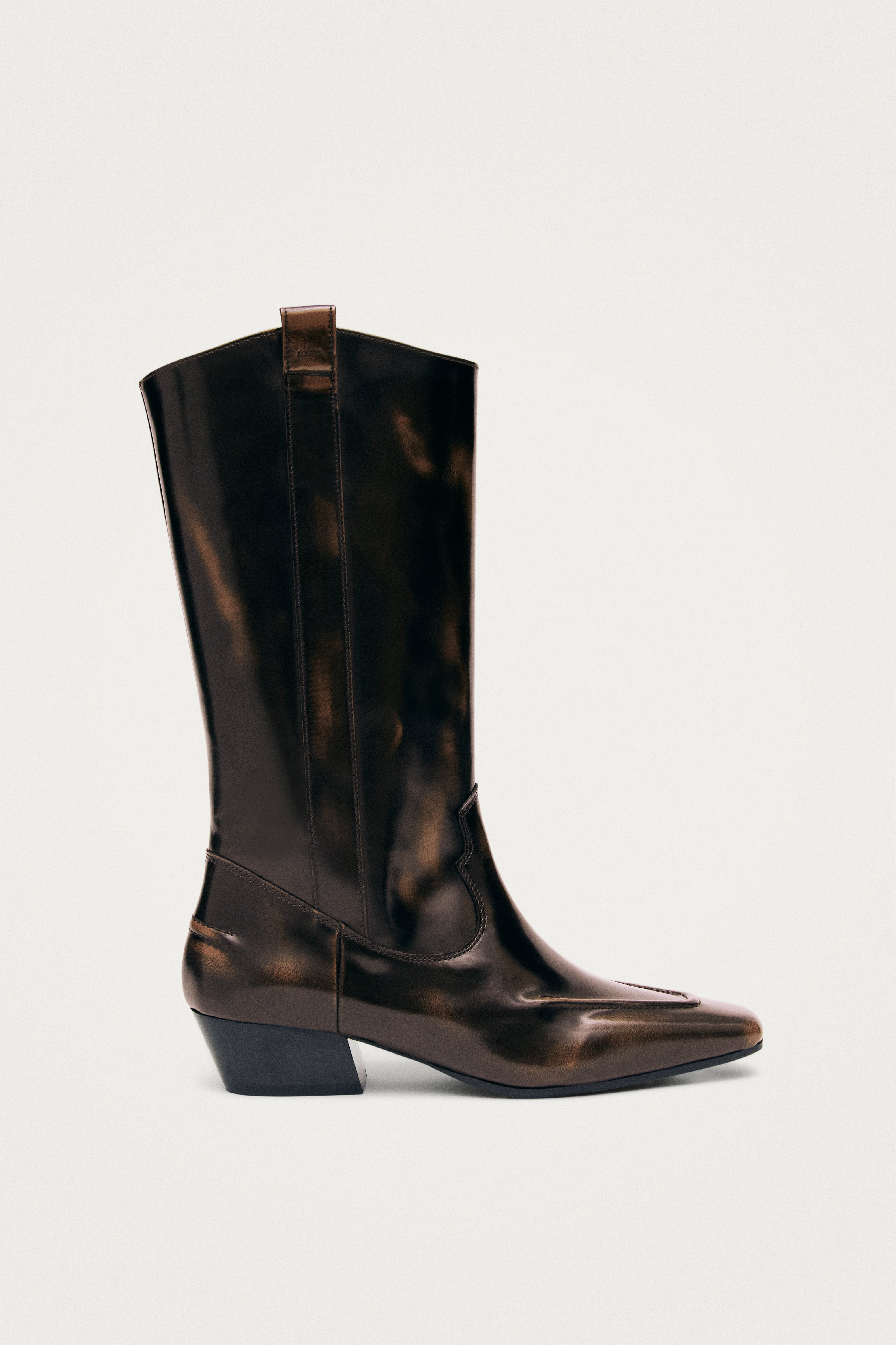מגפיים לנשים מבית המותג אלוהס. עשויים עור חום מוברש בגימור עשיר ועמוק, עם עקב בינוני וחרטום מעוצב בגזרה מחודדת שמעניקים מראה רוקיסטי-אלגנטי.