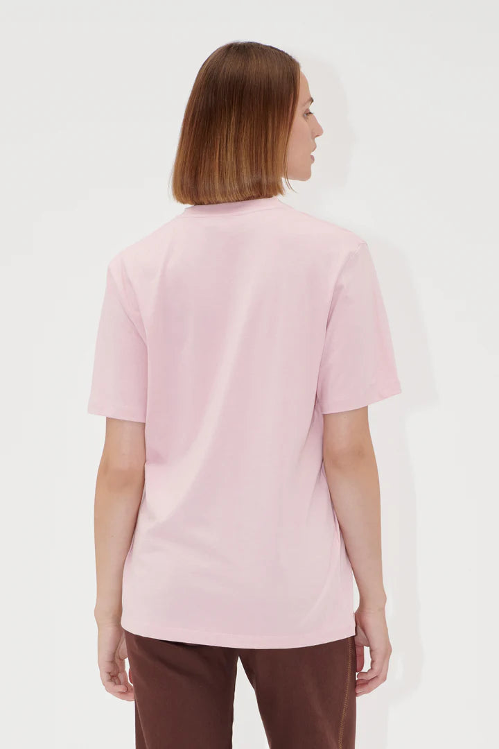 טי שירט קצרה לנשים מבית המותג סטינה גויה. בגזרת בוקסי משוחררת עם מפתח עגול גבוה, שרוולים קצרים והדפס של שם המותג בפרונט.