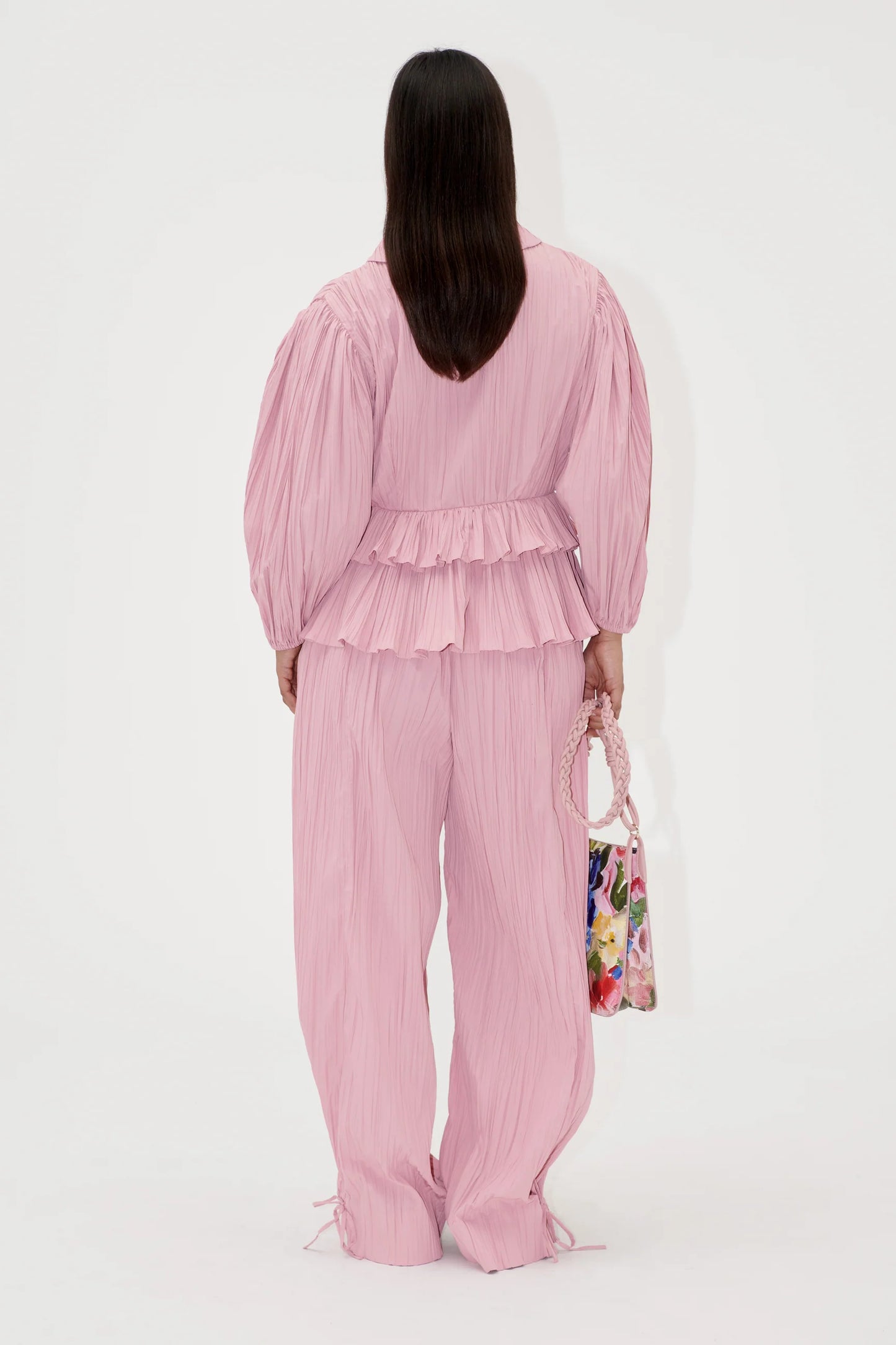 מכנסיים ארוכים לנשים מבית המותג סטינה גויה. בגזרה משוחררת היושבת גבוה במותן, מבד בסגנון פליסה. עם גומי במותן, ודיטיילס קשירה במותן ובסיומת.