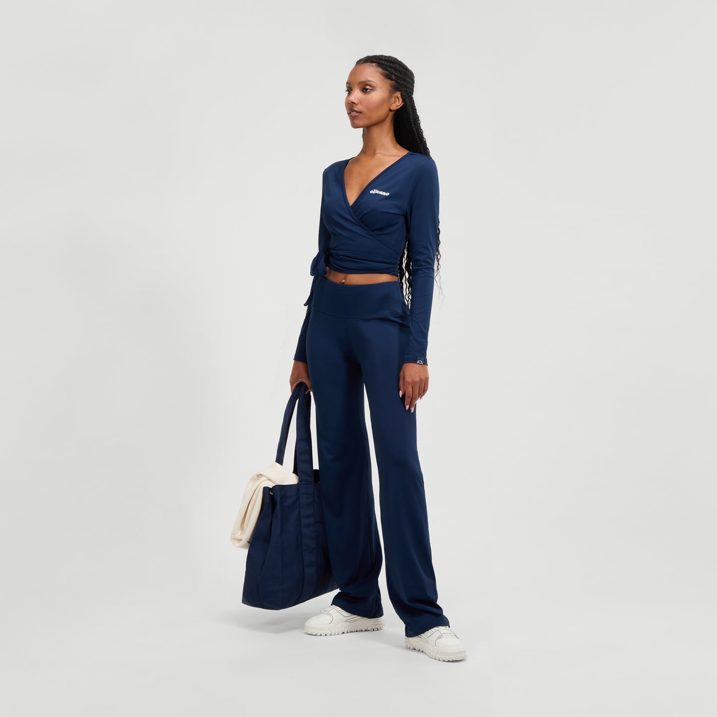 חולצת מעטפת ארוכה לנשים בגזרת קרופ צמודה, עם מפתח וי, קשירה במותן, שרוולים ארוכים ולוגו המותג מוטבע בצד החזה.