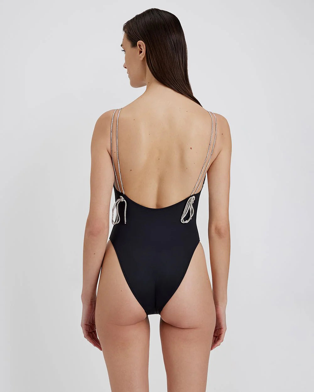 בגד ים שלם לנשים מבית המותג Solid & Striped. בגזרה צמודה עם מפתח וי עמוק, וחיתוך גבוה. בשילוב גב פתוח, וכתפיות מטאליות בסיומת קשירה.