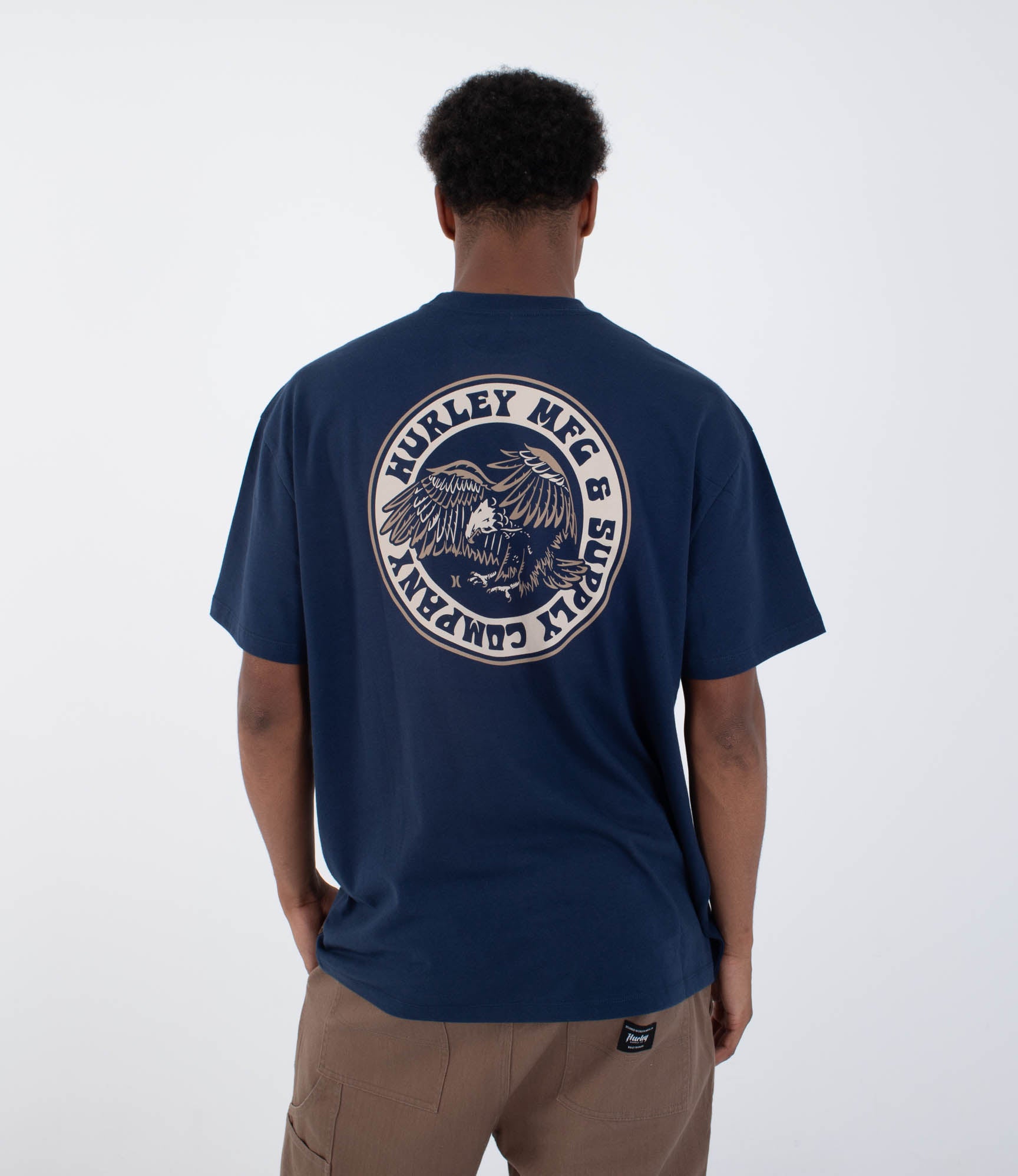 טי שירט קצרה לגברים מבית המותג הארלי. בגזרה רגילה עשויה כותנה רכה, עם פרינט עגול קטן בחזית ופרינט גדול ובולט בגב בסגנון גרפי-אמריקאי שנותן לוק מודרני וקליל.